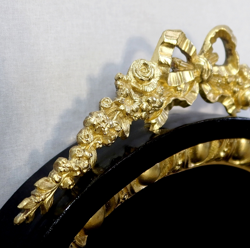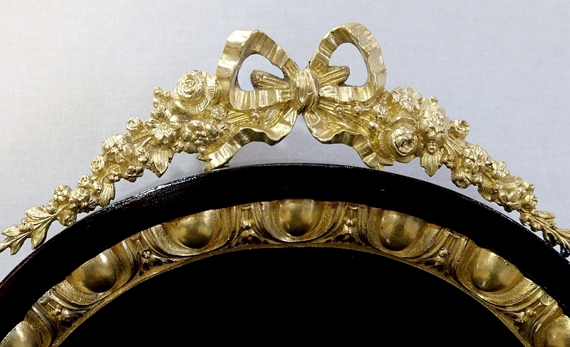 Sur la partie supérieure nous retrouvons un magnifique bronze composé d’un ruban, d’une guirlande de fleurs et de feuillage de chaque côté.
