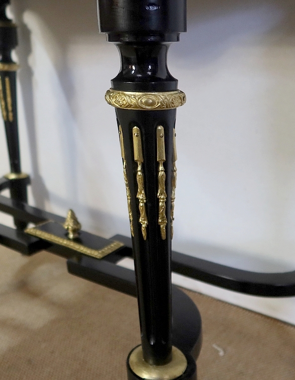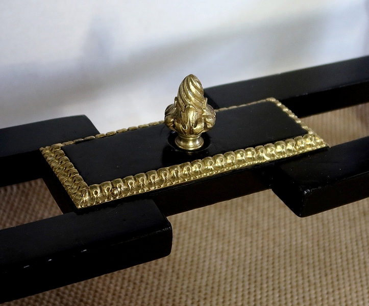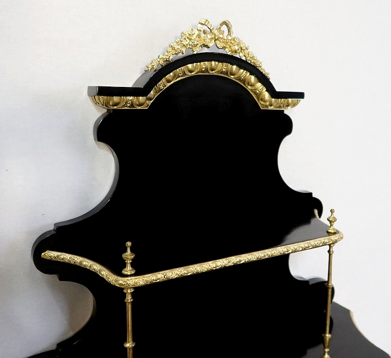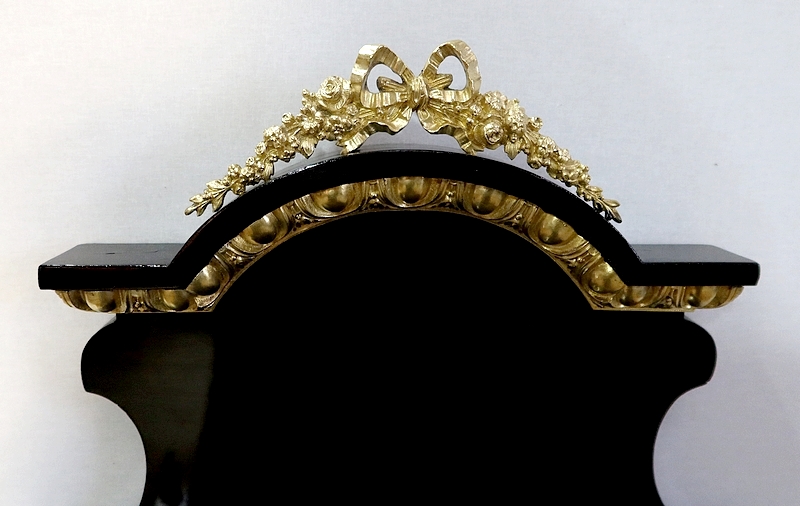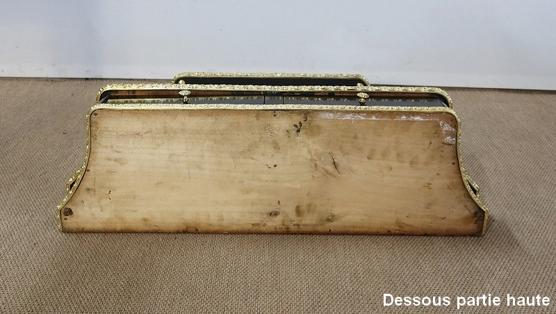 Deux petites toupies en bronze finissent le dessus de ces colonnettes. Le fronton du panneau arrière est en chapeau de gendarme avec en dessous une importante moulure en bronze godronné.