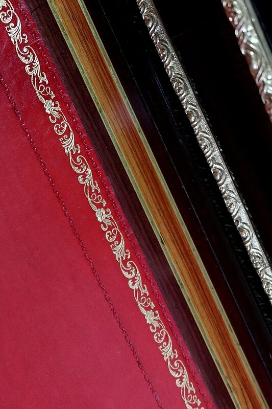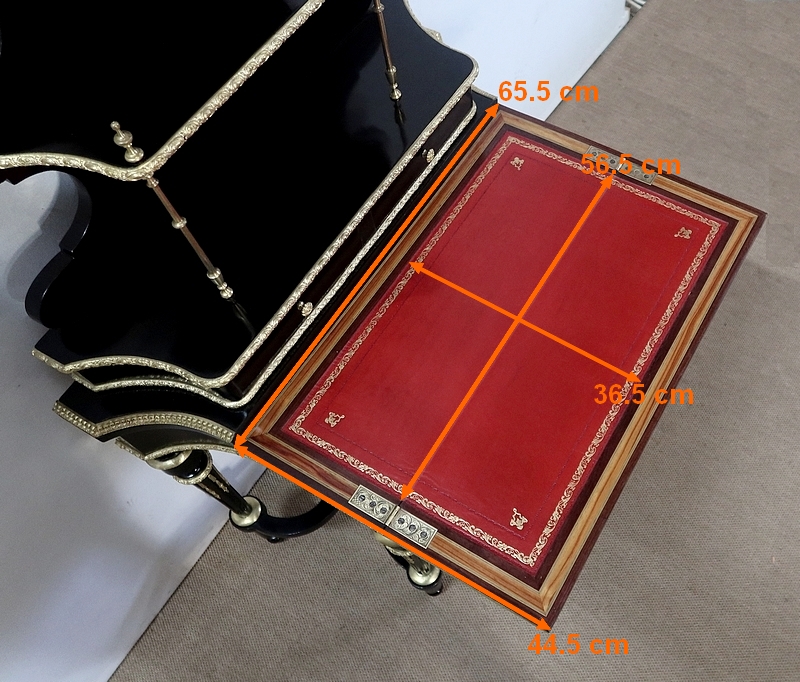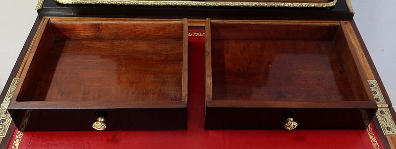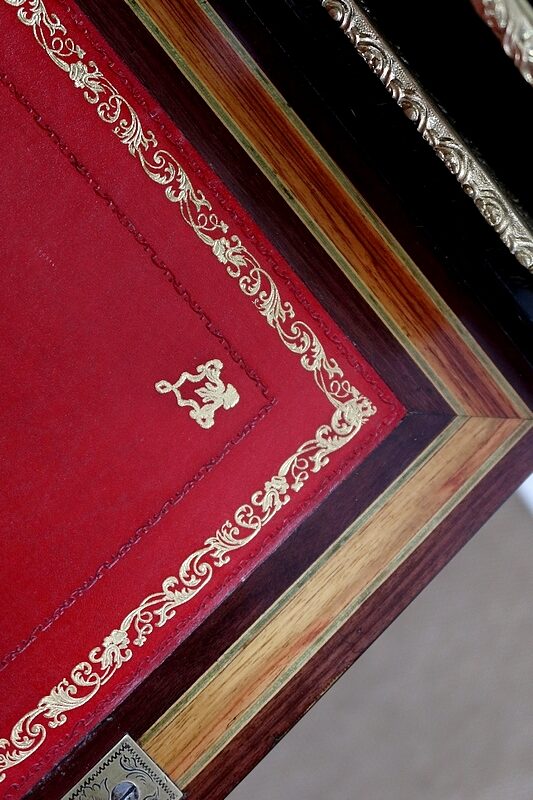 En partie intérieure, ce mobilier présente un cuir rouge actuel composé de vignettes à froid, vignettes dorées et motifs d’angles dorés. Le dessus repose, pour sa stabilité, sur un tiroir en ceinture doté d’une magnifique entrée en bronze enrubannée. La serrure et la clé sont d’origine et en parfait état de fonctionnement.