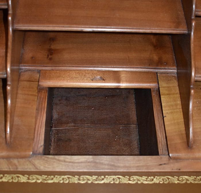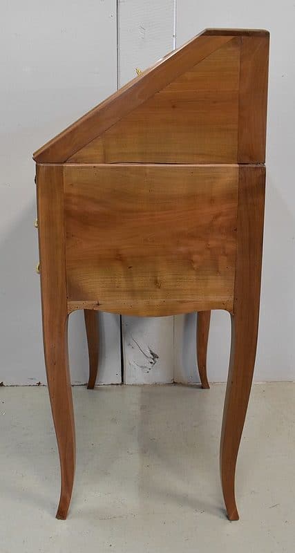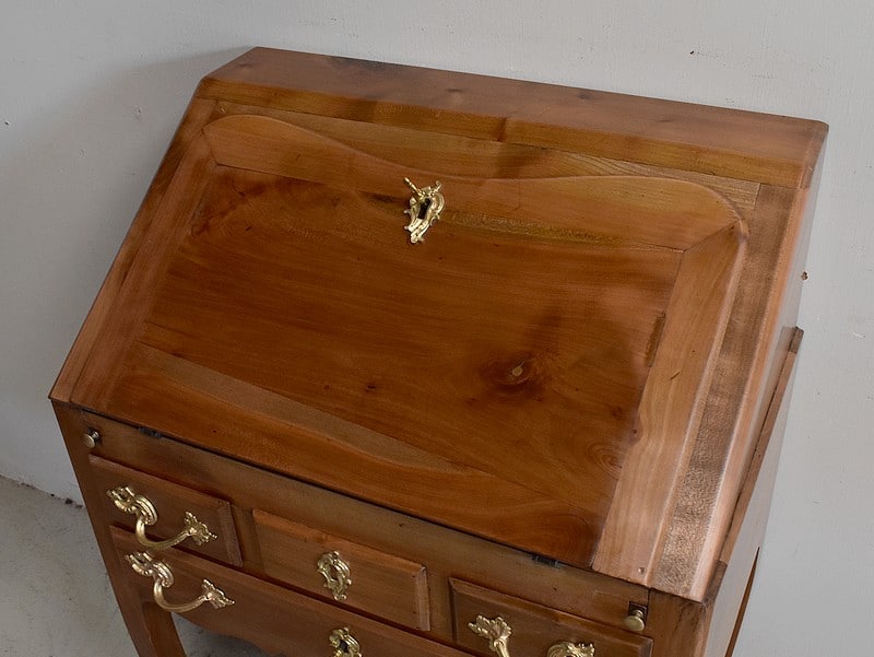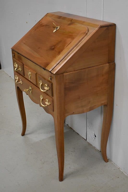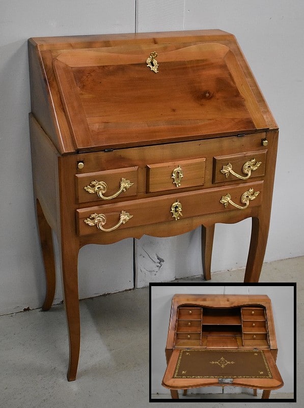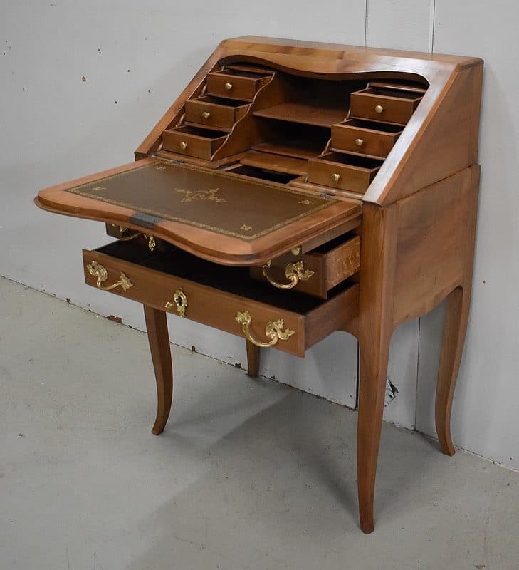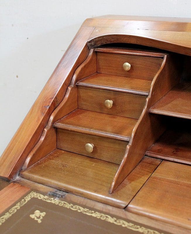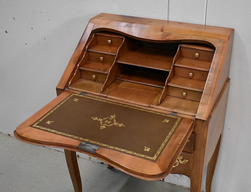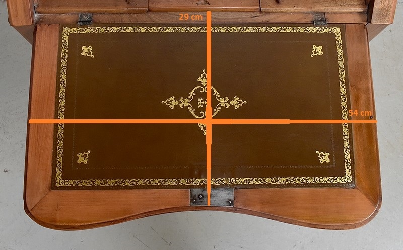 Petit Bureau Dos d’Âne en Merisier massif, ouvrant par définition par un plan incliné. Ce dernier découvre un intérieur composé au milieu de deux niches et d’un compartiment dissimulé par un couvercle coulissant. De part et d’autre, on dispose de deux rangées de trois tiroirs organisés en Gradin. Tous sont pourvus d’un bouton de tirage Laiton. L’abattant une fois déplié est soutenu dans sa position horizontale par deux tirettes rétractables. L’espace Écritoire ainsi disponible est garni d’un Joli Cuir actuel Vert Patiné, avec Vignette Centrale, Fleurons d’angles et Frises Dorés. On précisera que cette partie Secrétaire se verrouille puisque l’abattant est pourvu d’une entrée en Laiton Découpé et d’une serrure en état de fonctionnement.