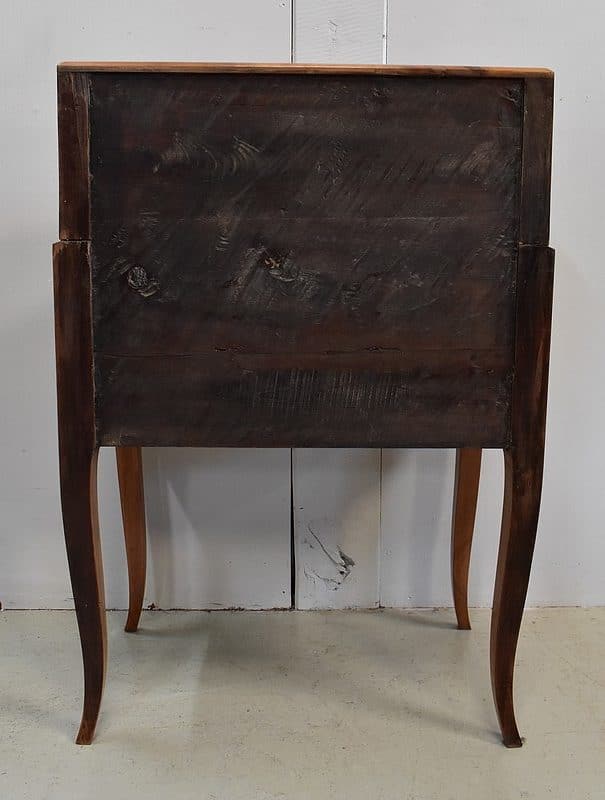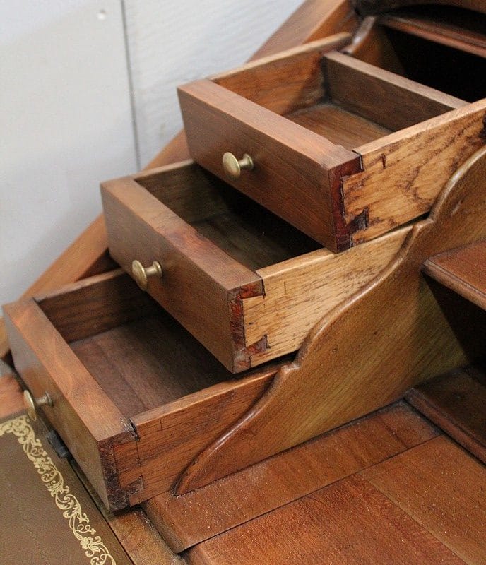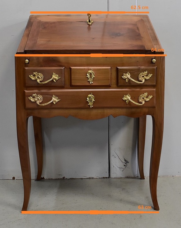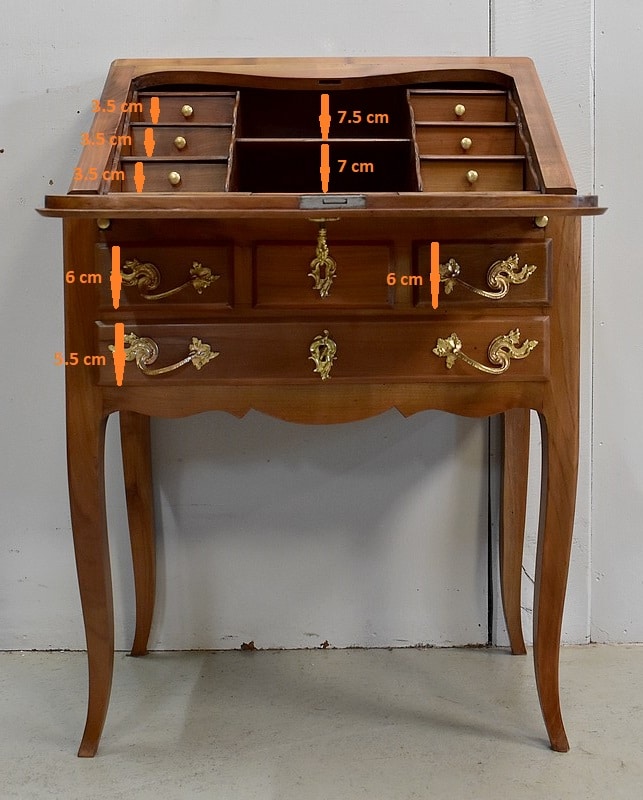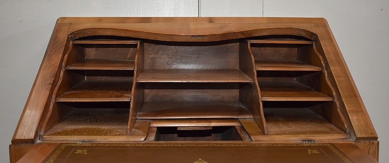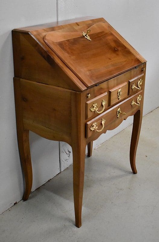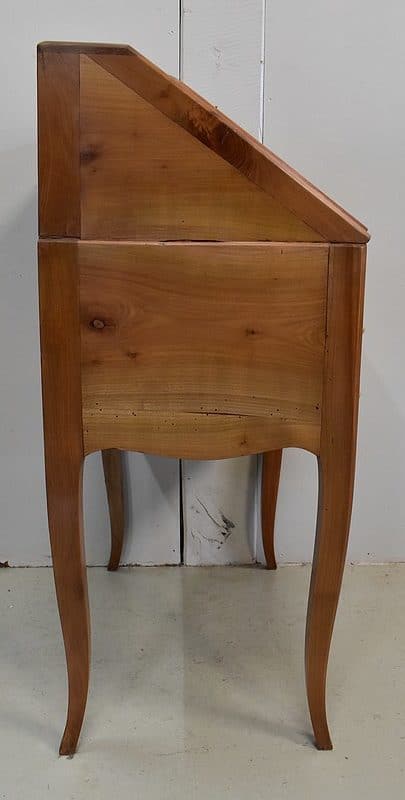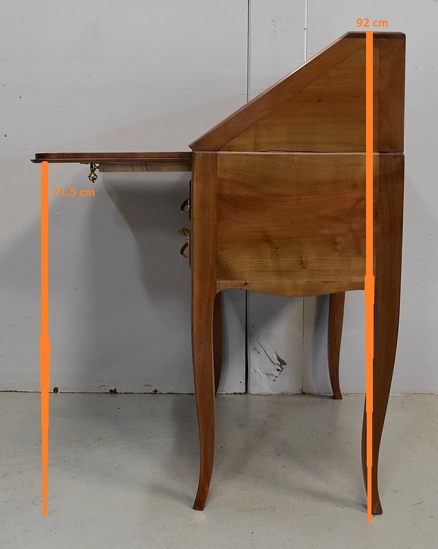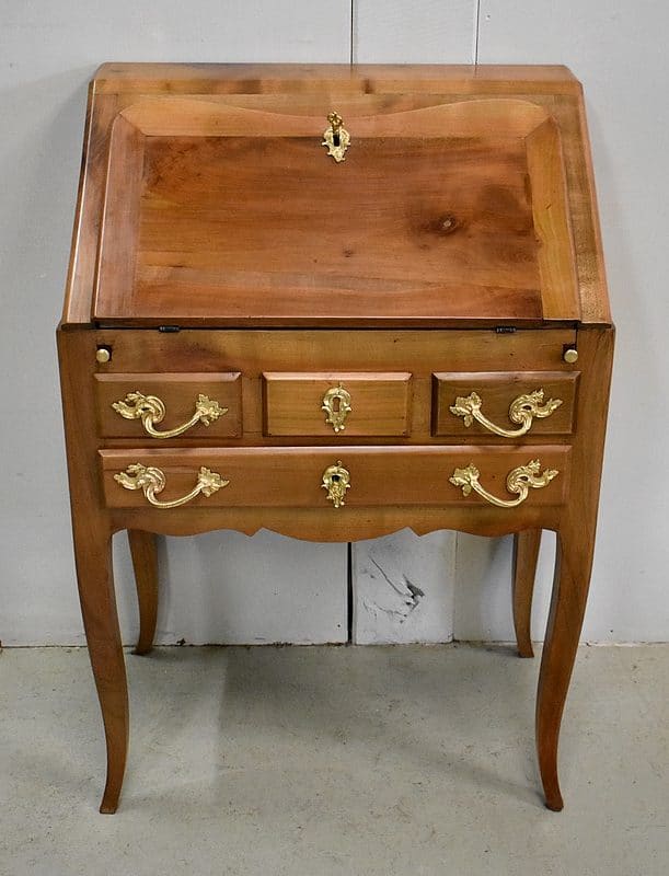 Petit Bureau Dos d’Âne en Merisier massif, ouvrant par définition par un plan incliné. Ce dernier découvre un intérieur composé au milieu de deux niches et d’un compartiment dissimulé par un couvercle coulissant. De part et d’autre, on dispose de deux rangées de trois tiroirs organisés en Gradin. Tous sont pourvus d’un bouton de tirage Laiton. L’abattant une fois déplié est soutenu dans sa position horizontale par deux tirettes rétractables. L’espace Écritoire ainsi disponible est garni d’un Joli Cuir actuel Vert Patiné, avec Vignette Centrale, Fleurons d’angles et Frises Dorés. On précisera que cette partie Secrétaire se verrouille puisque l’abattant est pourvu d’une entrée en Laiton Découpé et d’une serrure en état de fonctionnement.