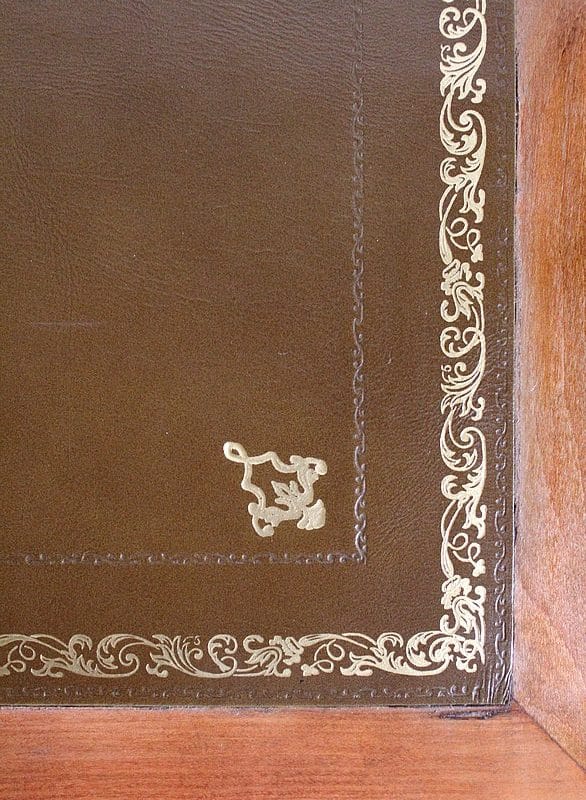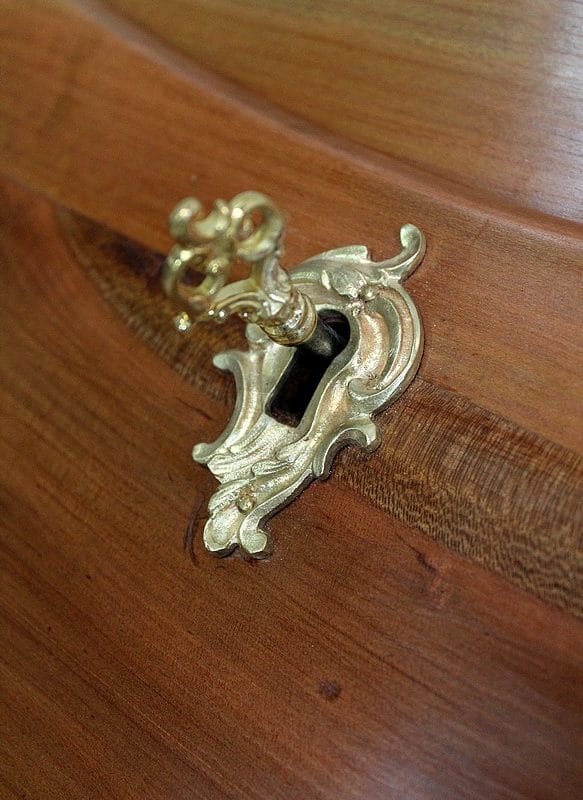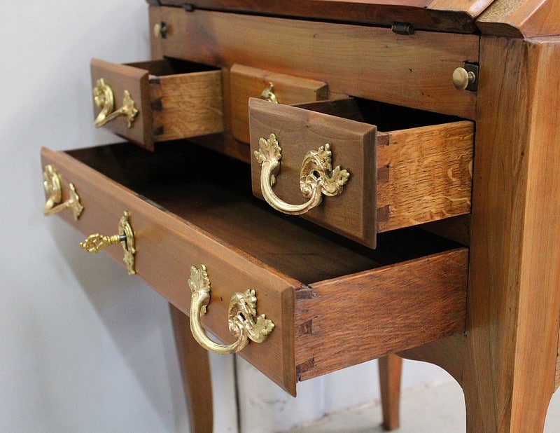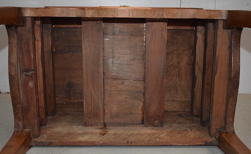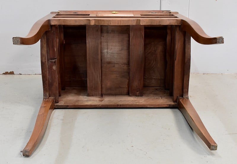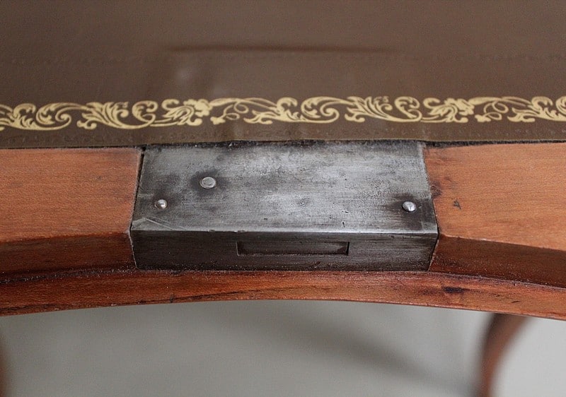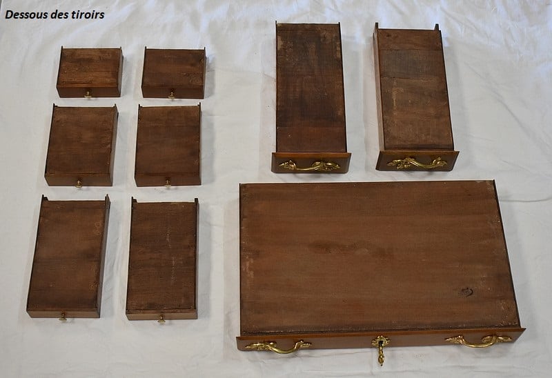 En dessous, ce Bureau offre trois tiroirs dotés de poignées Rocaille et agencés sur deux rangs. Les deux premiers, relativement étroits, sont séparés par un quatrième, factice. Le dernier tiroir, plus long, se verrouille. Tous les Bronzes et serrures sont d’Origine, et le Meuble est fourni avec ses deux clés ajustées.