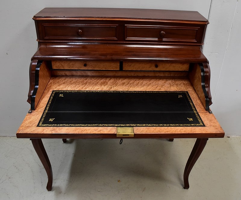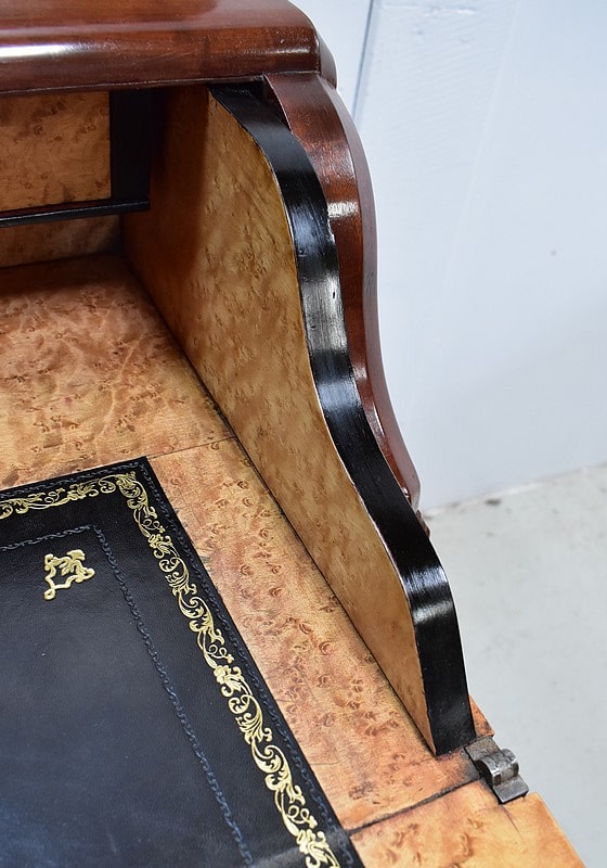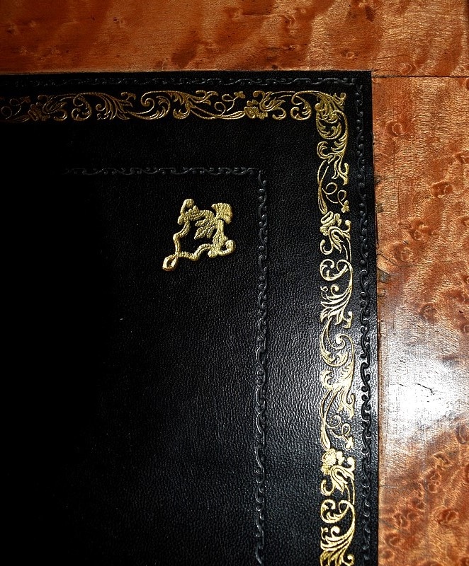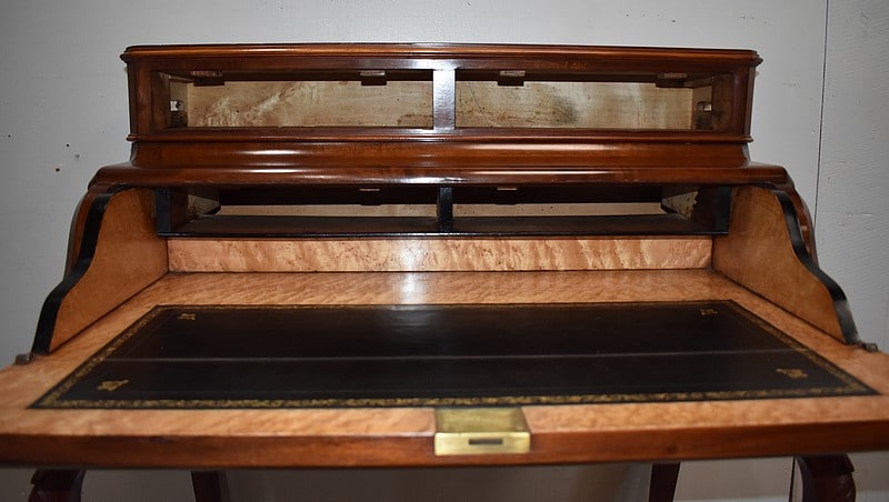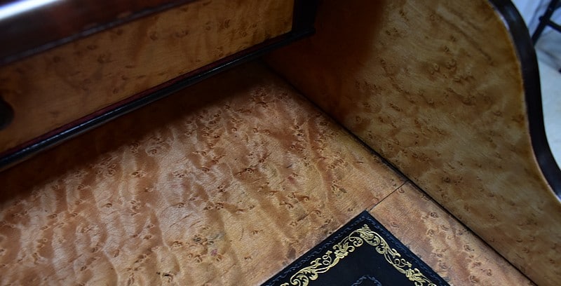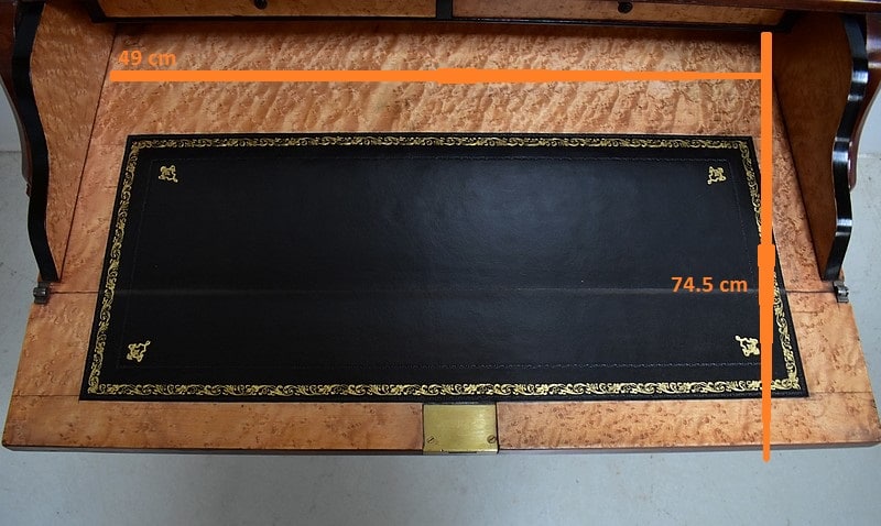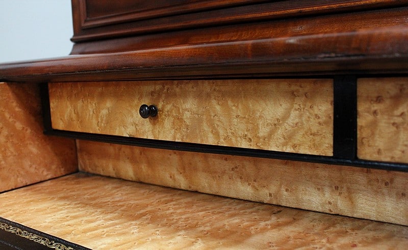 A mi-hauteur, un abattant à Doucine formant écritoire découvre un intérieur en Moucheté d’Érable. Deux petits tiroirs y surplombent une zone de travail recouverte d’un cuir à Fleurons d’angles et de trois frises en bordure, l’une Dorée, les deux autres, plus fines, sur fond dur. Le cuir a été choisi de couleur Noire lors de sa restauration, harmonisant ainsi cet espace dont certains éléments présentent cette même teinte.