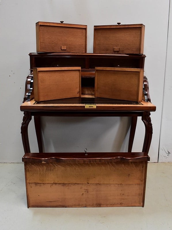 Ce tiroir, tout comme l’abattant décrit plus haut, se verrouillent par des serrures et leurs clés d’origine.