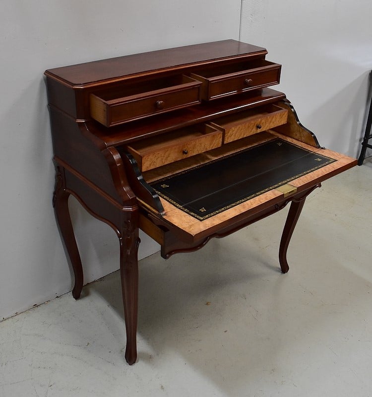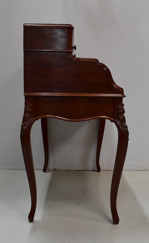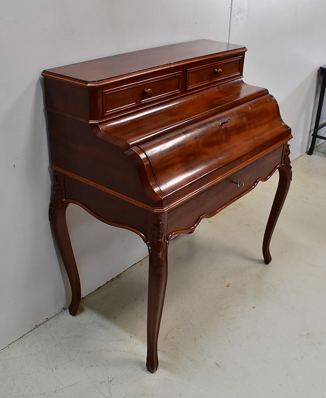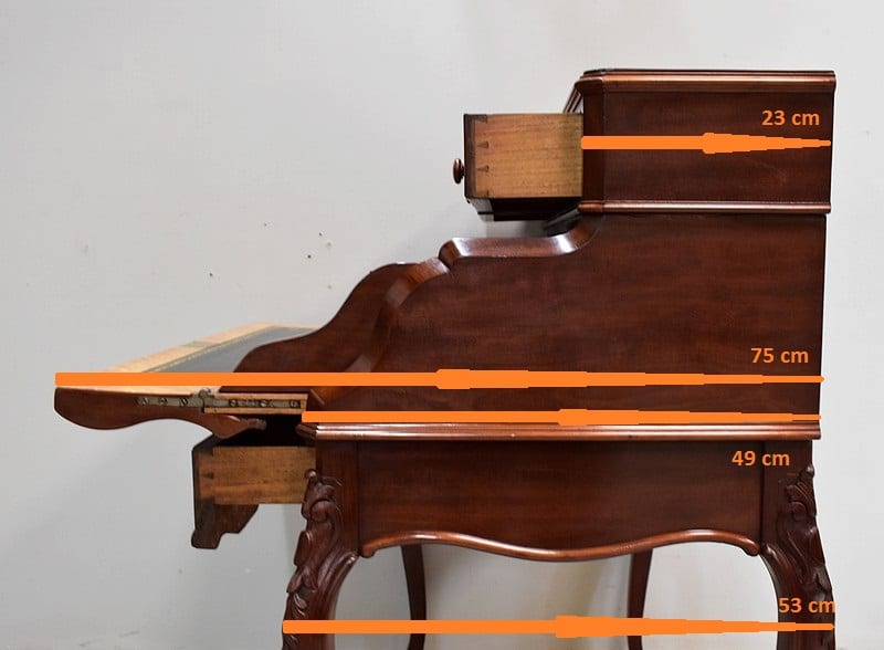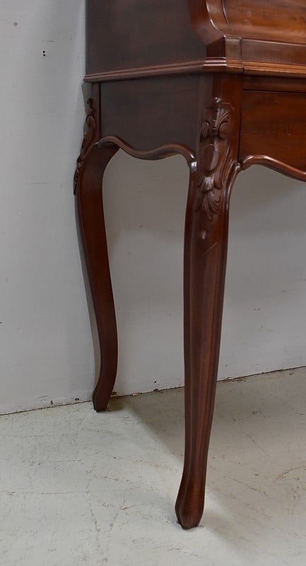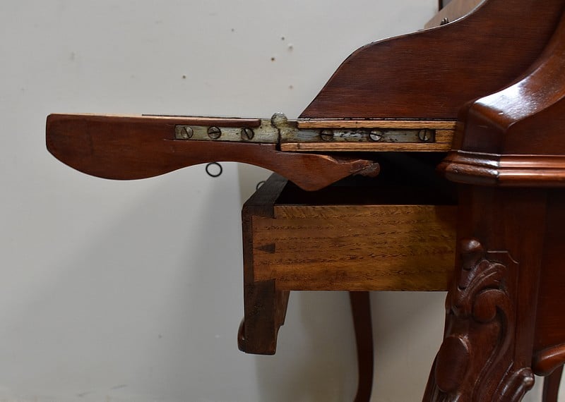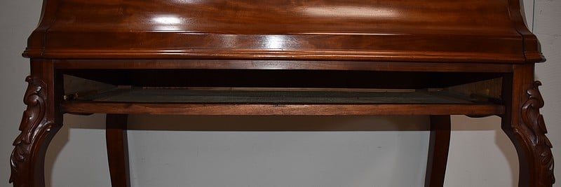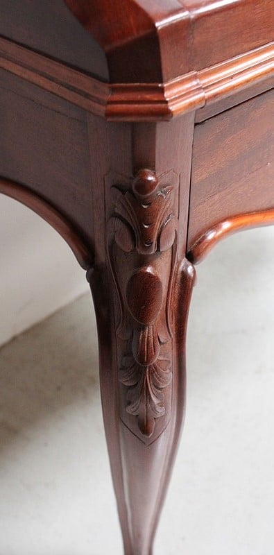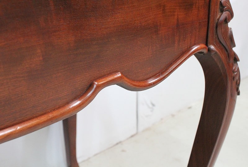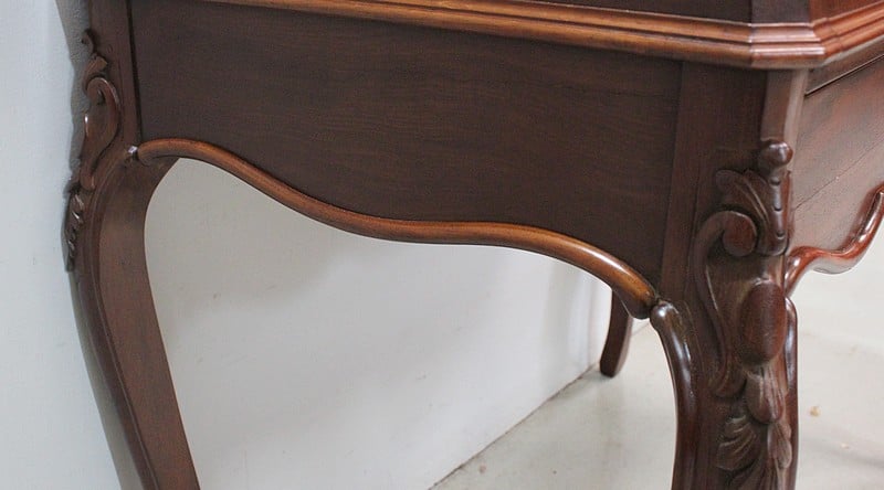 En ceinture, ce Bureau offre un large tiroir, moins profond qu’en apparence, à l’intérieur compartimenté. Il arbore en partie basse une baguette moulurée aux découpes arrondies, ornement que l’on retrouve sur les côtés du meuble.