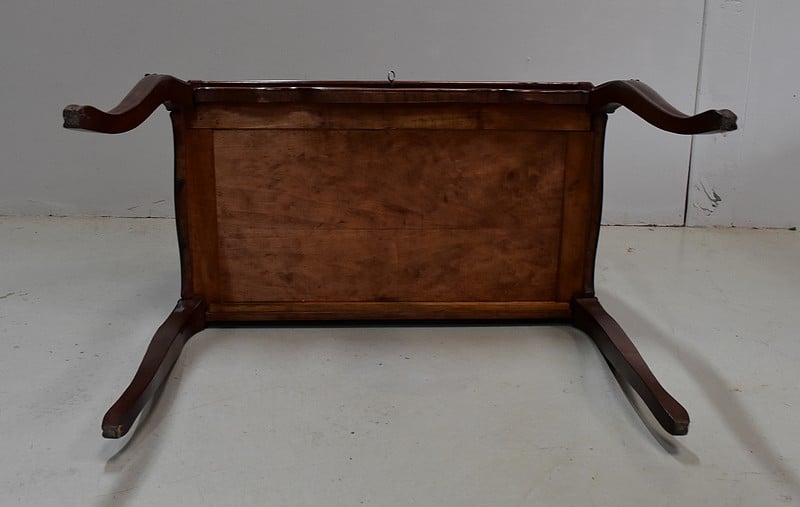 L’ensemble repose sur quatre pieds généreusement galbés, agrémentés sur les parties bombées de décors sculptés.
