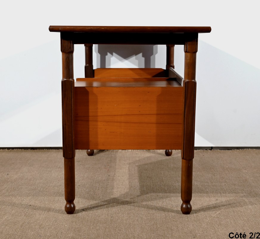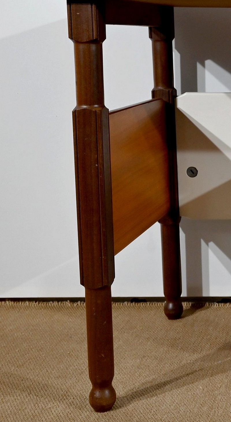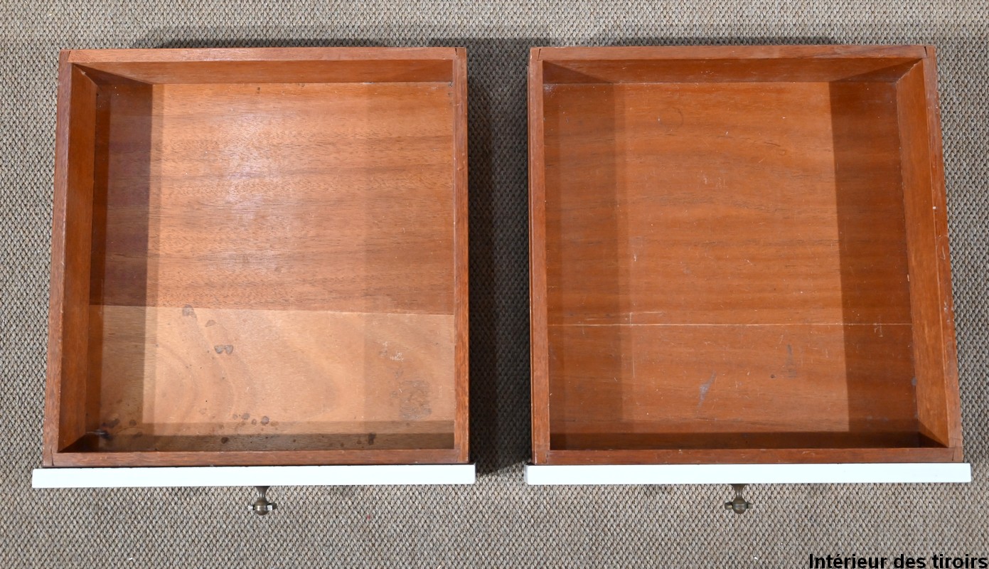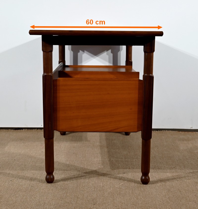 Il présente un plateau, en placage d’acajou, et ouvre par deux tiroirs identiques munis de poignées de tirage en fer.