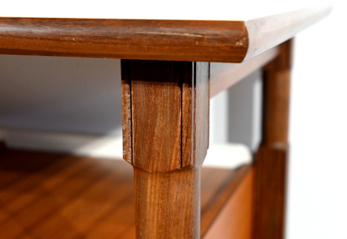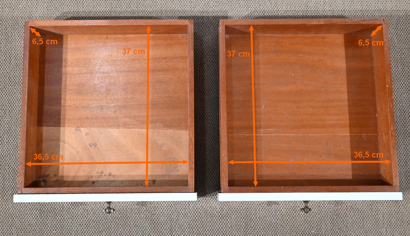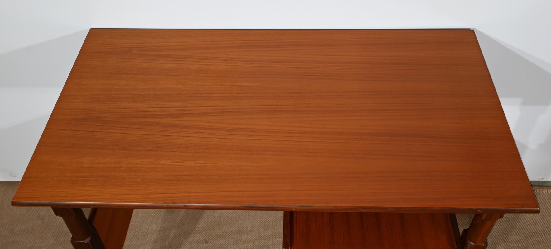 Il présente un plateau, en placage d’acajou, et ouvre par deux tiroirs identiques munis de poignées de tirage en fer.