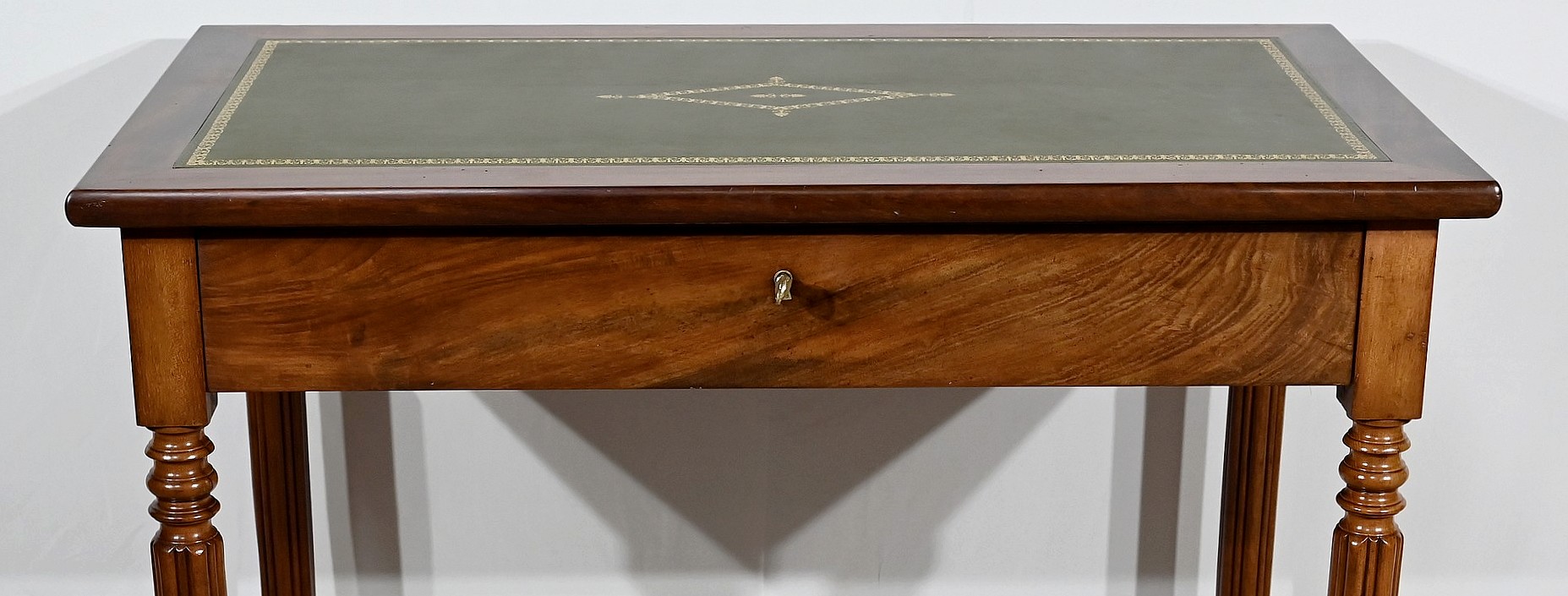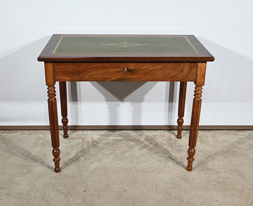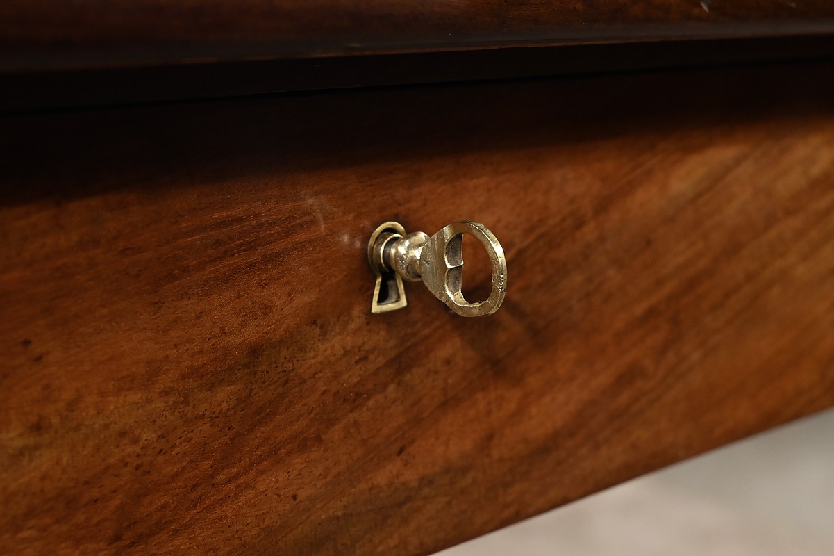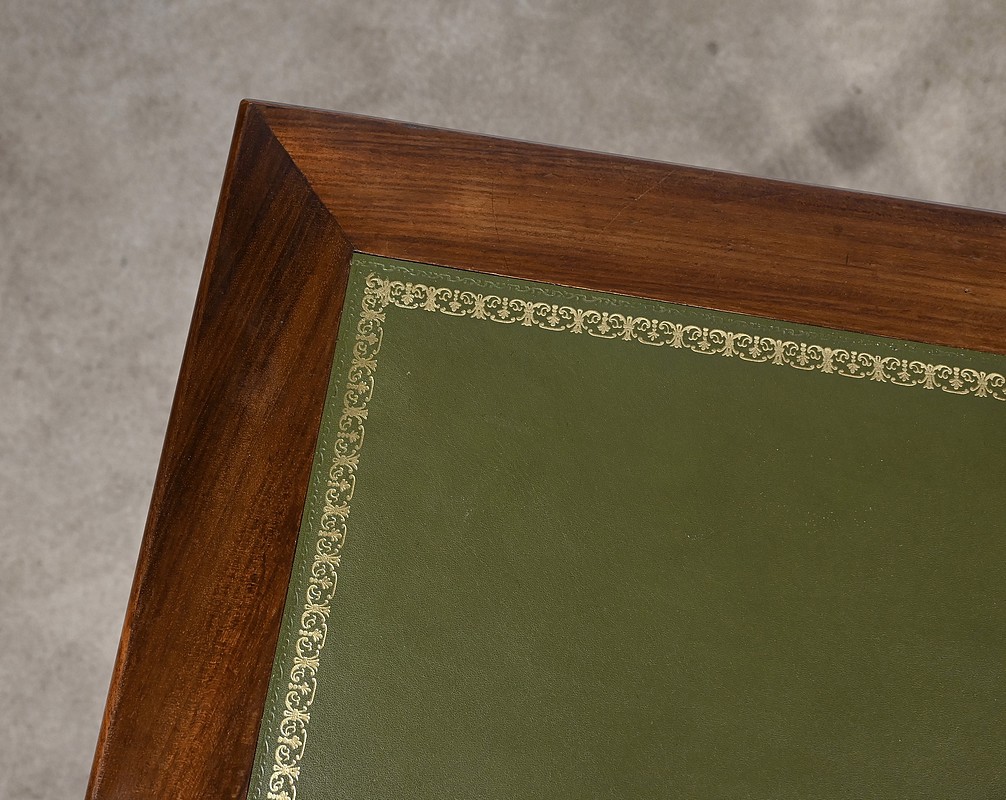 Bureau plat Louis-Philippe en acajou massif et placage d’acajou garni d’un cuir remplacé, avec vignette dorée, vignette à froid et motif central. Ce dernier est entouré d’un cadre à coupe d’onglet. Ce mobilier est muni d’un tiroir en ceinture avec sa clé et sa serrure d’origine en état de fonctionnement. L’ensemble repose des pieds tournés à godrons.