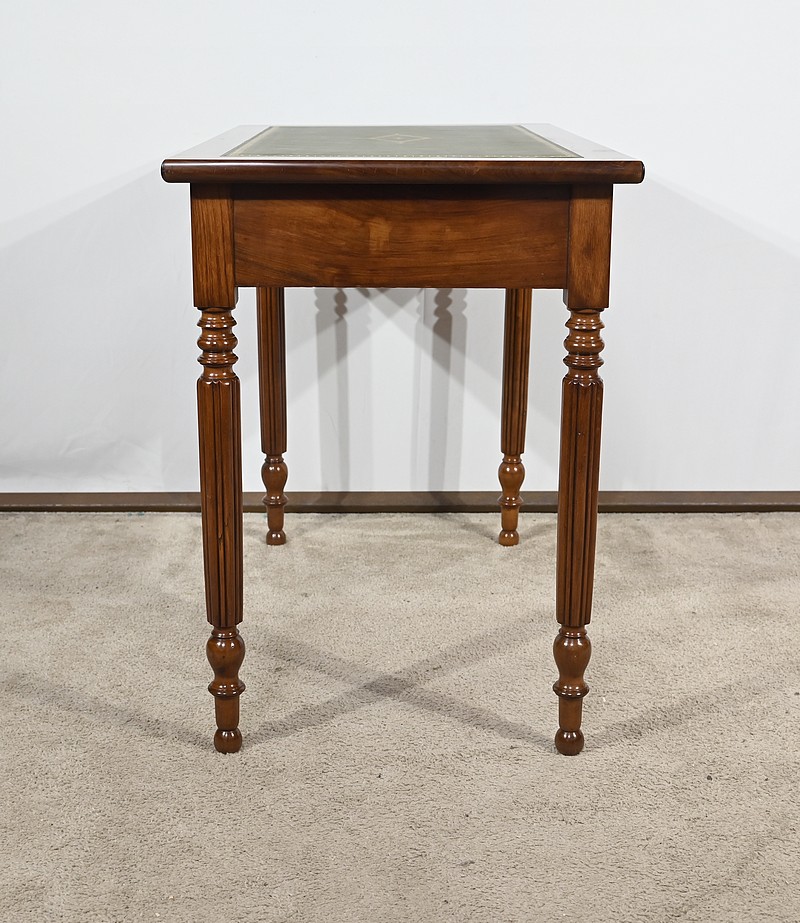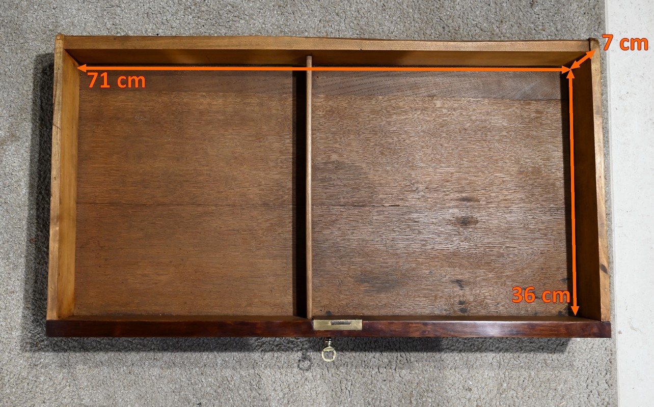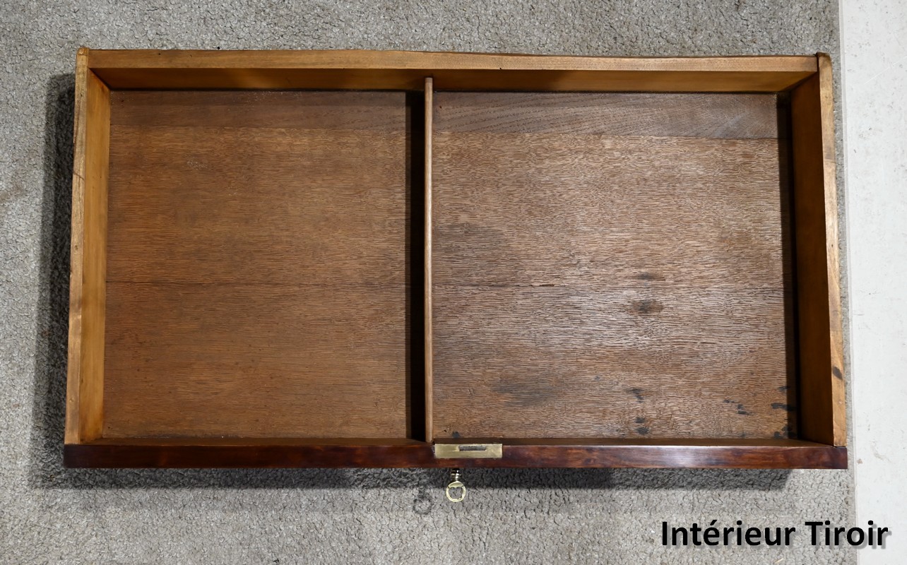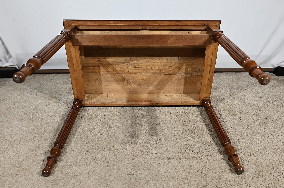 Bureau plat Louis-Philippe en acajou massif et placage d’acajou garni d’un cuir remplacé, avec vignette dorée, vignette à froid et motif central. Ce dernier est entouré d’un cadre à coupe d’onglet. Ce mobilier est muni d’un tiroir en ceinture avec sa clé et sa serrure d’origine en état de fonctionnement. L’ensemble repose des pieds tournés à godrons.