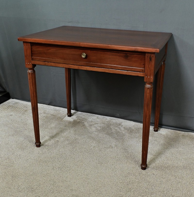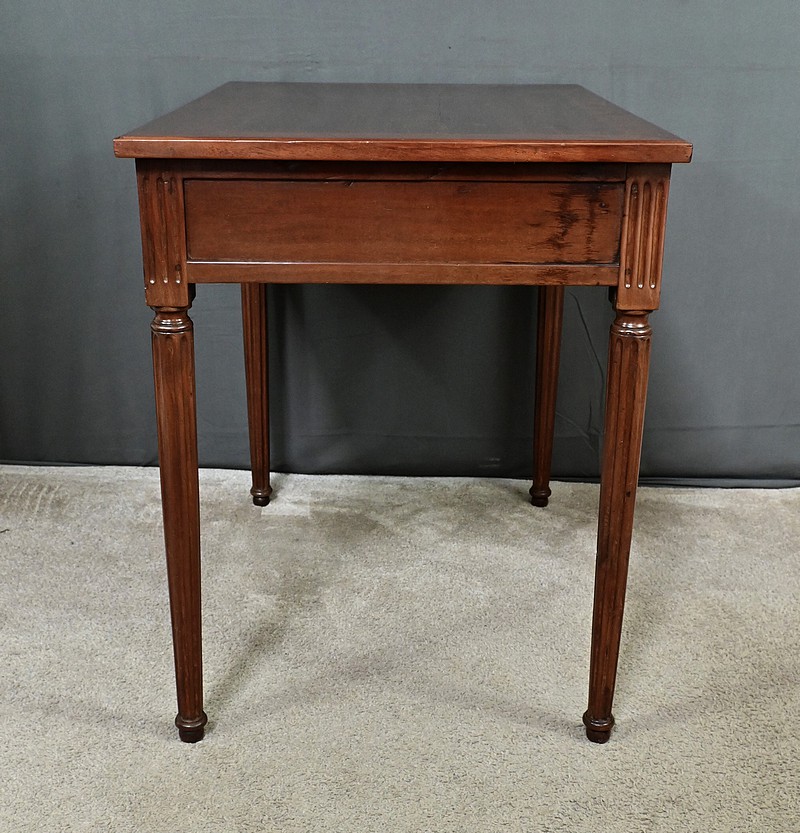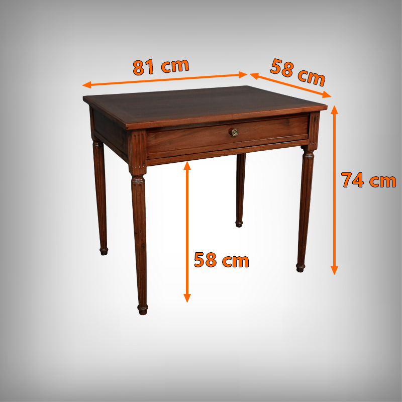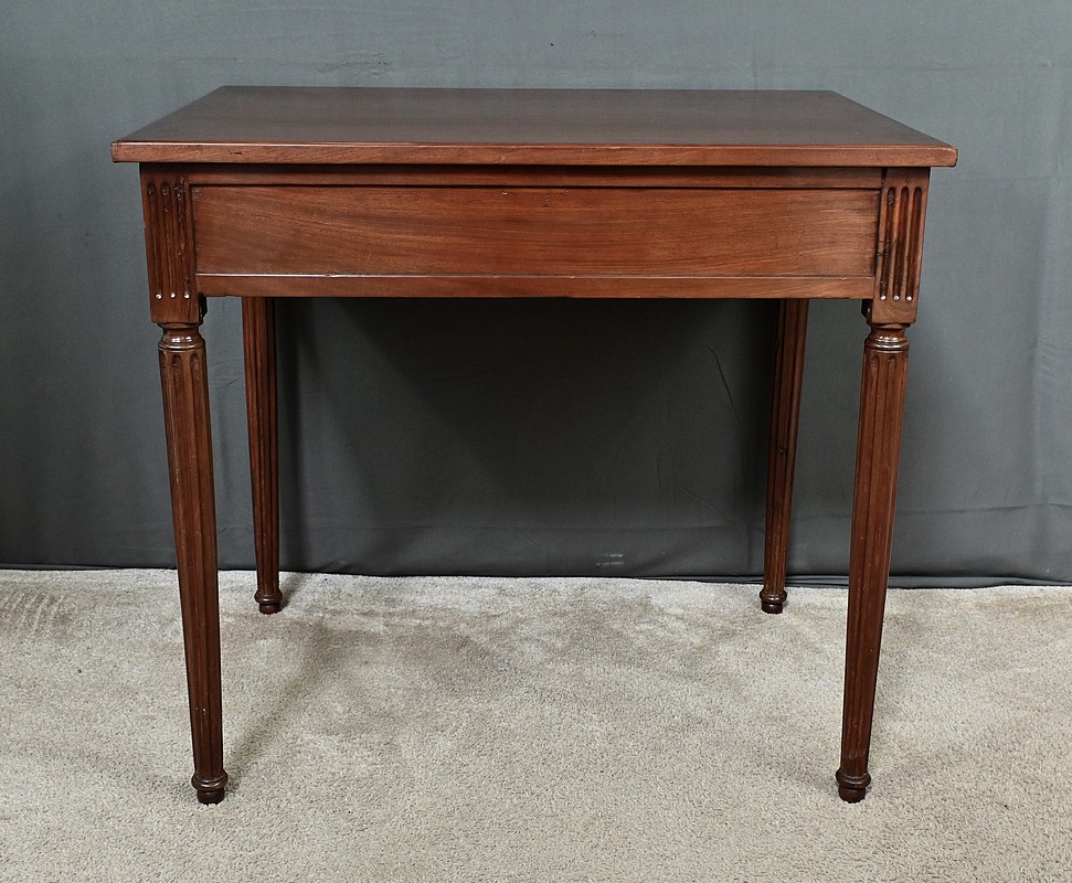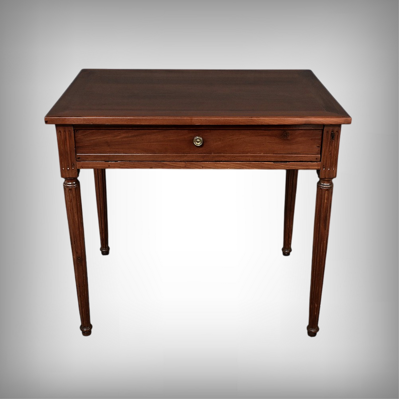 Cette petite table bureau en acajou de Cuba, datant de la fin du XVIIIe siècle, sous le règne de Louis XVI, se distingue par son bois sculpté et mouluré avec finesse, témoignant du savoir-faire artisanal de l’époque. Dotée d’un tiroir discret en ceinture muni d’un bouton de tirage, elle allie fonctionnalité et charme intemporel, tandis que ses montants et ses pieds cannelés, typiques du style Louis XVI, lui confèrent une allure noble et équilibrée. Parfaite comme bureau d’appoint, meuble d’entrée ou table d’écriture, elle saura enrichir tout intérieur d’une touche d’histoire et de raffinement.