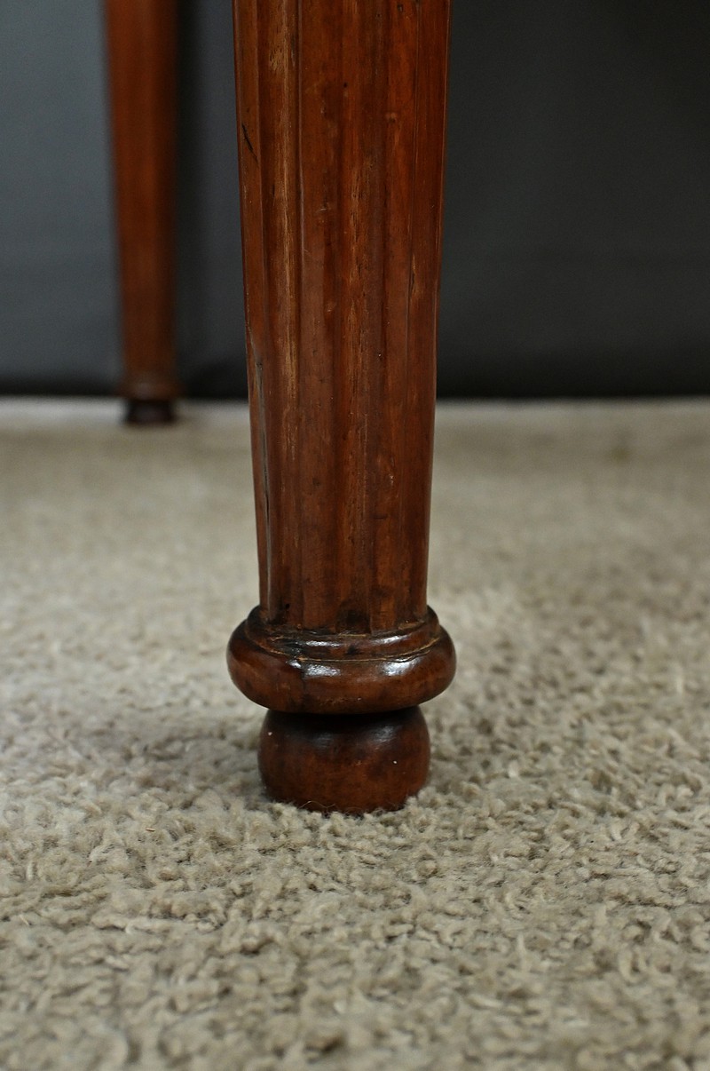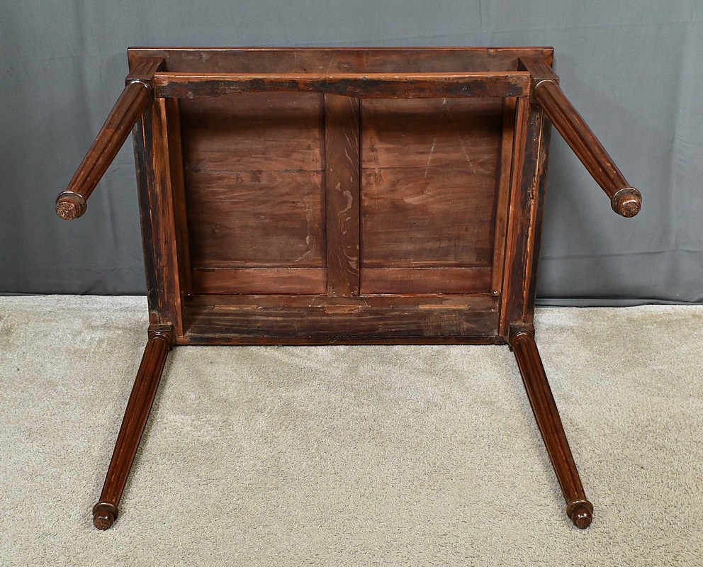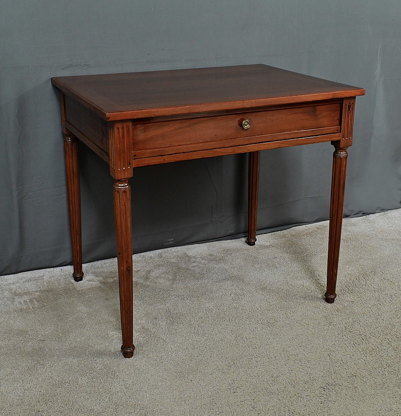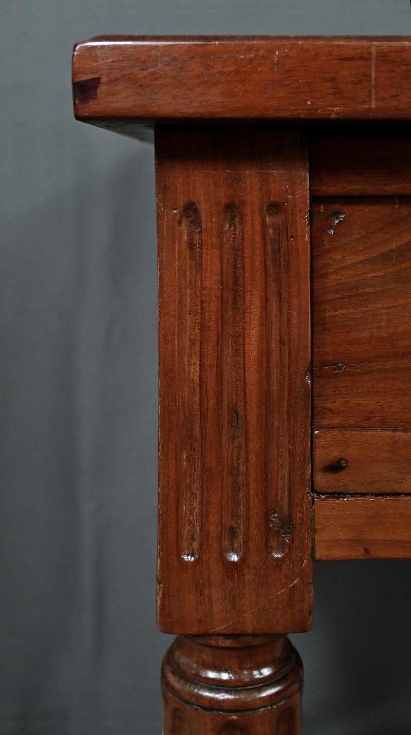 Cette petite table bureau en acajou de Cuba, datant de la fin du XVIIIe siècle, sous le règne de Louis XVI, se distingue par son bois sculpté et mouluré avec finesse, témoignant du savoir-faire artisanal de l’époque. Dotée d’un tiroir discret en ceinture muni d’un bouton de tirage, elle allie fonctionnalité et charme intemporel, tandis que ses montants et ses pieds cannelés, typiques du style Louis XVI, lui confèrent une allure noble et équilibrée. Parfaite comme bureau d’appoint, meuble d’entrée ou table d’écriture, elle saura enrichir tout intérieur d’une touche d’histoire et de raffinement.