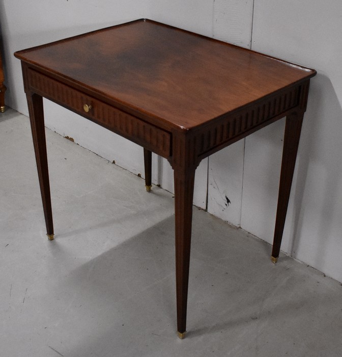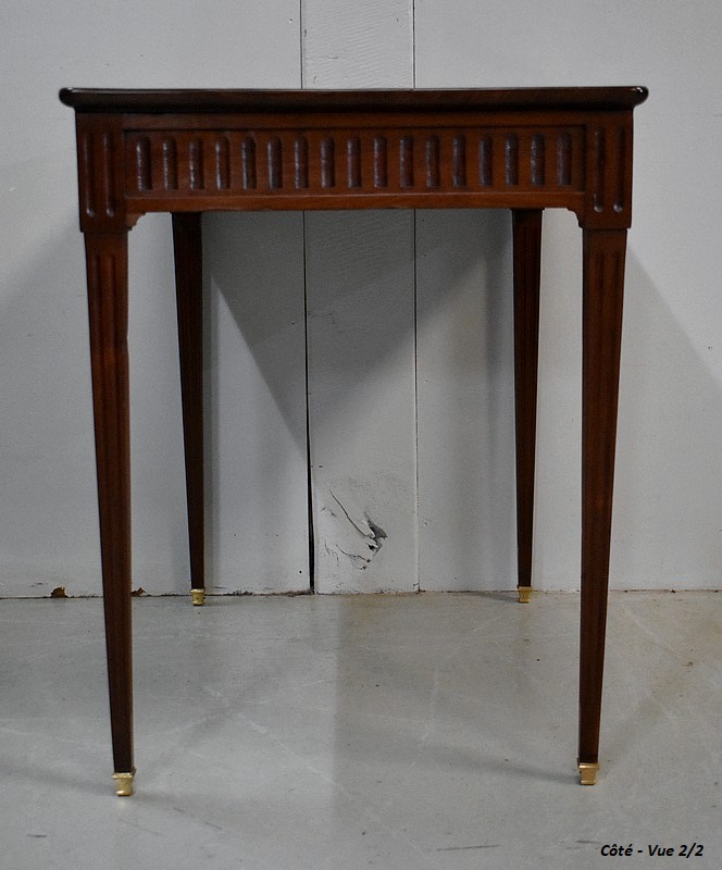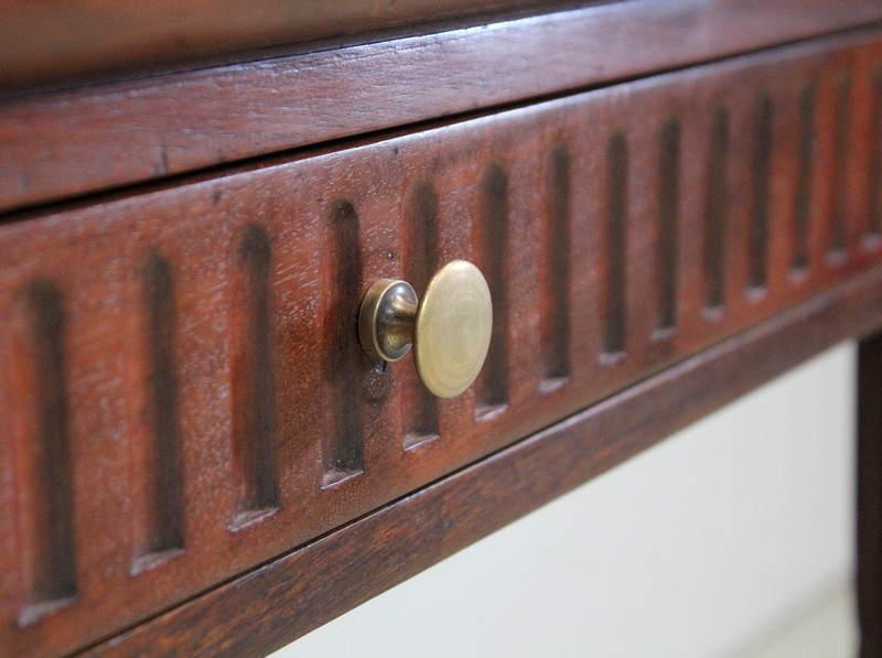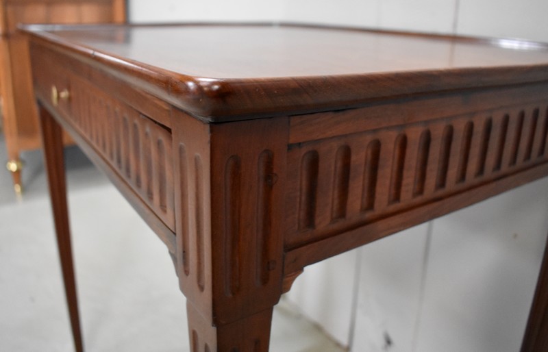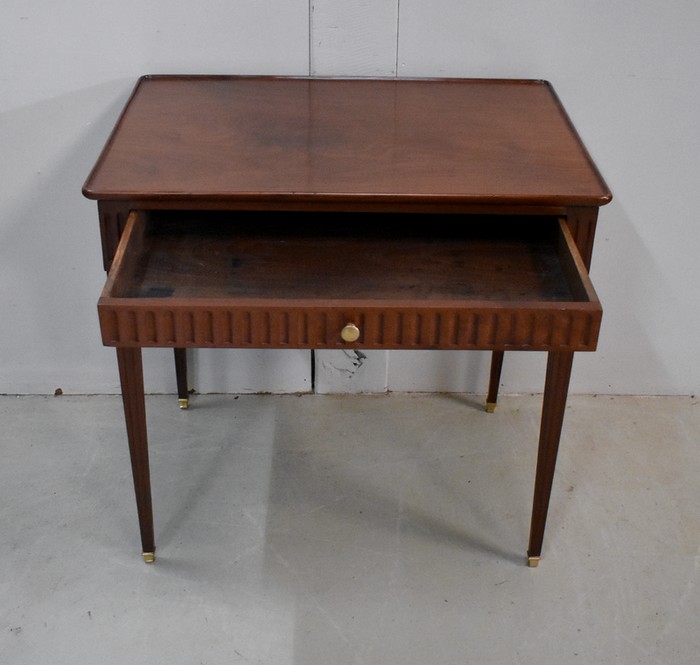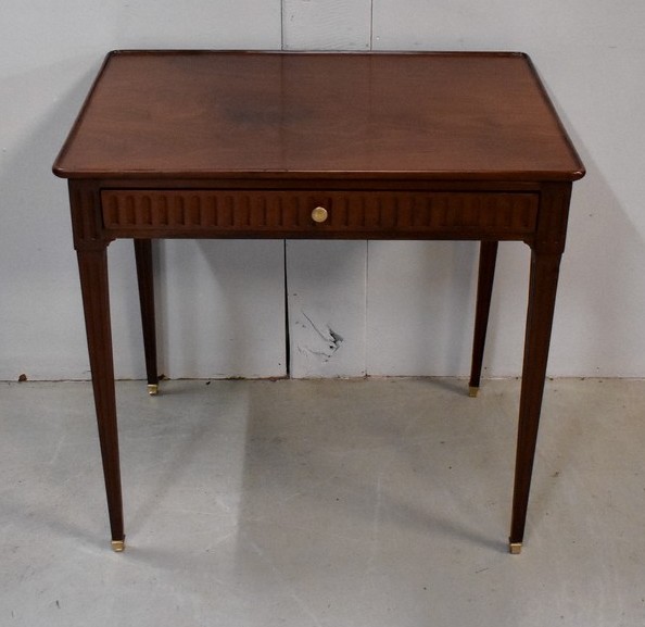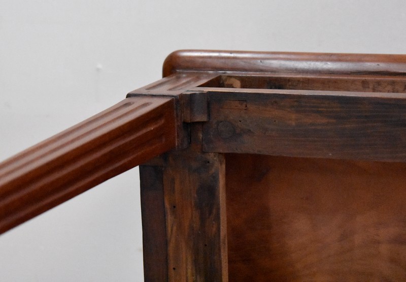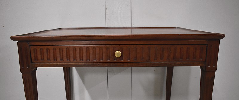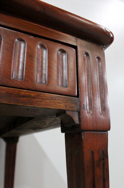 Ce Mobilier est pourvu en Façade d’un Tiroir, qui s’ouvre par un Bouton de Tirage en Laiton. Du relief est apporté par des Cannelures Arrêtées Verticales sur l’ensemble de la Ceinture.