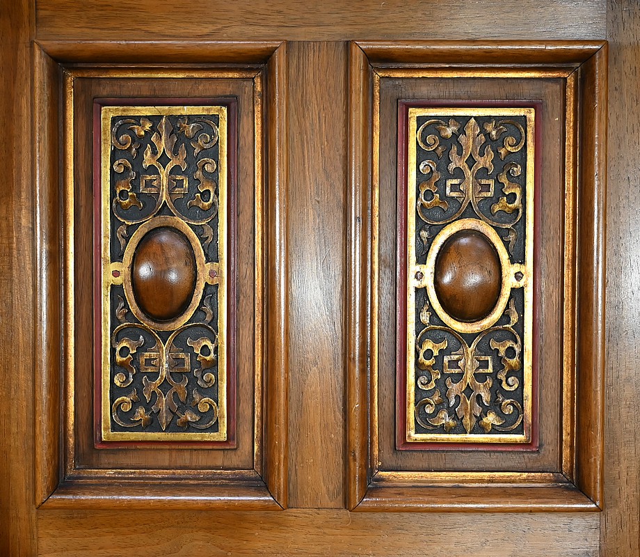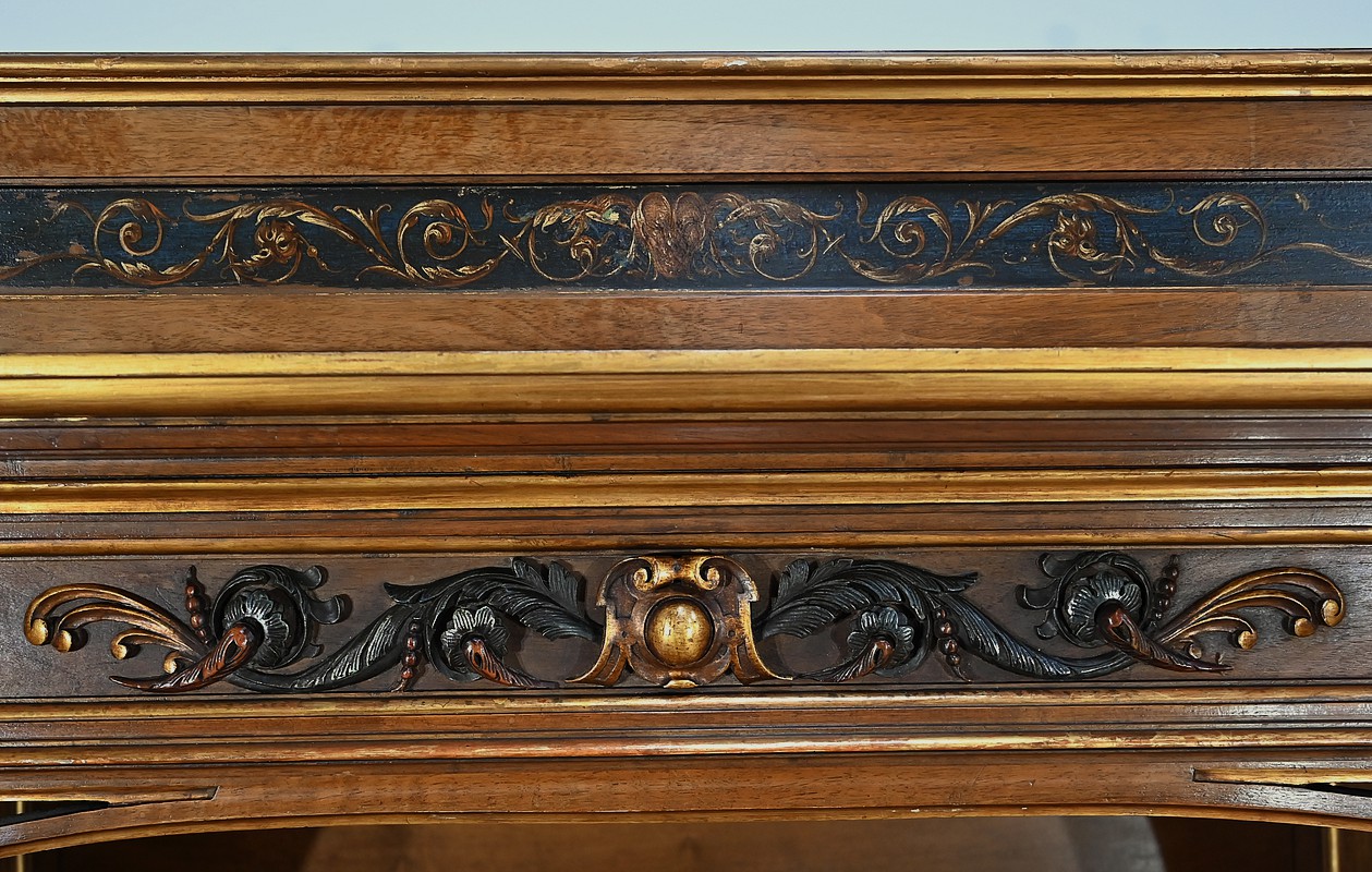 Le cabinet de travail en noyer sculpté et peint est composé de quatre portes, d’un espace ouvert et de tiroirs. Les portes centrales sont constituées de tôle encastrée couleur lie de vin, peintes de putti, elles sont recouvertes d’un vernis craquelé et entourées de moulures. La serrure et sa clé ciselée sont fonctionnelles. De chaque côté, ce meuble est muni de portes plus hautes et plus étroites. Elles sont constituées de panneaux sculptés en relief et peints d’arabesques et de volutes. En partie basse, ce cabinet dispose de tiroirs avec façade moulurée à défoncement et bouton de tirage en bois. Ce meuble repose sur huit pieds. Les pieds avant se terminent par des pattes de lions dorées. Les montants quant à eux sont sculptés de rosaces et agrémentés de visages de grotesques en partie haute. La corniche moulurée et peinte est surmontée de toupies élancées et d’un élément de bois peint d’une frise feuillagée.