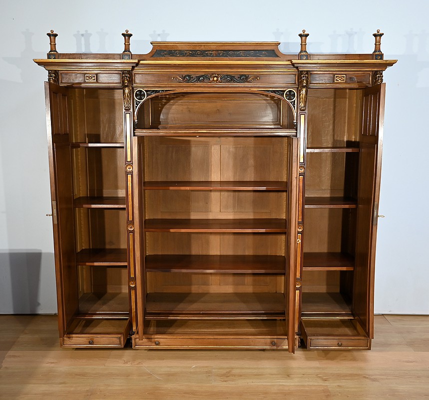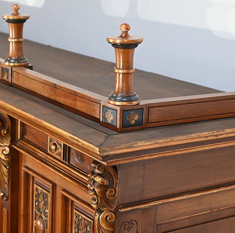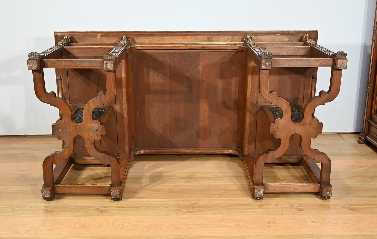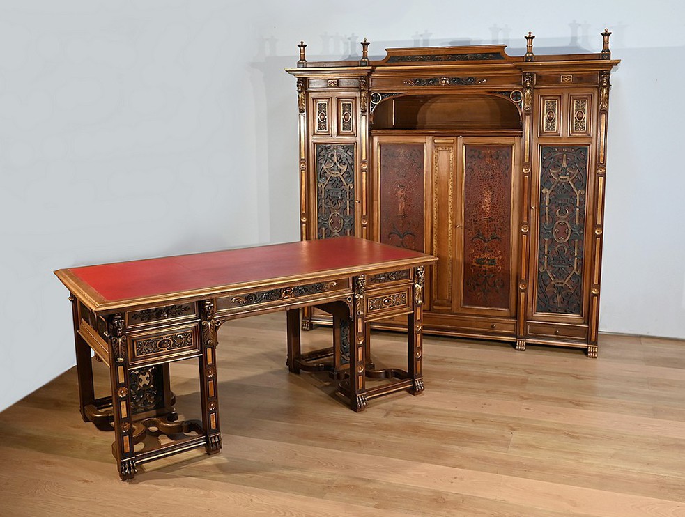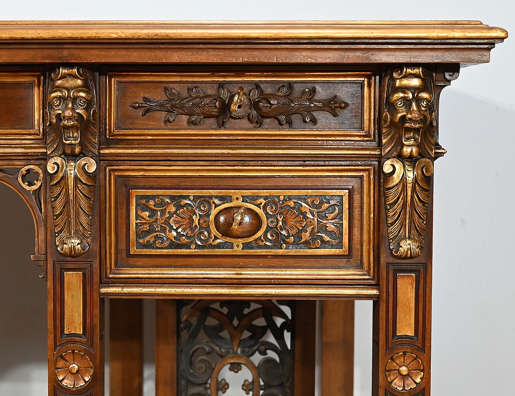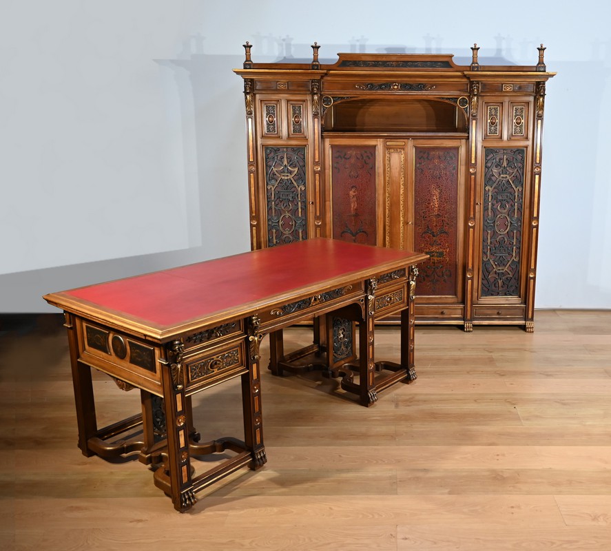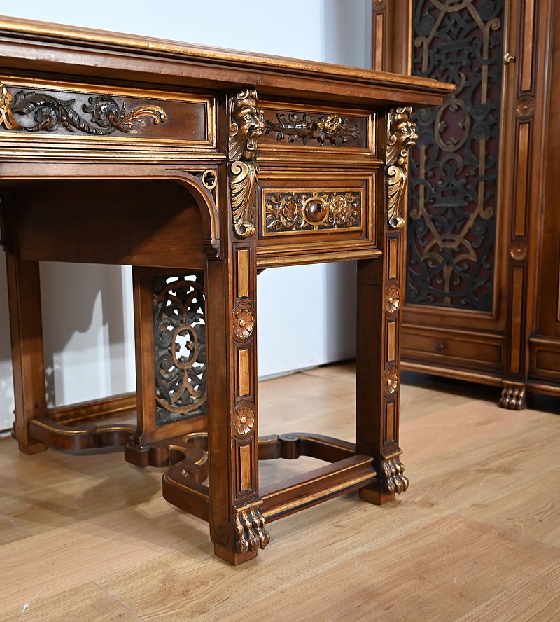 Très bel ensemble composé d’un bureau esprit Mazarin et d’un cabinet de travail. Ces meubles en noyer sont richement sculptés, dorés et peints dans le goût Renaissance italienne.