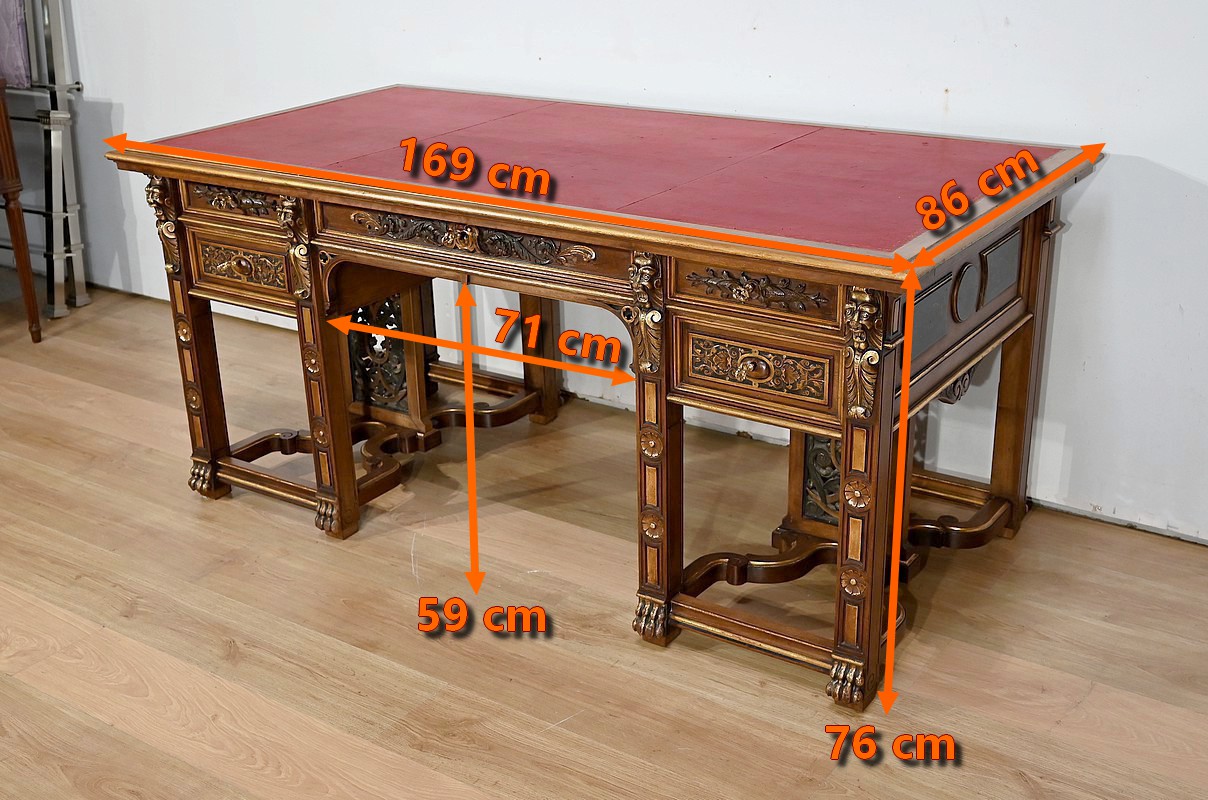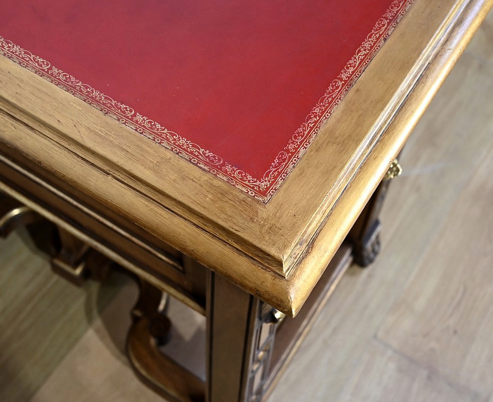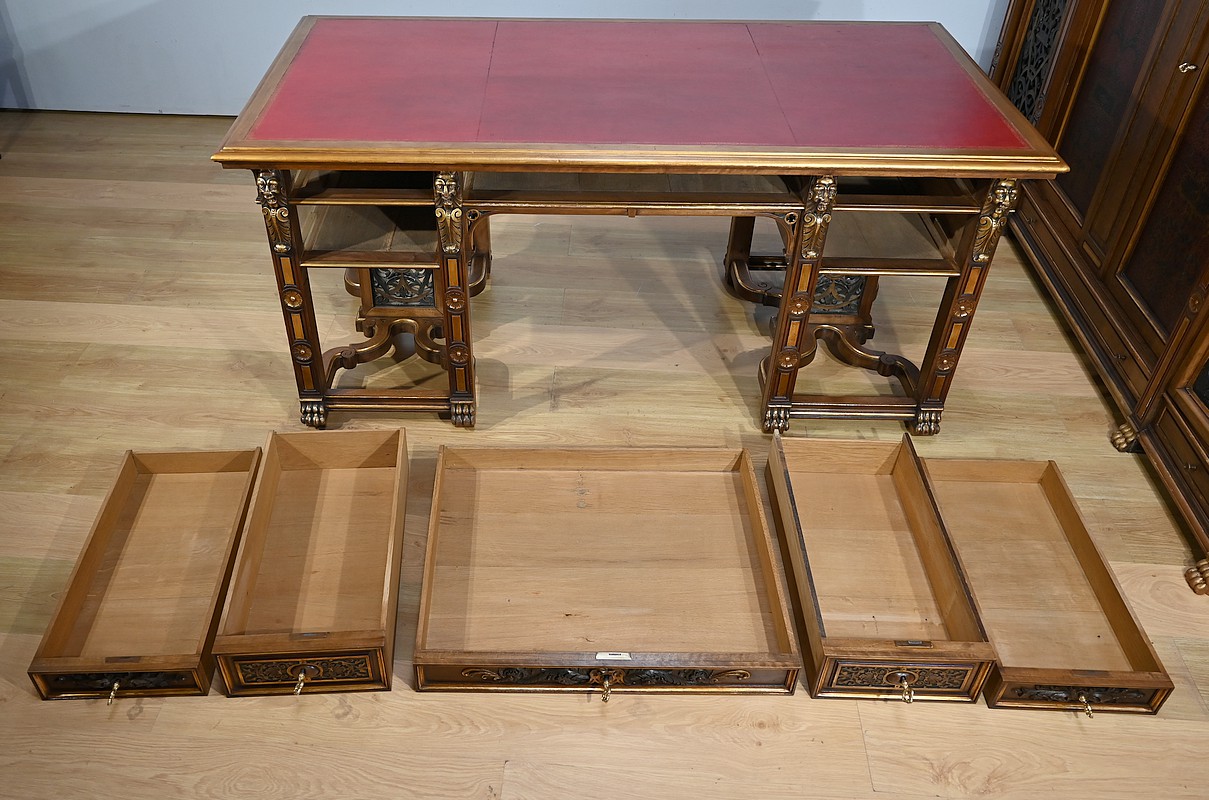 Le bureau présente un dessus à encadrement dont le pourtour doré est mouluré. Au centre, ce bureau est doté d’un cuir rouge lie de vin d’origine avec vignette dorée. Sur le côté gauche, une tablette coulissante permet d’agrandir la surface de travail. La ceinture du bureau est munie quand à elle de trois tiroirs sculptés en relief de feuillages et d’arabesques. Les façades sont à défoncement et des moulures dorées suivent le contour des tiroirs. Sur les côtés, nous observons également des tiroirs plus haut dont la façade différente est sculptée en relief d’arabesques sur fond granité et entourée de moulures peintes. Cette configuration de tiroirs rappelle l’esprit des bureaux Mazarin, également par les pieds réunis par une entretoise en X. En effet, ce bureau repose sur huit pieds sculptés de rosaces et agrémentés de visages de grotesques en partie haute. De chaque côté, les quatre pieds présentent des entretoises mouvementées soutenant un cadre ajouré avec volutes peintes du plus bel effet. Les pieds se terminent par des pattes de lions dorées.