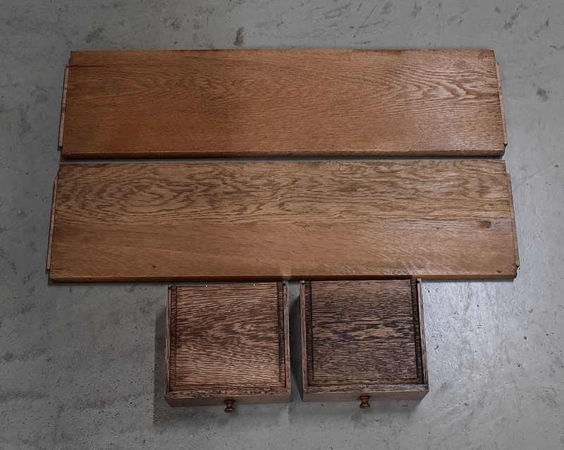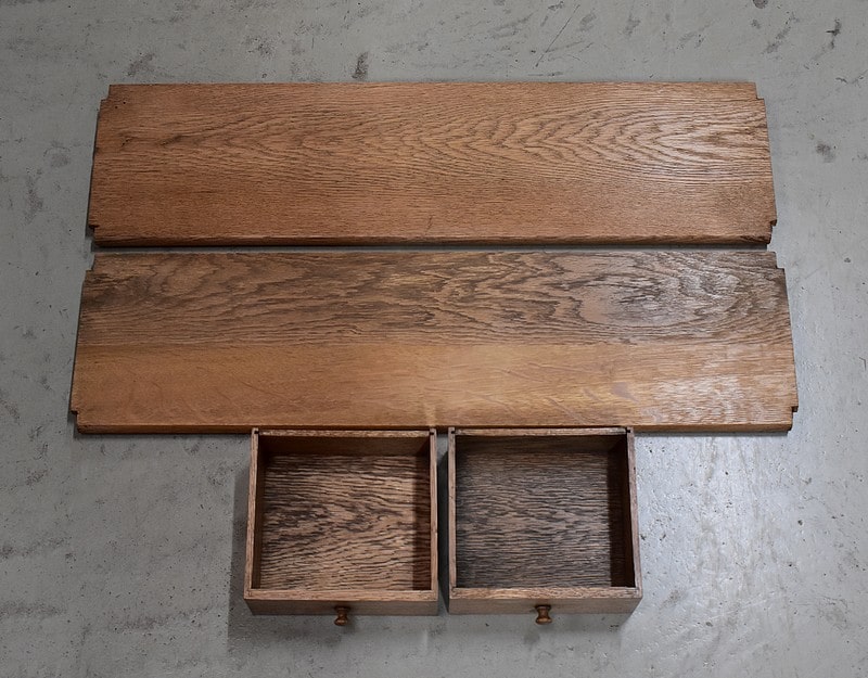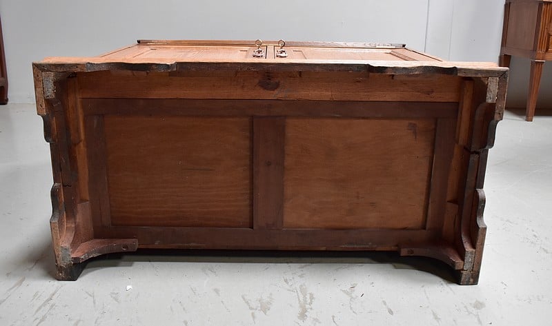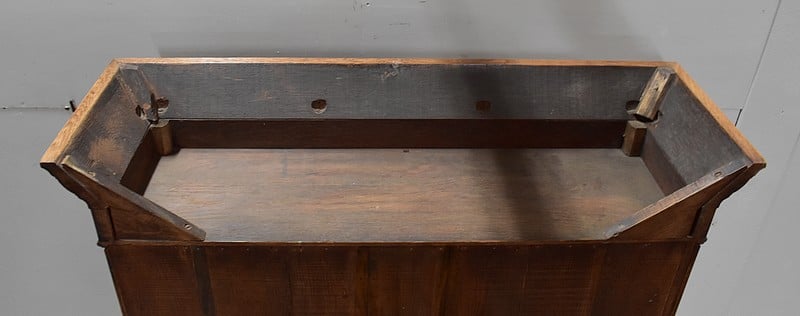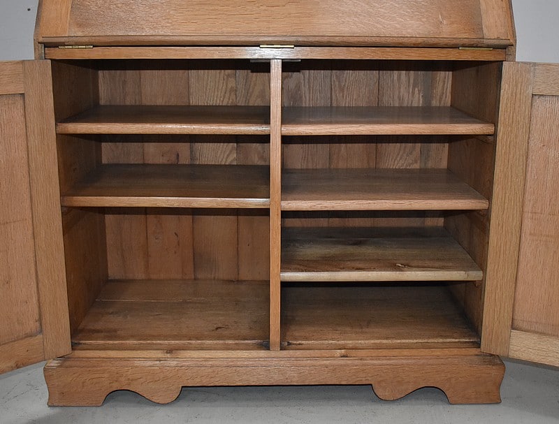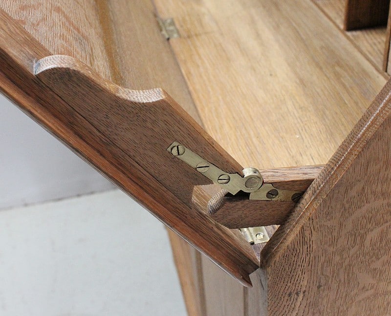 La seconde composante est un Scriban à abattant incliné, maintenu déplié à l’horizontal par un système original de Compas en Bois dit ‘à Genoux’. Il révèle un espace constitué de huit Niches et deux petits tiroirs à boutons de tirage Bois, et offre une zone de travail de 83.5 cm de long par 53 cm de large.