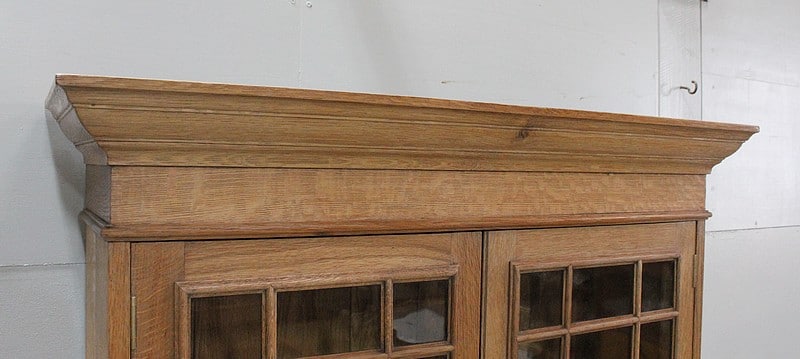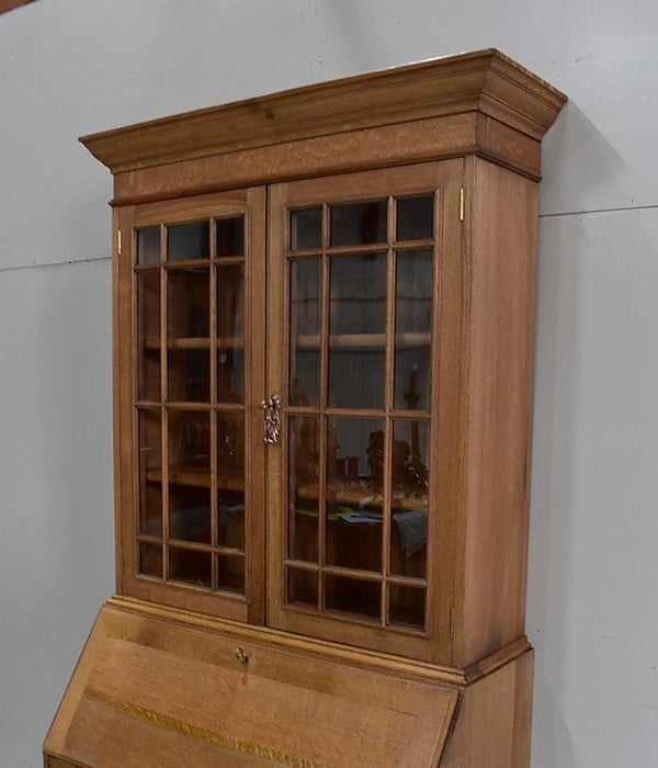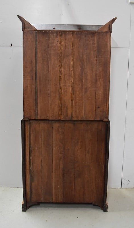 L’élément du haut, sommé d’une Corniche moulurée, consiste en une Bibliothèque, ouvrant par deux portes vitrées à barreautage. Elles découvrent deux étagères de 22 cm de profondeur, sur crémaillères et donc réglables à souhait sur une hauteur totale de rangement de 82 cm.