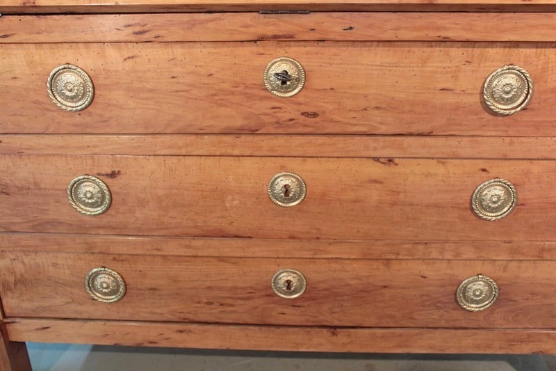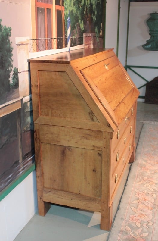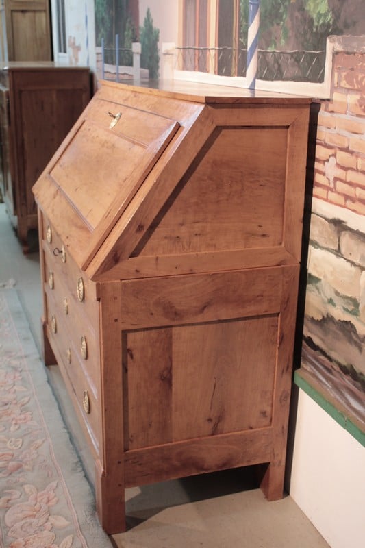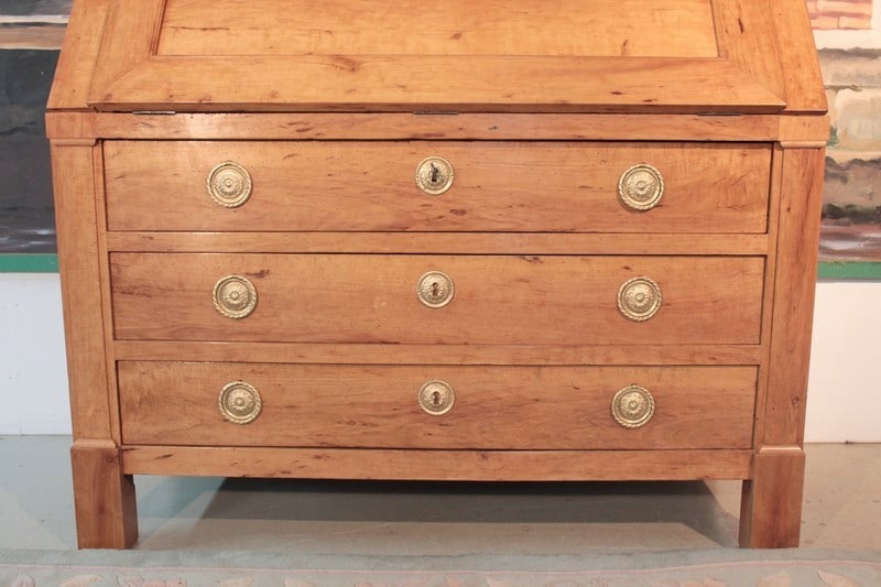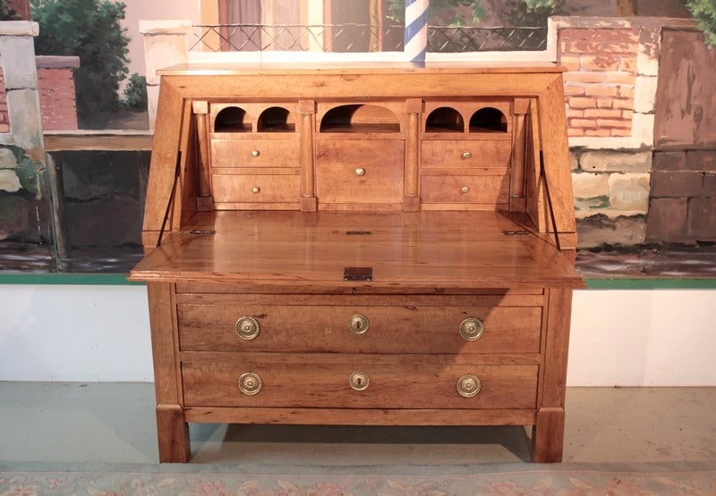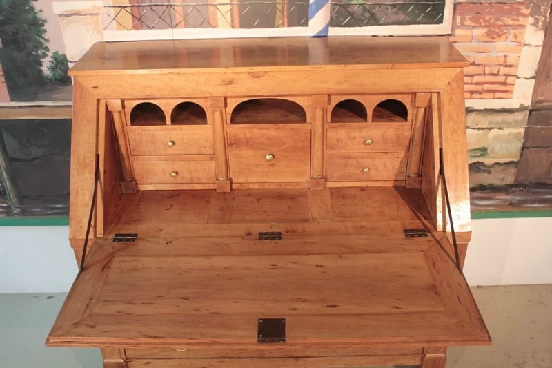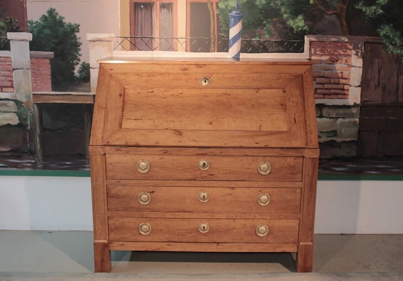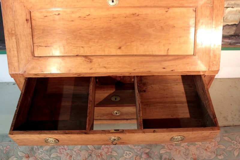 Commode Scriban en poirier dans le goût Directoire ouvrant par 1 abattant et 3 tiroirs à traverse apparente. L’abattant découvre 4 petits tiroirs et 1 grand, fermant par système secret, surmontés de niches au bandeau cintré. Une niche secrète se cache sous le plus grand tiroir. Les entrées de serrure et les anneaux de tirage sont en laiton. Travail provincial de la première moitié du XIXe
