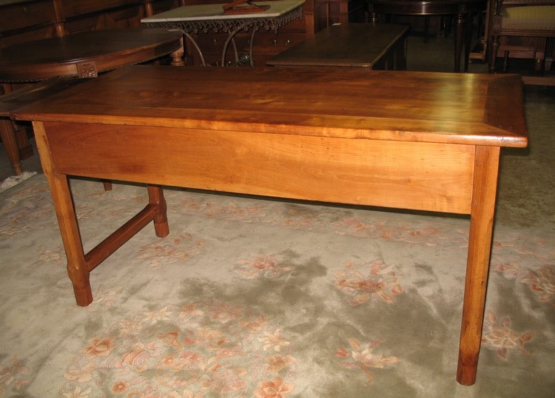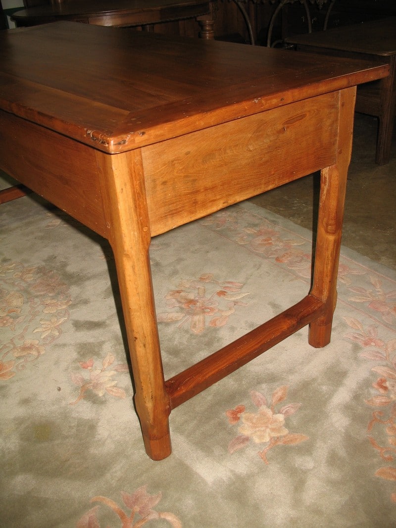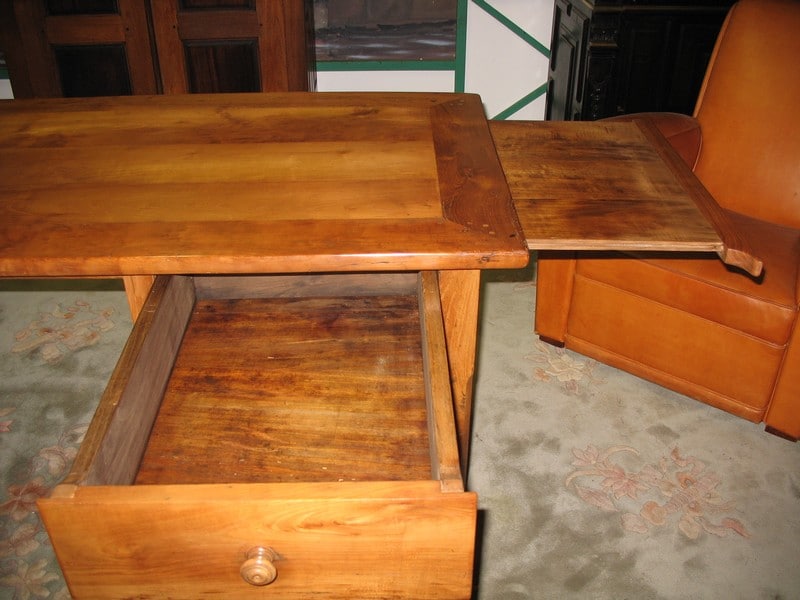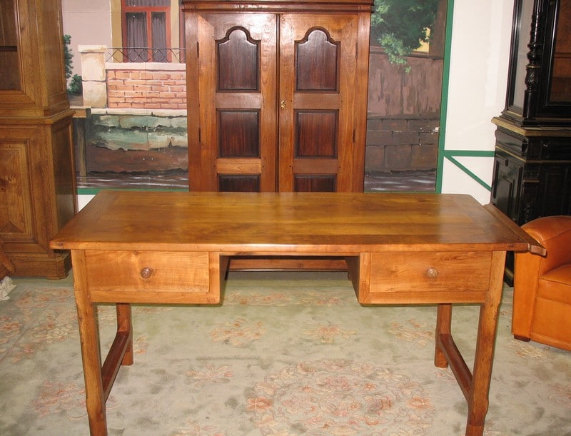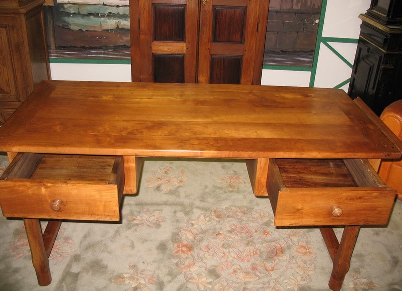 Table-Bureau en merisier reposant sur 4 pieds droits à chanfrein et ouvrant par 2 tiroirs profonds et 1 tirette à droite.