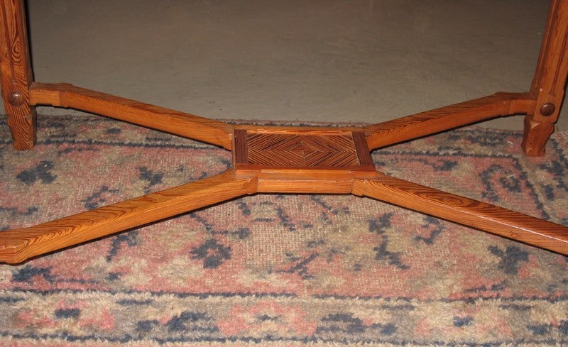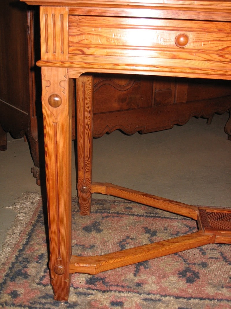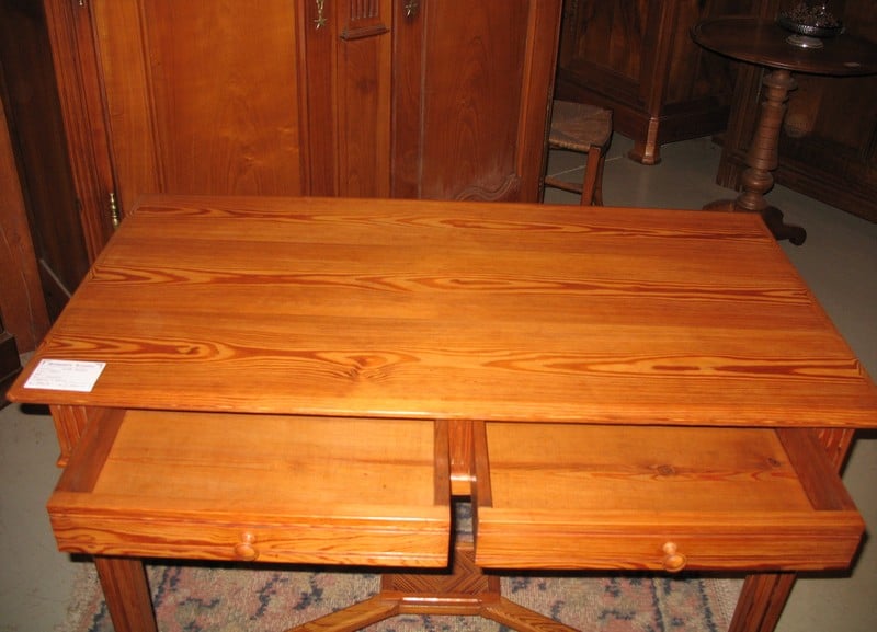 Table-Bureau en pitchpin reposant sur 4 pieds droits réunis par une entretoise et ouvrant par 2 tiroirs en façade. Époque 1920.