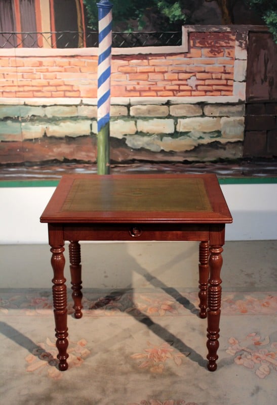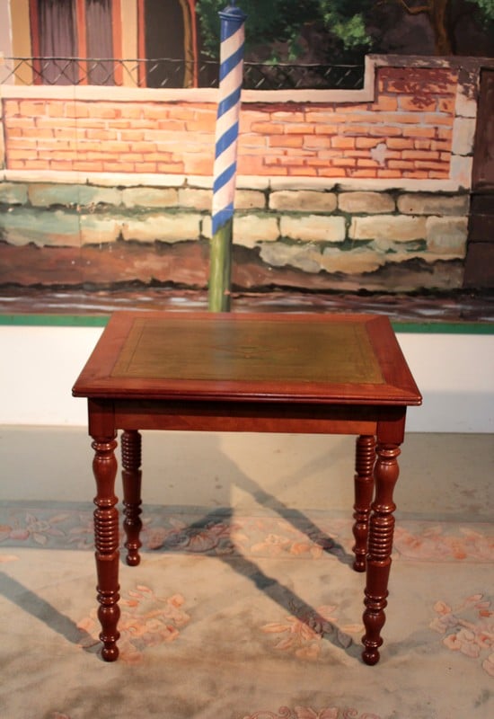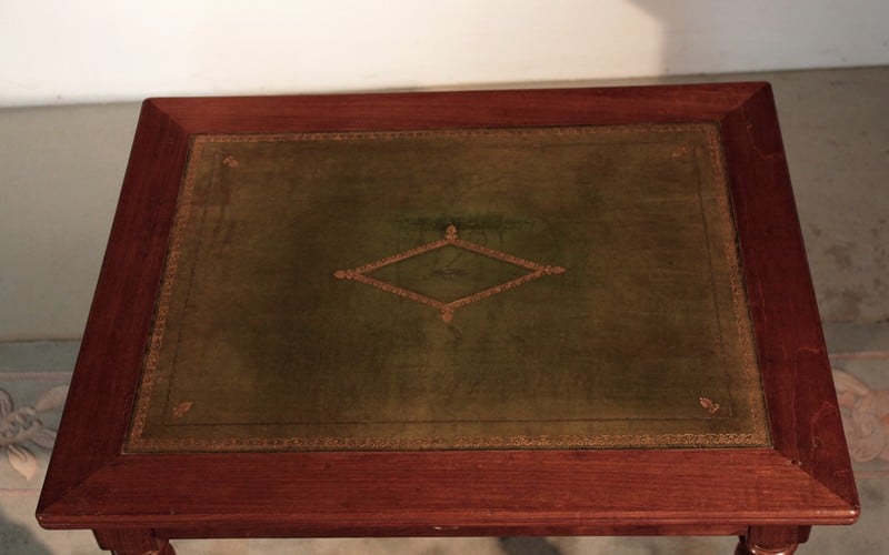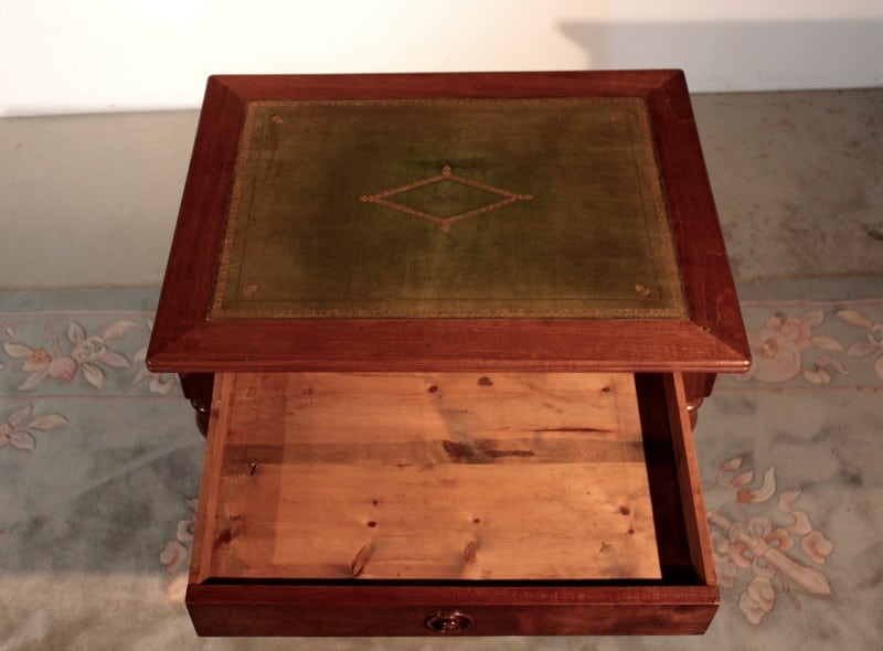Petite Table-Bureau Louis-Philippe en acajou, dessus recouvert d’un cuir vert. Elle repose sur 4 pieds tournés et ouvre par 1 tiroir dans le bandeau. De petite dimension, elle est facile à placer.
