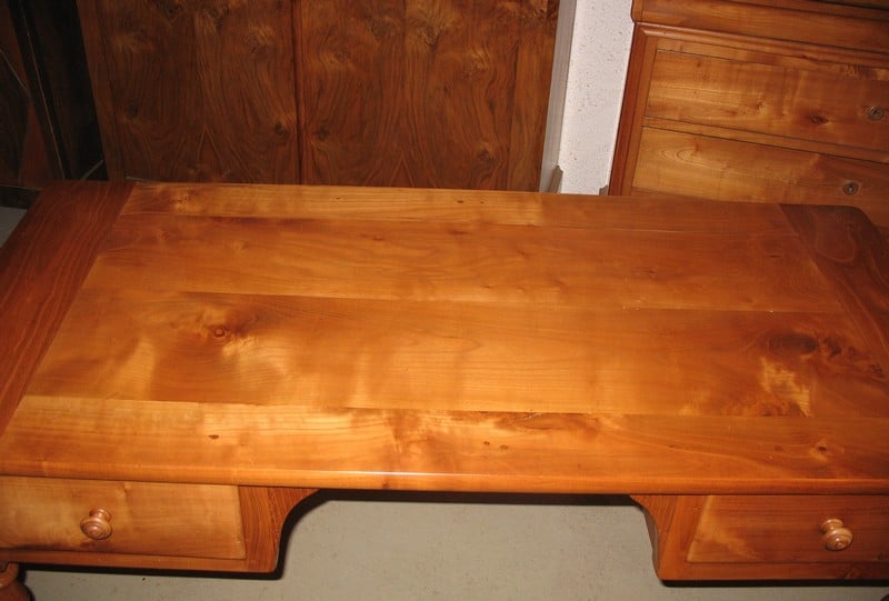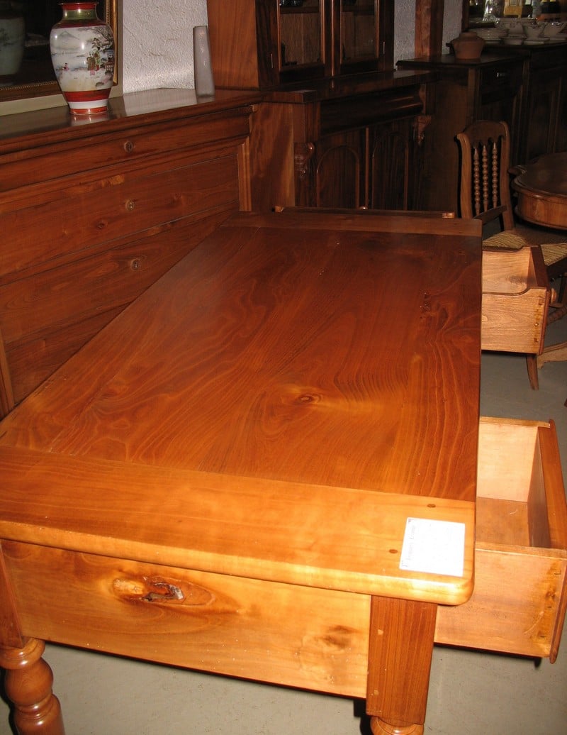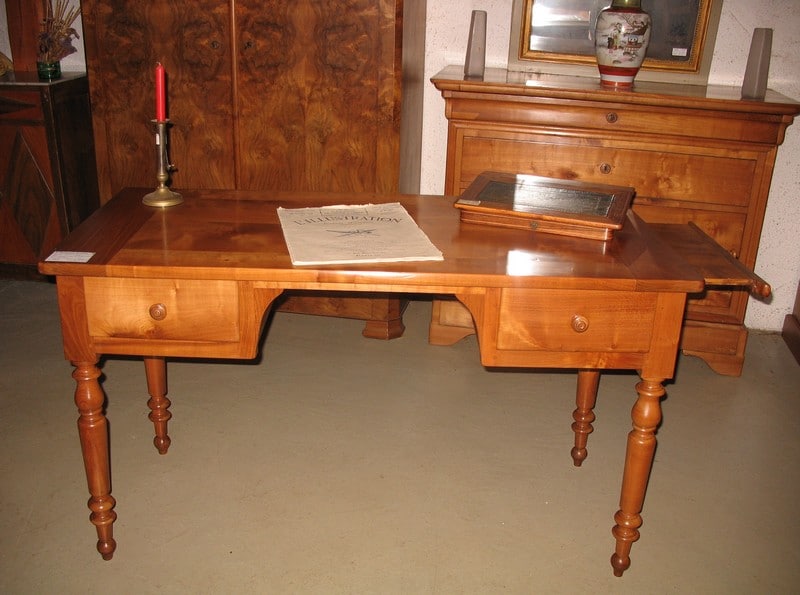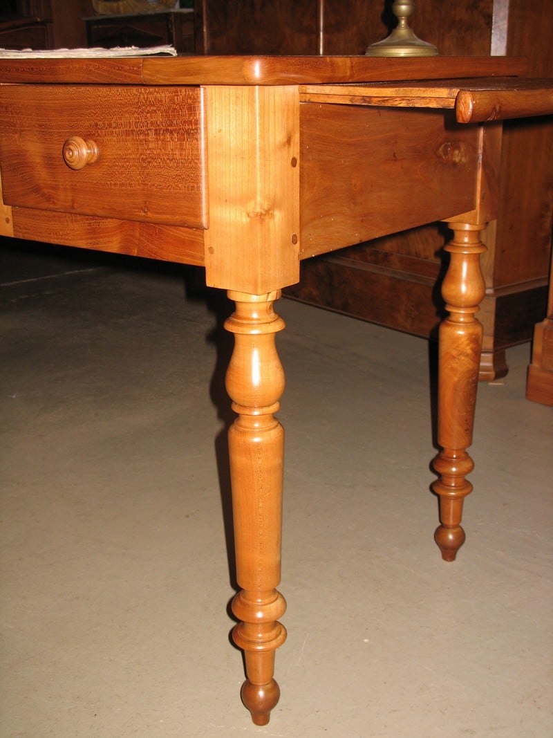 Jolie Table-Bureau Louis-Philippe en merisier ouvrant par 2 tiroirs et une tablette à droite, et reposant sur 4 pieds tournés. Seconde moitié du XIXe.