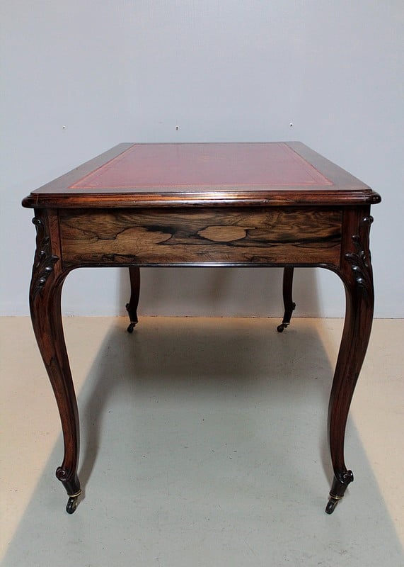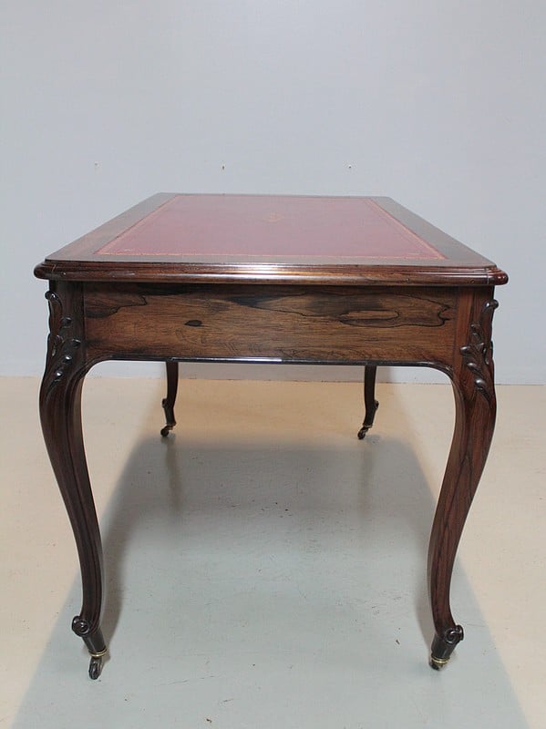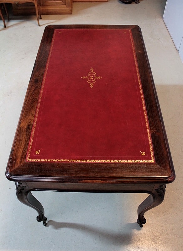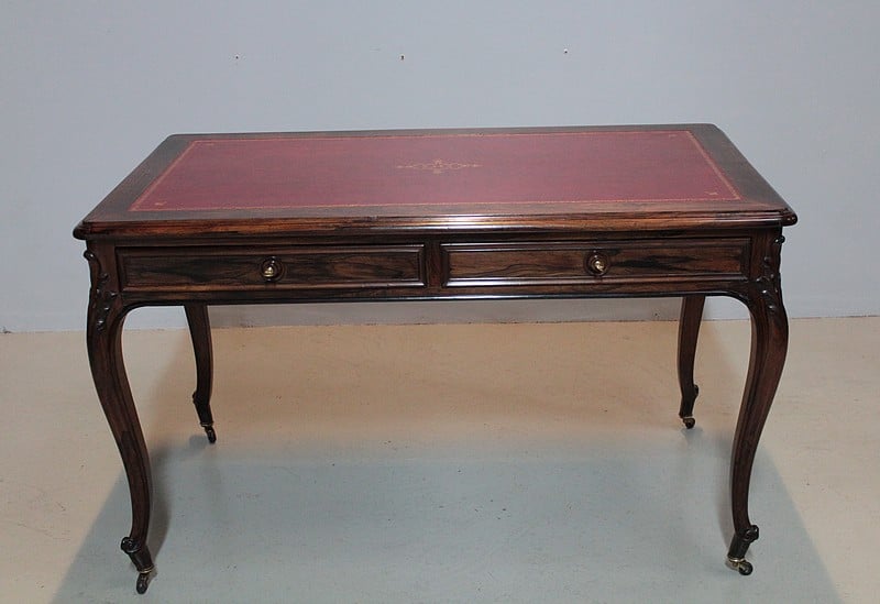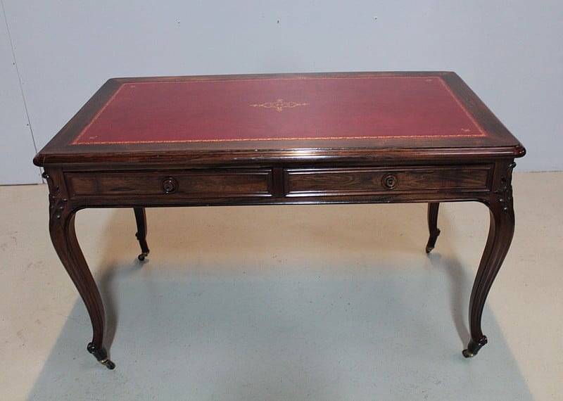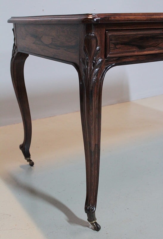 Table-Bureau de style Louis XV en palissandre massif pour les pieds et placage de palissandre pour la traverse et le dessus.