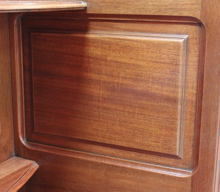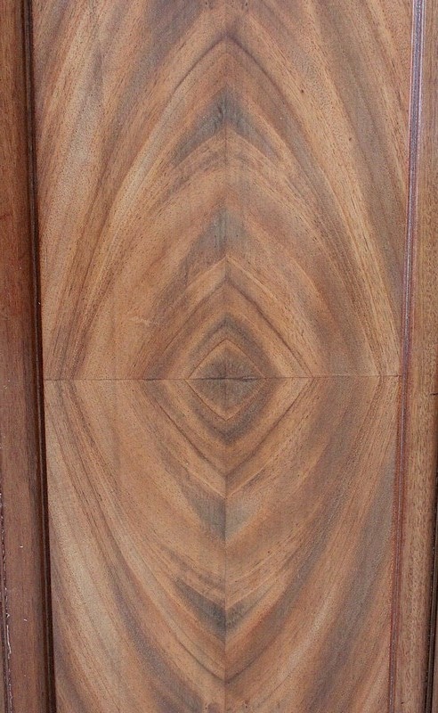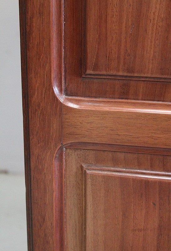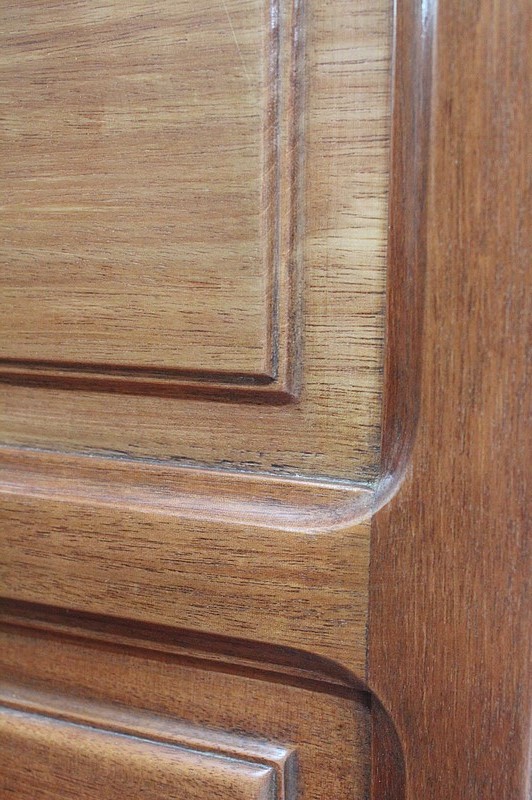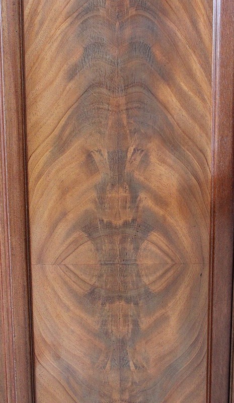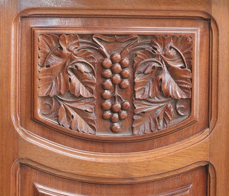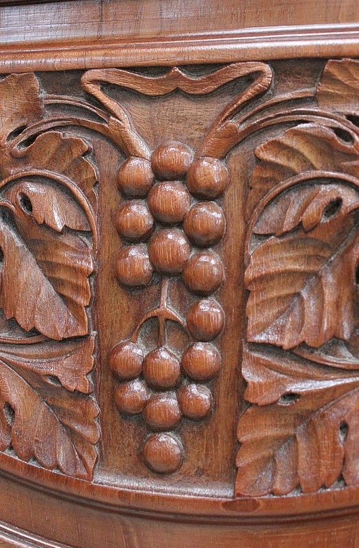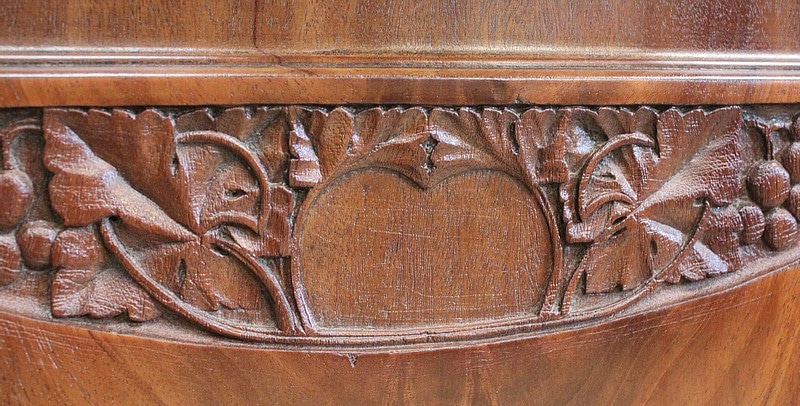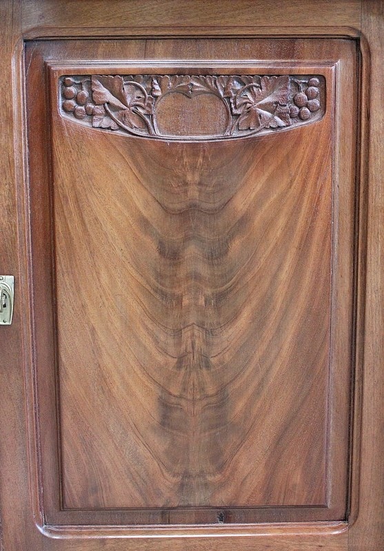 Les façades des quatre portes de ce meuble bénéficient d’une composition similaire, à savoir du Placage de Ronce d’Acajou à Dessins symétriques appliqués sur de l’Acajou massif. C’est cette judicieuse combinaison qui permet, sur les portes du bas, la Sculpture de Décors de Vignes dans l’épaisseur du bois. On retrouve également sur les portes latérales, en parties hautes, des Pampres saillants.