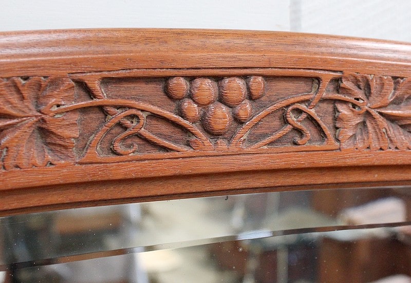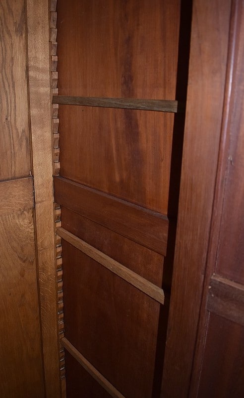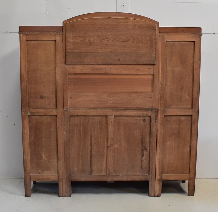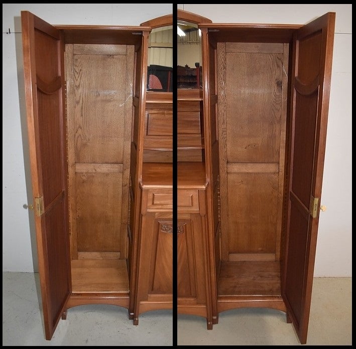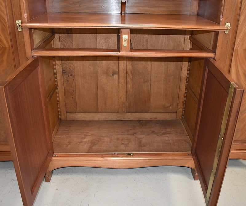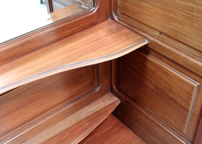 Il se compose au centre d’un espace en retrait, comprenant un Miroir aux pourtours biseautés sommé d’une frise Sculptée. On y trouve aussi deux petites étagères aux lignes mouvementées et bordures moulurées. Les côtés et fond sont panneautés avec plates bandes, composition choisie également pour les portes et les côtés du meuble.