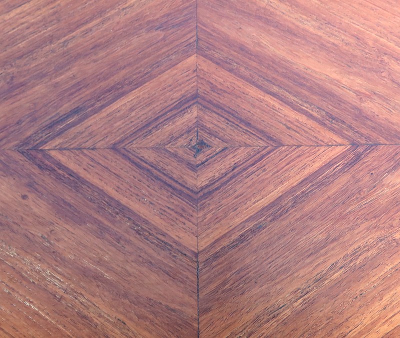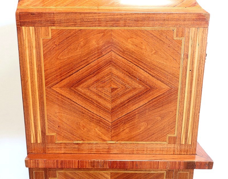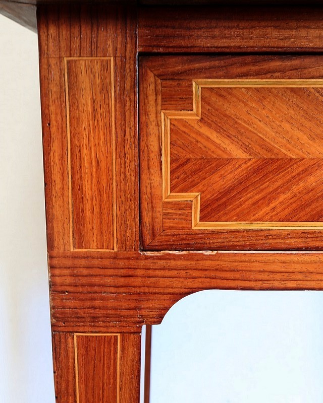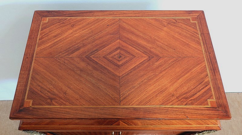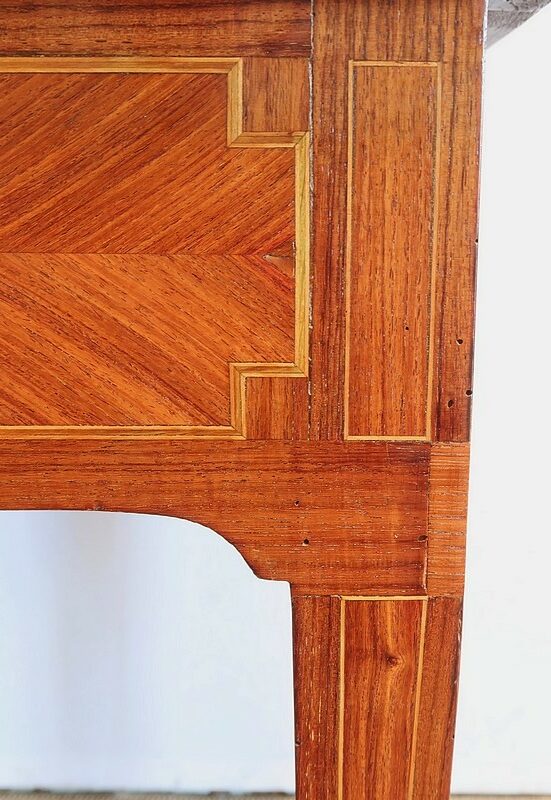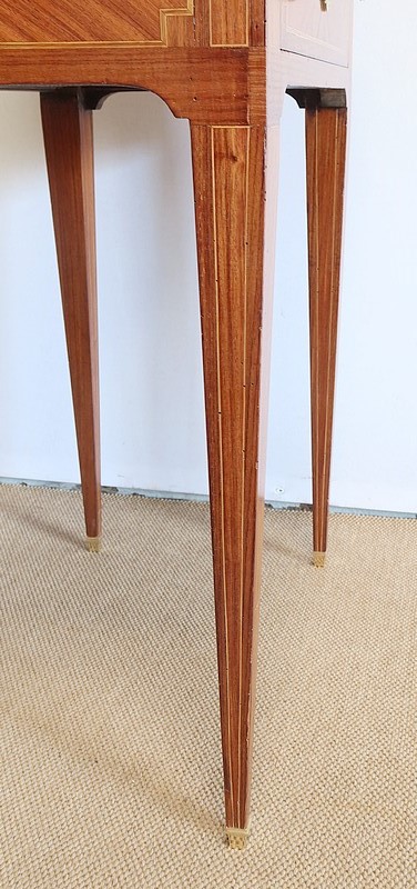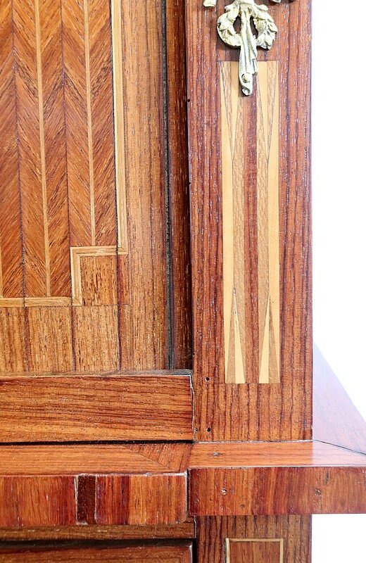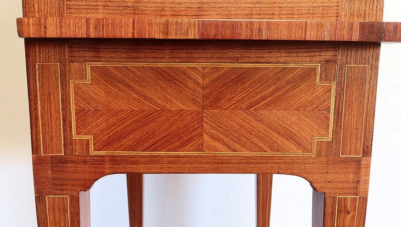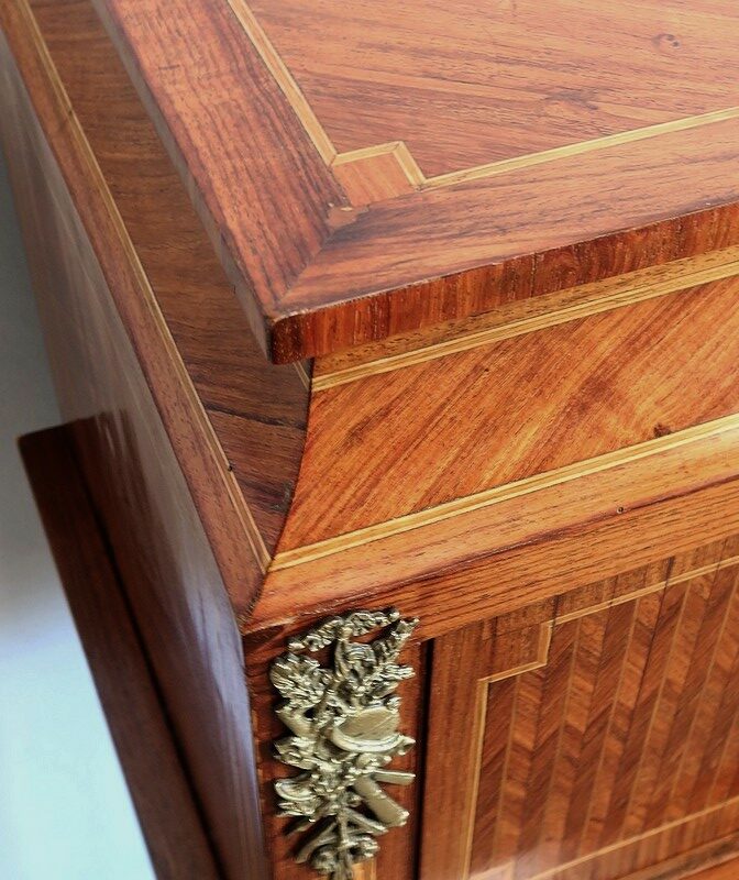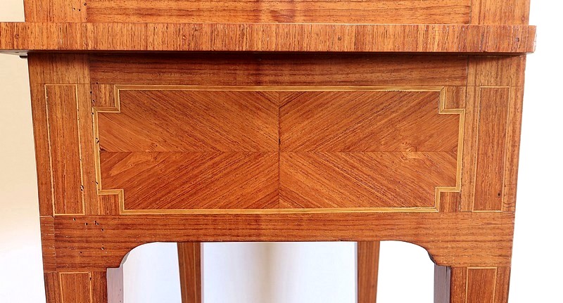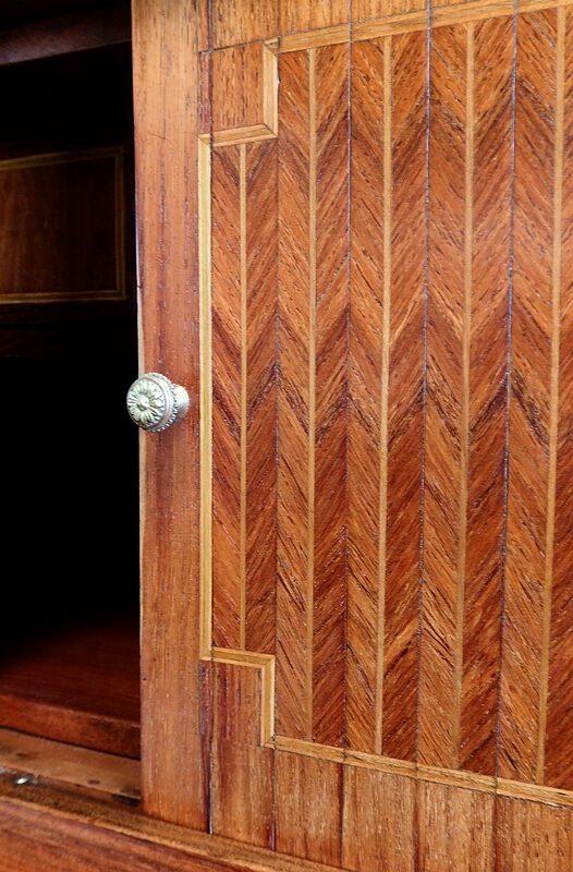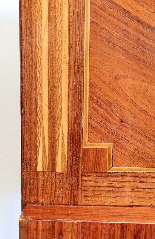 Ce meuble est enjolivé, sur le dessus, les côtés ou encore la façade du tiroir, de marqueteries en bois de violette, tantôt en frises tantôt en ailes de papillon. Elles sont soulignées par des filets de citronnier et de bois teinté vert, que l’on retrouve également sur la tablette et sur toutes les faces visibles des pieds.
