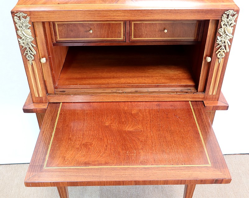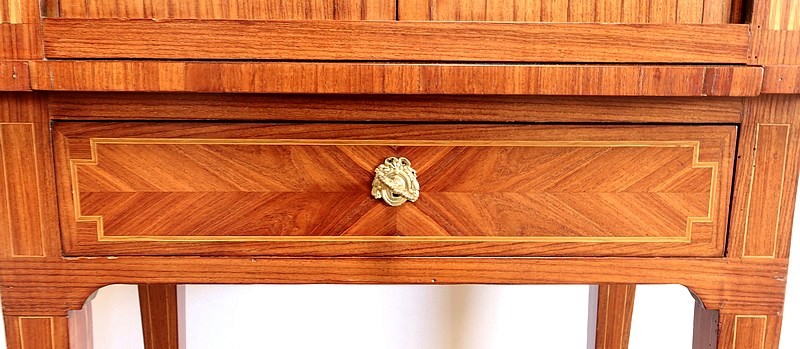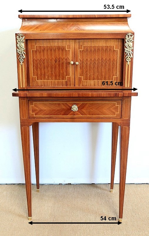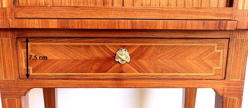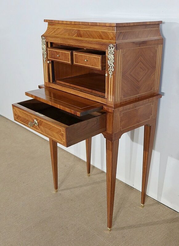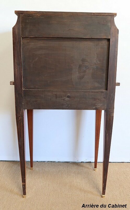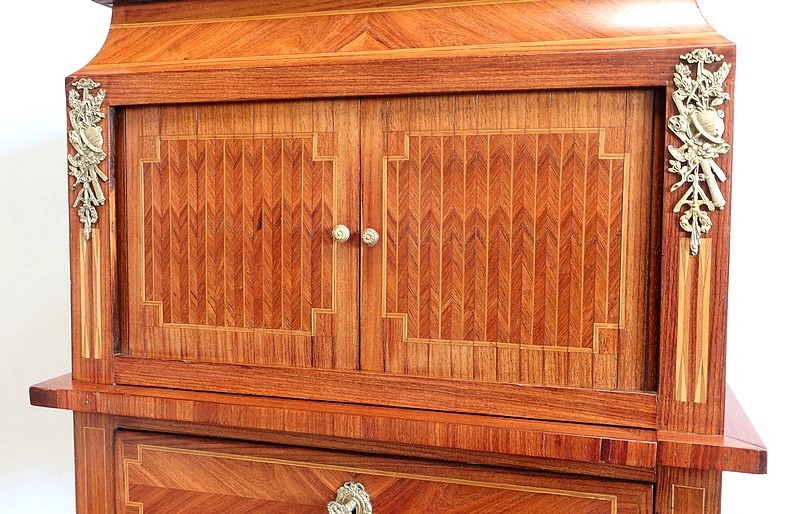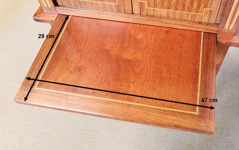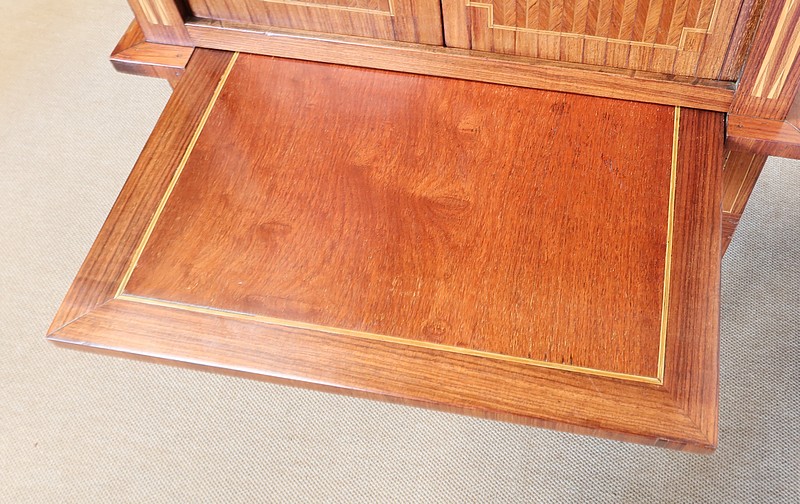On appréciera la finesse des lignes et des marqueteries de ce cabinet 1900, ainsi que sa fonctionnalité. En effet, il conjugue habilement espace de travail et meuble de rangement, tout en étant décoratif.