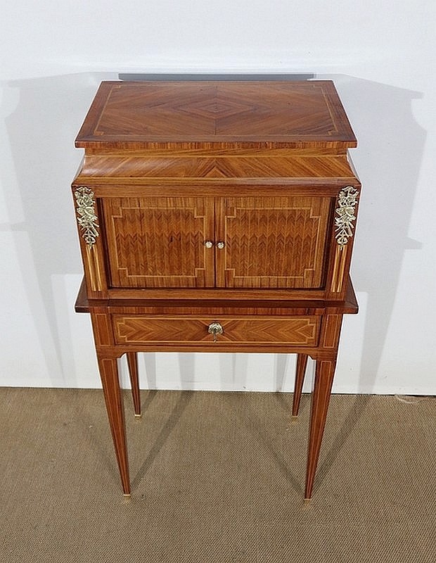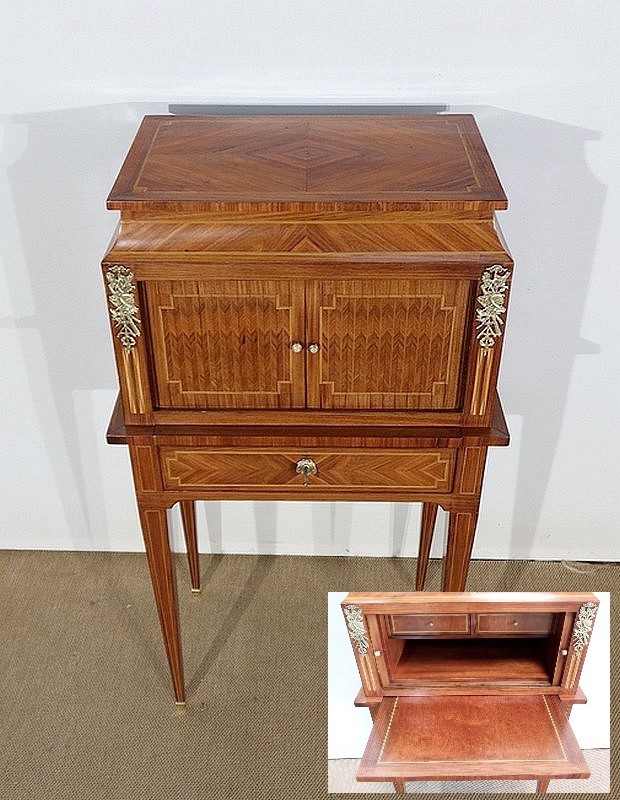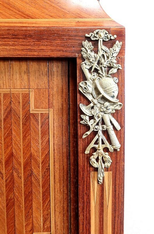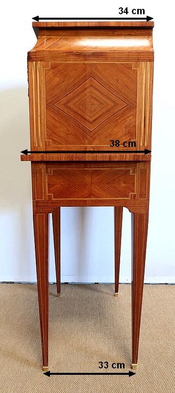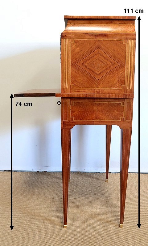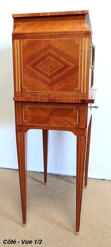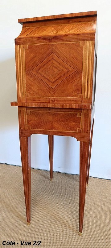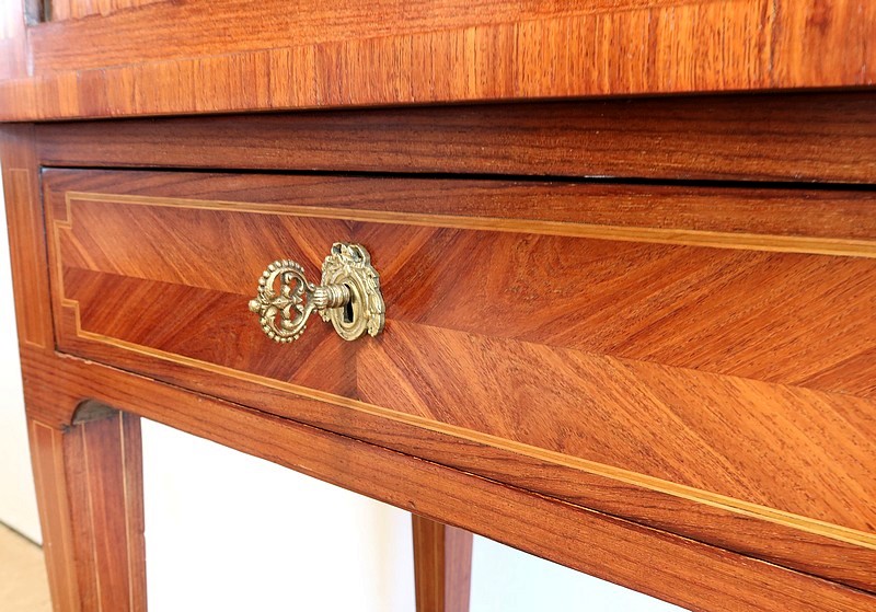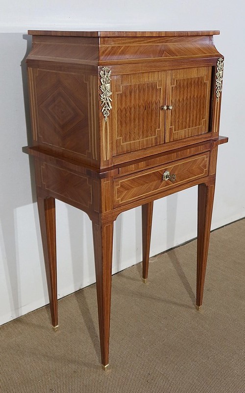 On appréciera la finesse des lignes et des marqueteries de ce cabinet 1900, ainsi que sa fonctionnalité. En effet, il conjugue habilement espace de travail et meuble de rangement, tout en étant décoratif.