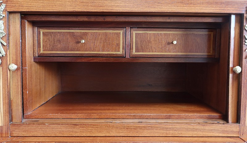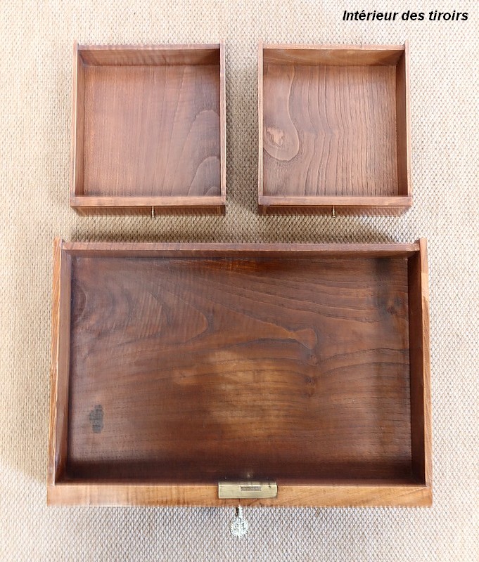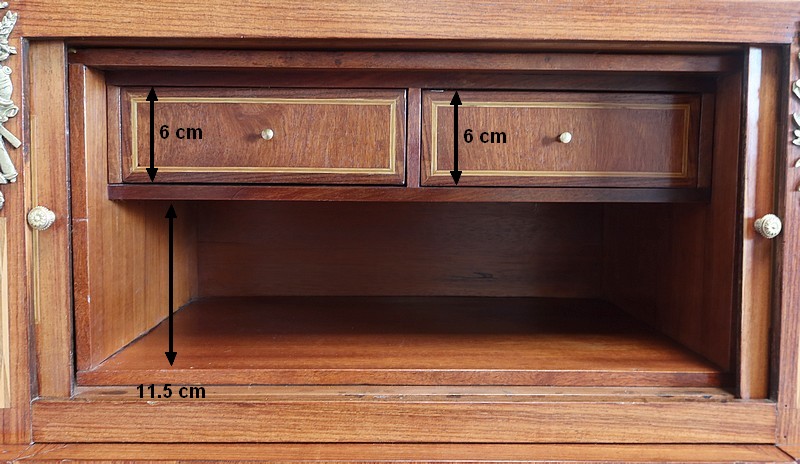 L’intérieur en acajou propose deux tiroirs aux dimensions identiques surplombant une niche.