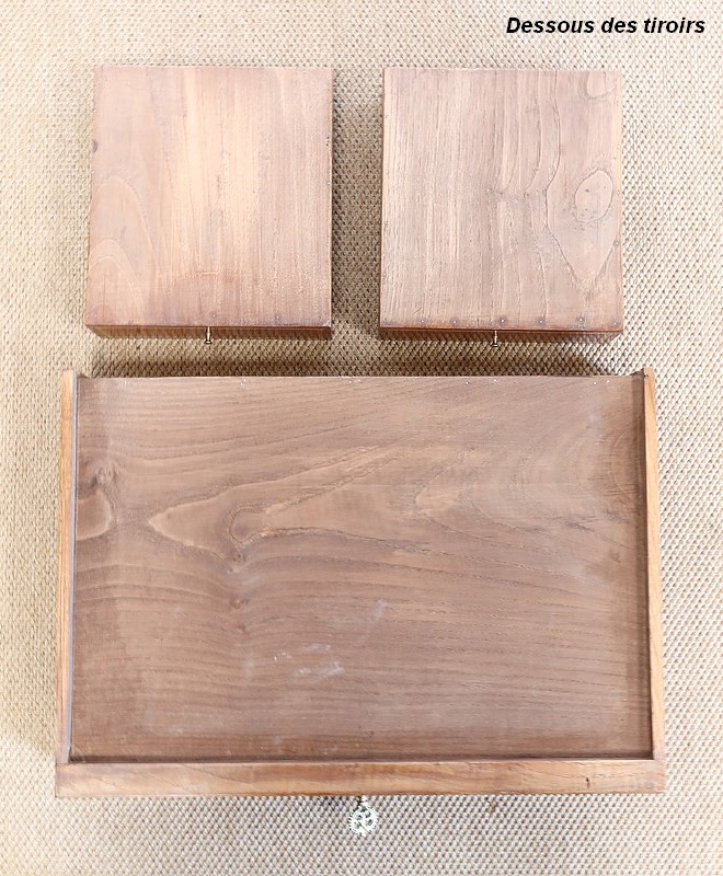 En ceinture, ce cabinet est pourvu d’une tablette rétractable, garnie d’un cuir marron, et ouvre par un troisième tiroir. Ce dernier est équipé d’une entrée ouvragée et d’une serrure en état de fonctionnement, accompagnée de sa clé, le tout d’origine.