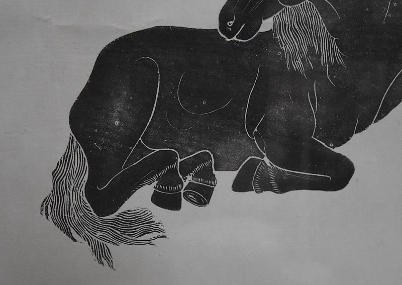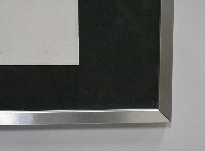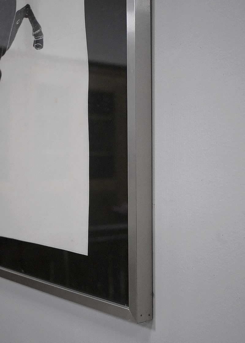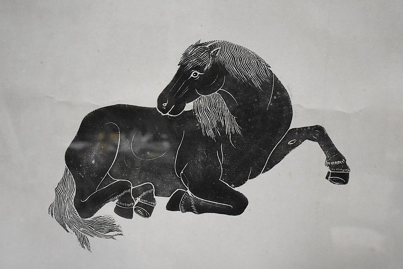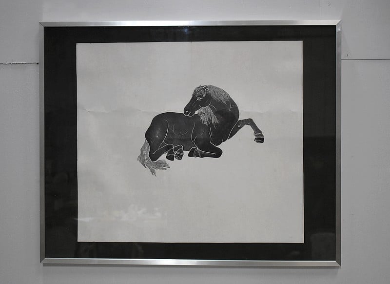 Cadre sous verre en aluminium représentant une jument couchée, sans doute prête à mettre bas.
