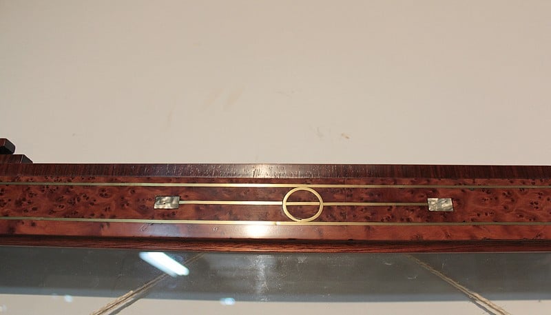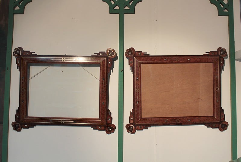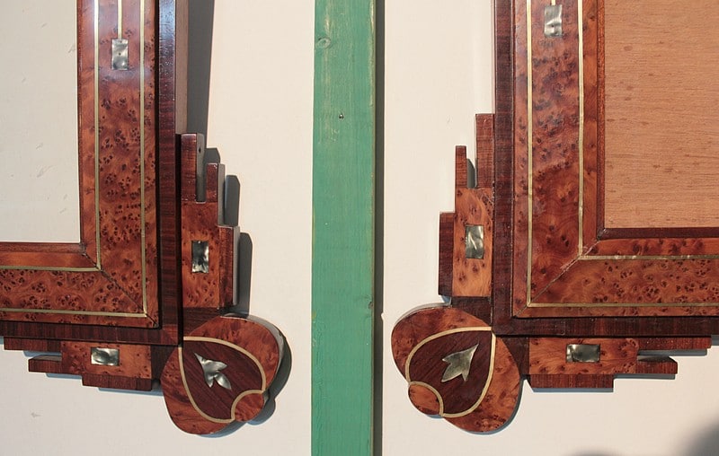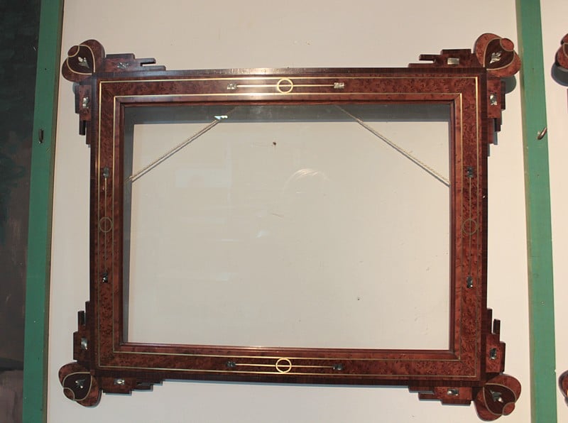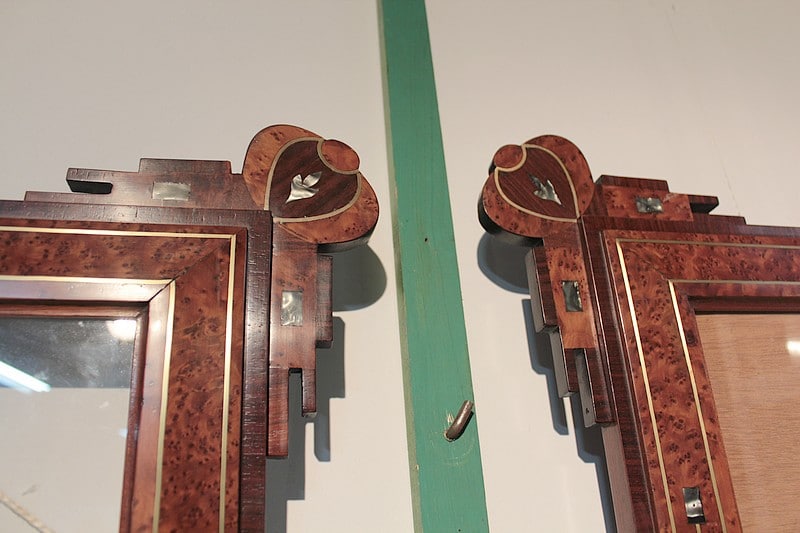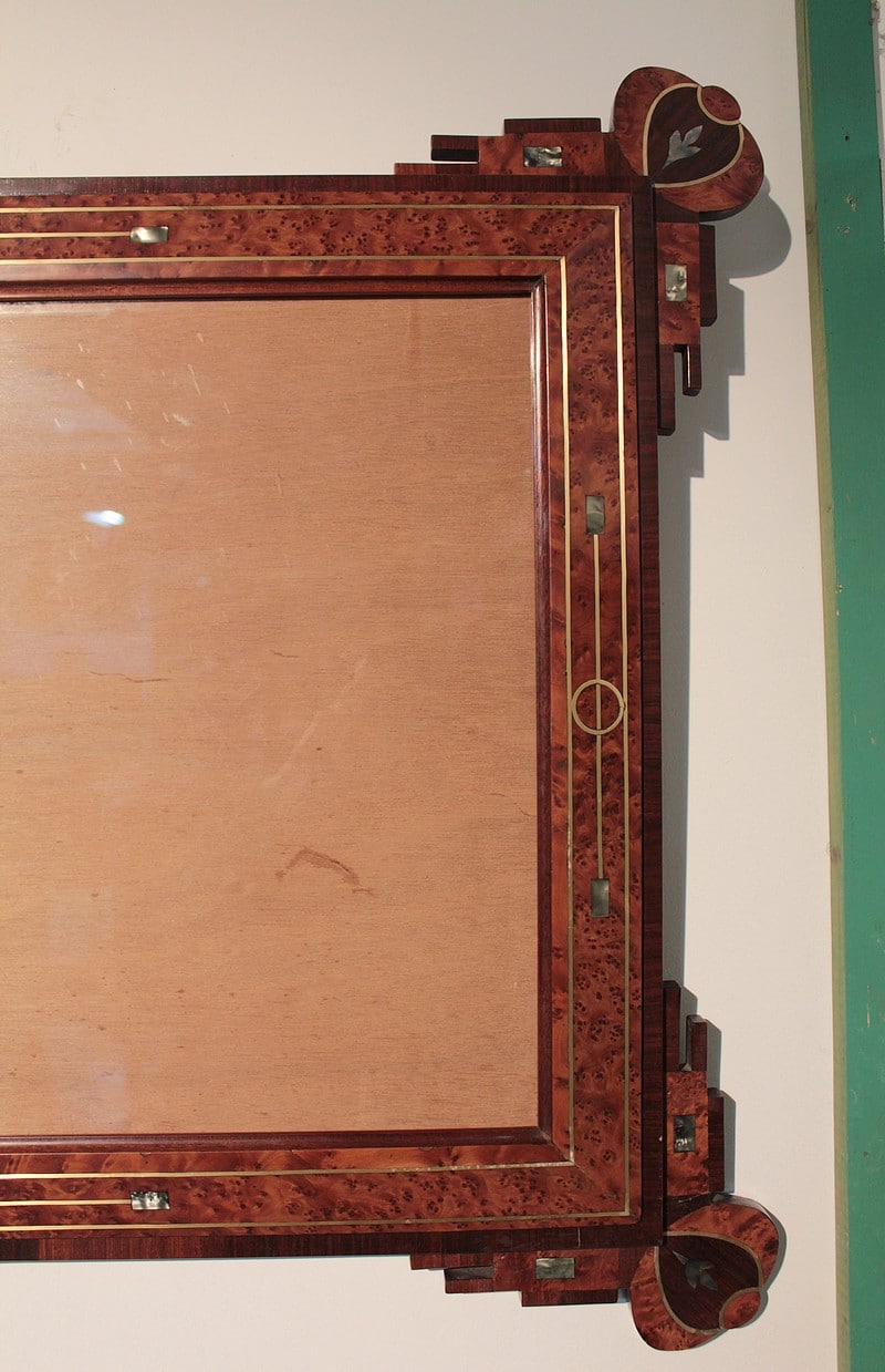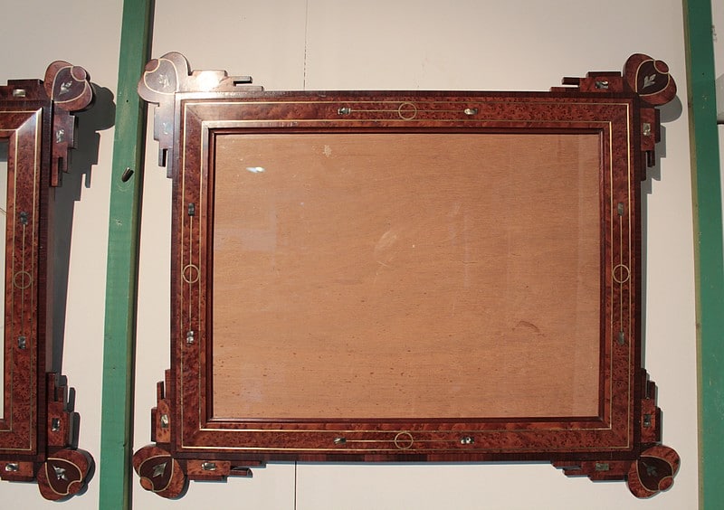 Deux cadres décoratifs, entourage en loupe de thuya agrémenté d’un filet de laiton avec incrustations de nacre. La bordure, ainsi que l’ossature, est en palissandre avec décorations de thuya, palissandre et nacre. La dimension de la gravure est de 57cm x 42cm.