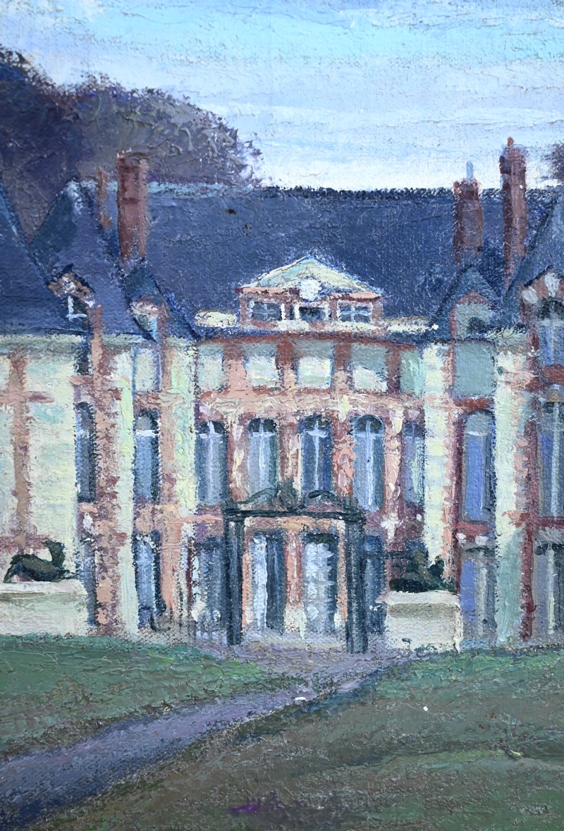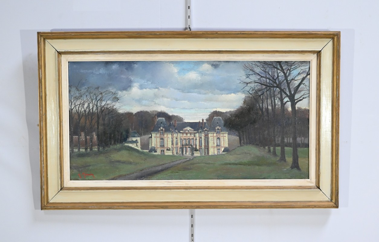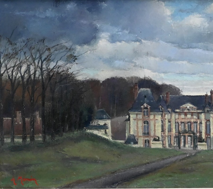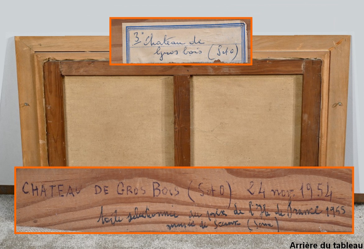 Peinture sur toile intitulée « Château de Gros Bois » signée par Augustin Mémin (1910-1981). Ce peintre français, né à Denin, télégraphiste au PTT de profession, exécuta de nombreuses toiles, durant sa carrière, avec une dextérité qu’on lui reconnaît.
