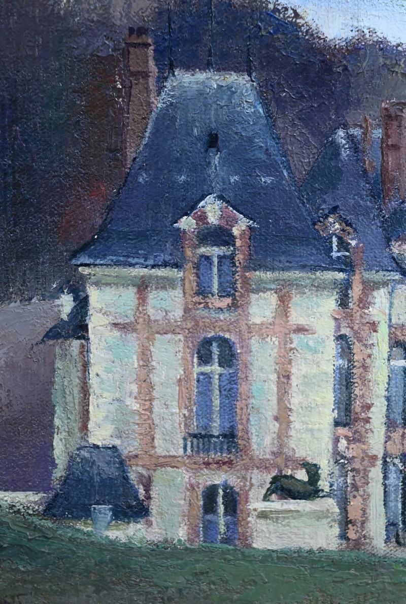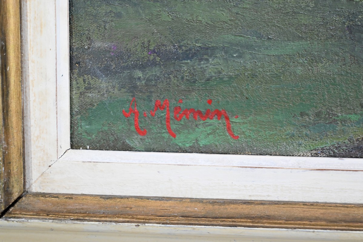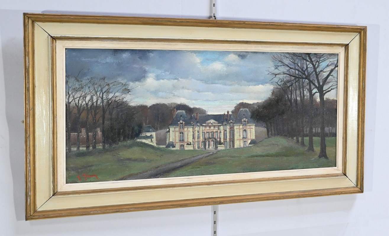 Peinture sur toile intitulée « Château de Gros Bois » signée par Augustin Mémin (1910-1981). Ce peintre français, né à Denin, télégraphiste au PTT de profession, exécuta de nombreuses toiles, durant sa carrière, avec une dextérité qu’on lui reconnaît.