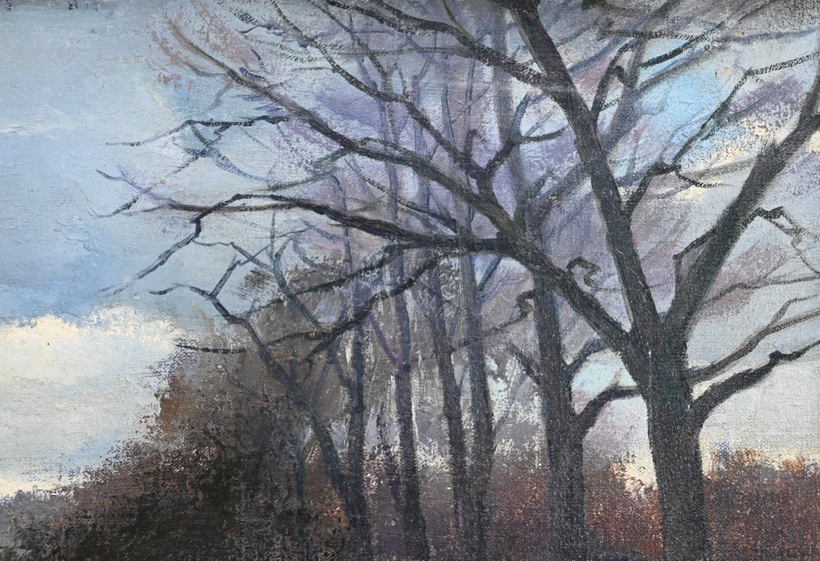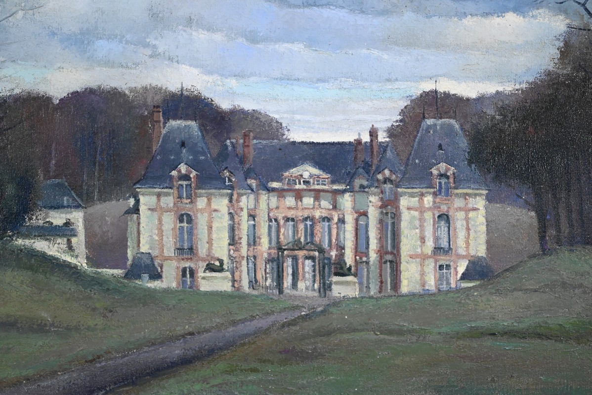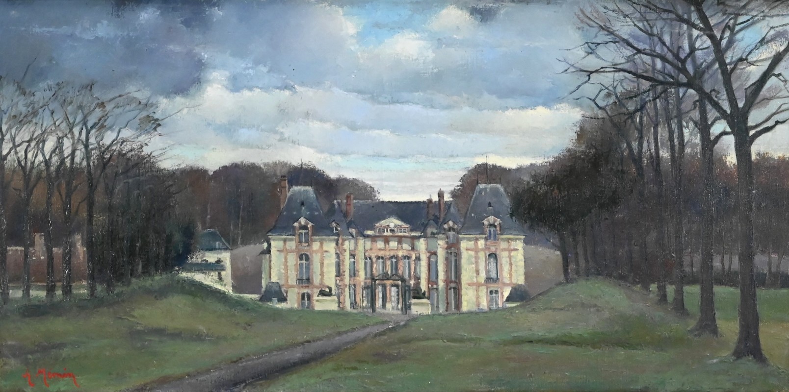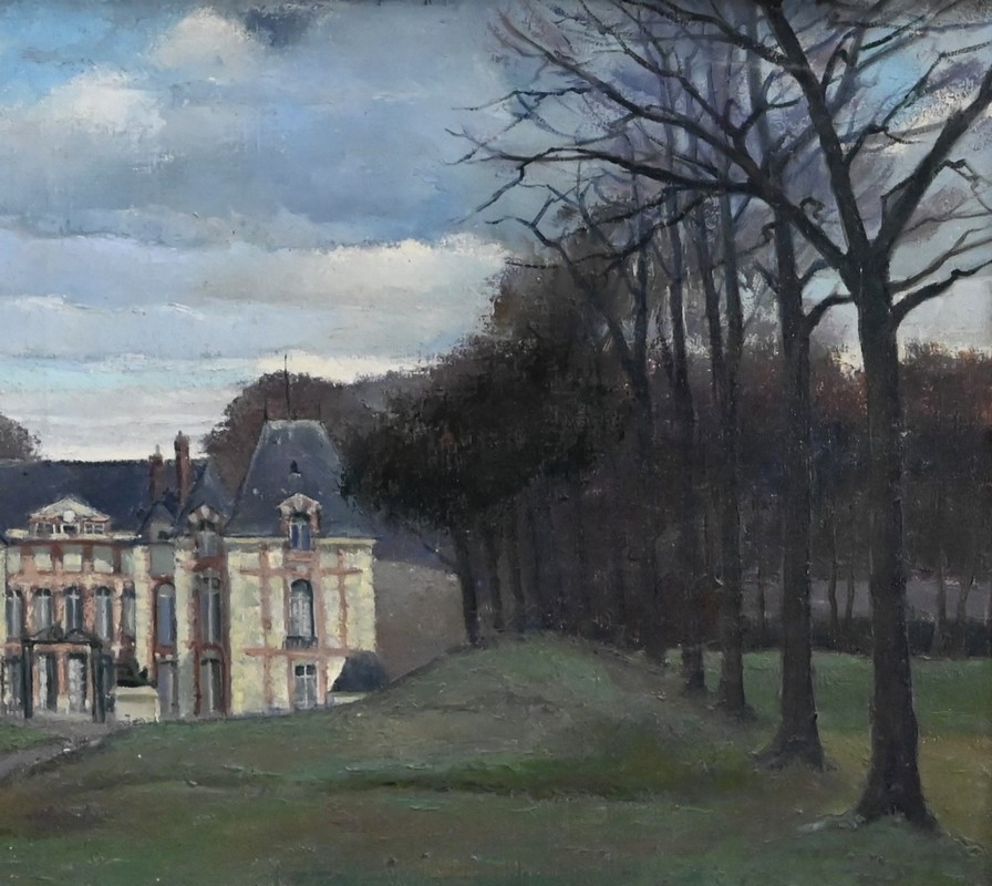 Cette œuvre représente le Château de Gros Bois, classé au patrimoine, situé à Boissy-Saint-Léger. On y voit la façade principale du bâtiment et les parties boisées de la propriété. Les arbres dépourvus de toute feuille semblent s’être figés sous un ciel d’hiver chargé de nuages.