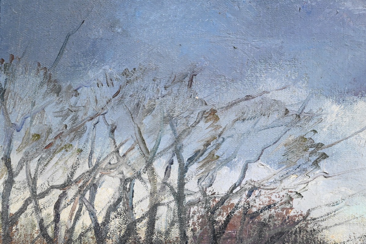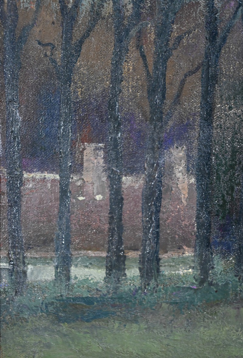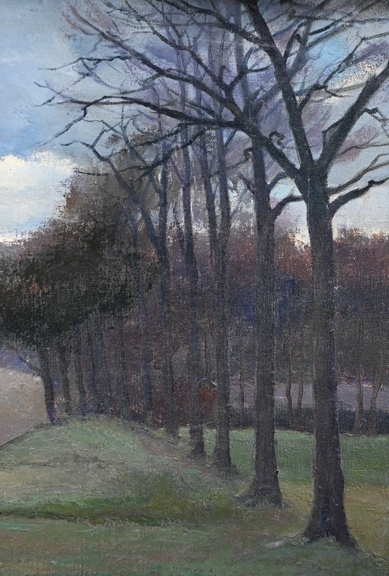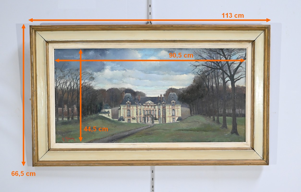 Cette œuvre représente le Château de Gros Bois, classé au patrimoine, situé à Boissy-Saint-Léger. On y voit la façade principale du bâtiment et les parties boisées de la propriété. Les arbres dépourvus de toute feuille semblent s’être figés sous un ciel d’hiver chargé de nuages.