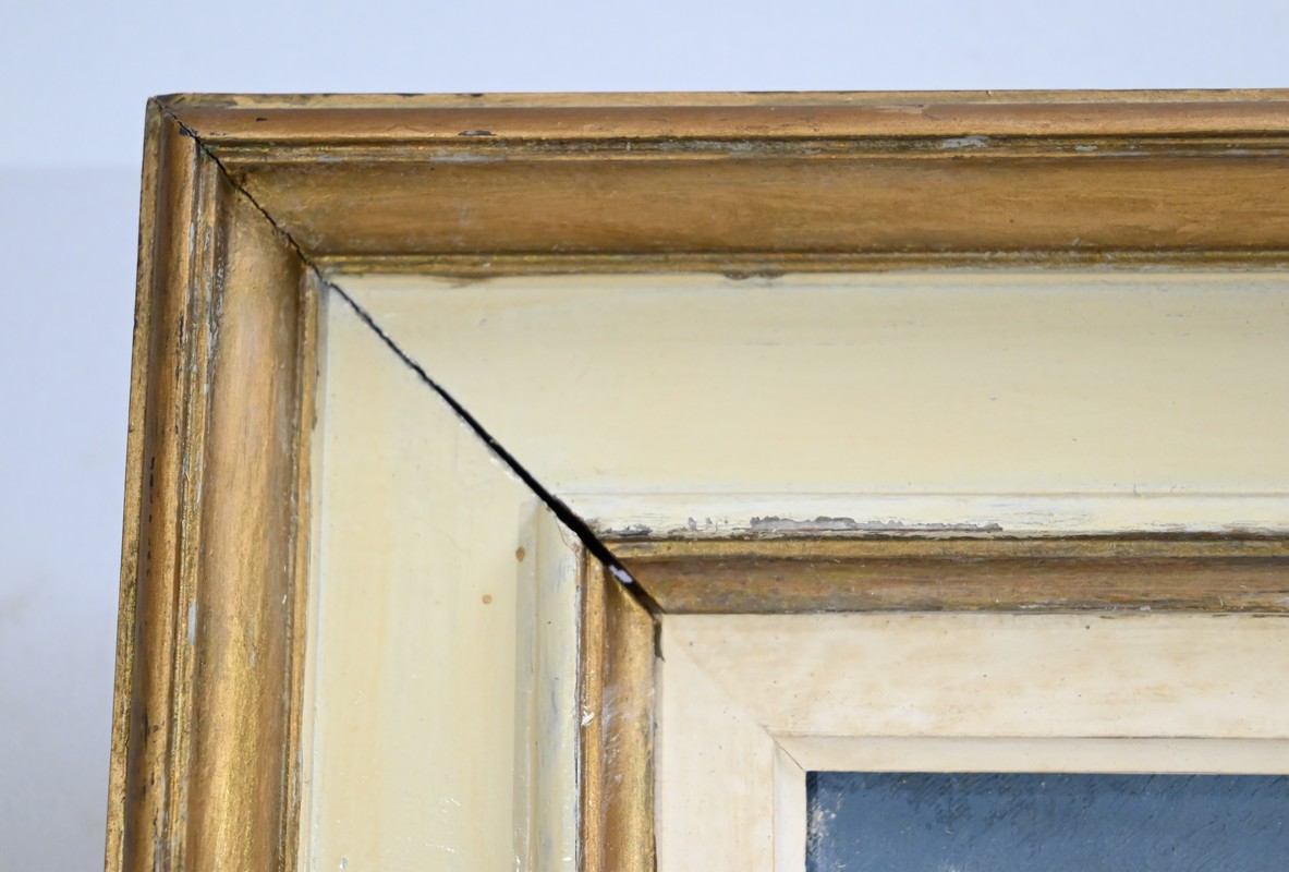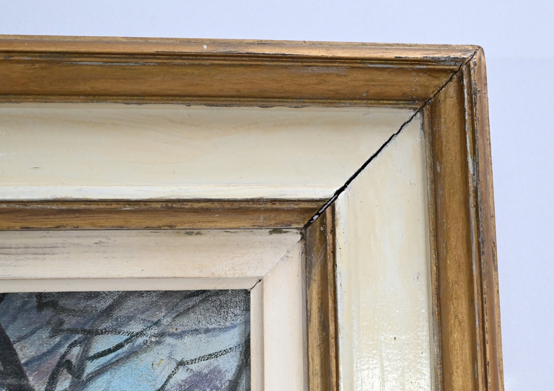 Cette toile, sélectionnée au prix de l’Île-de-France en 1955, est joliment mise en valeur par un cadre en bois de couleur beige et doré.