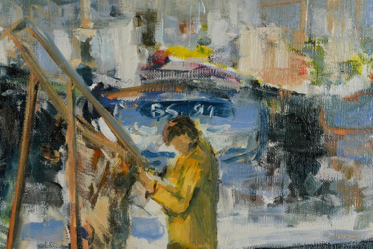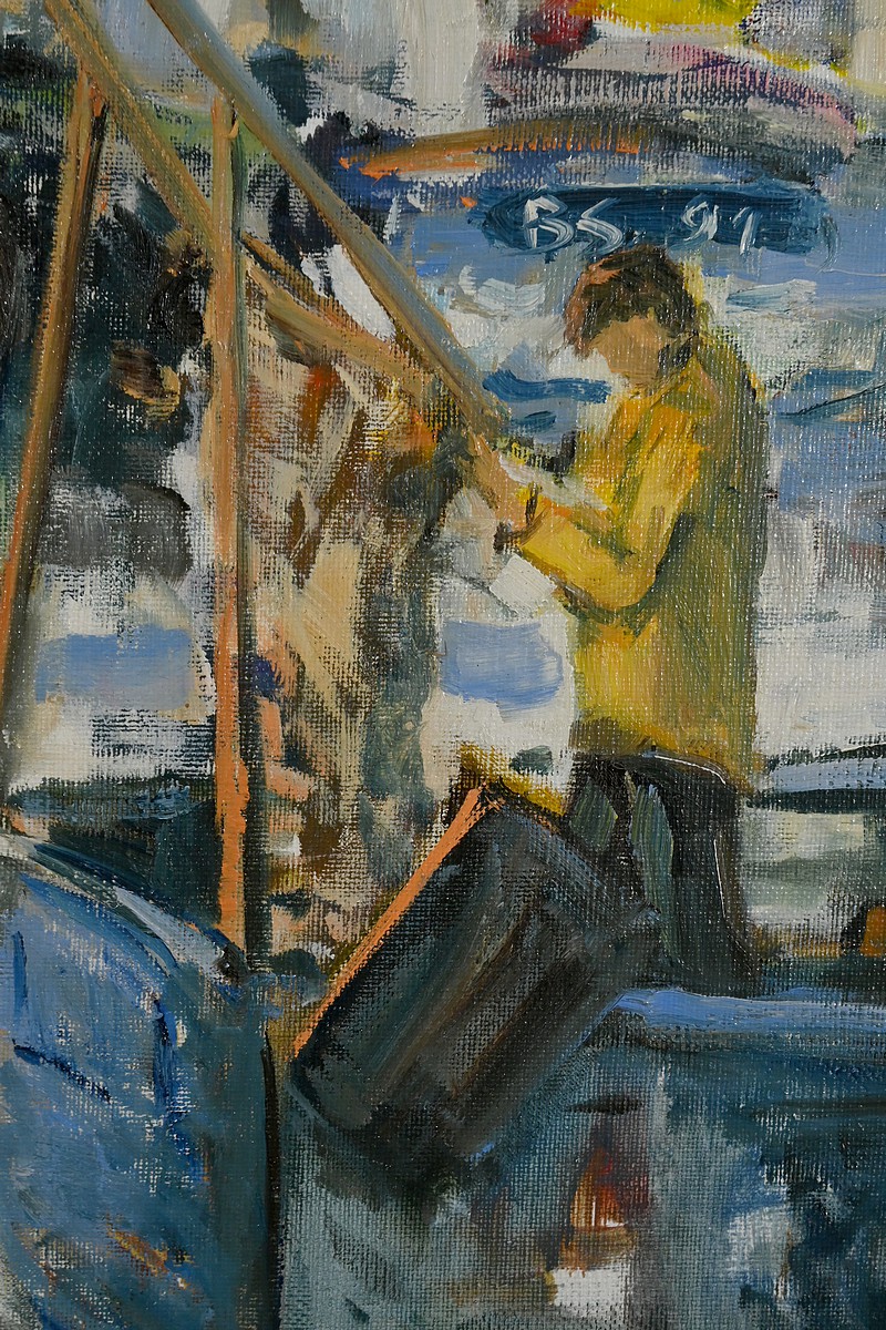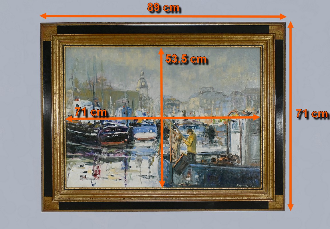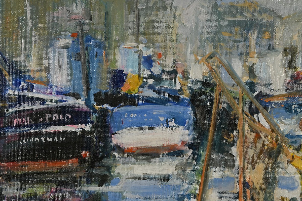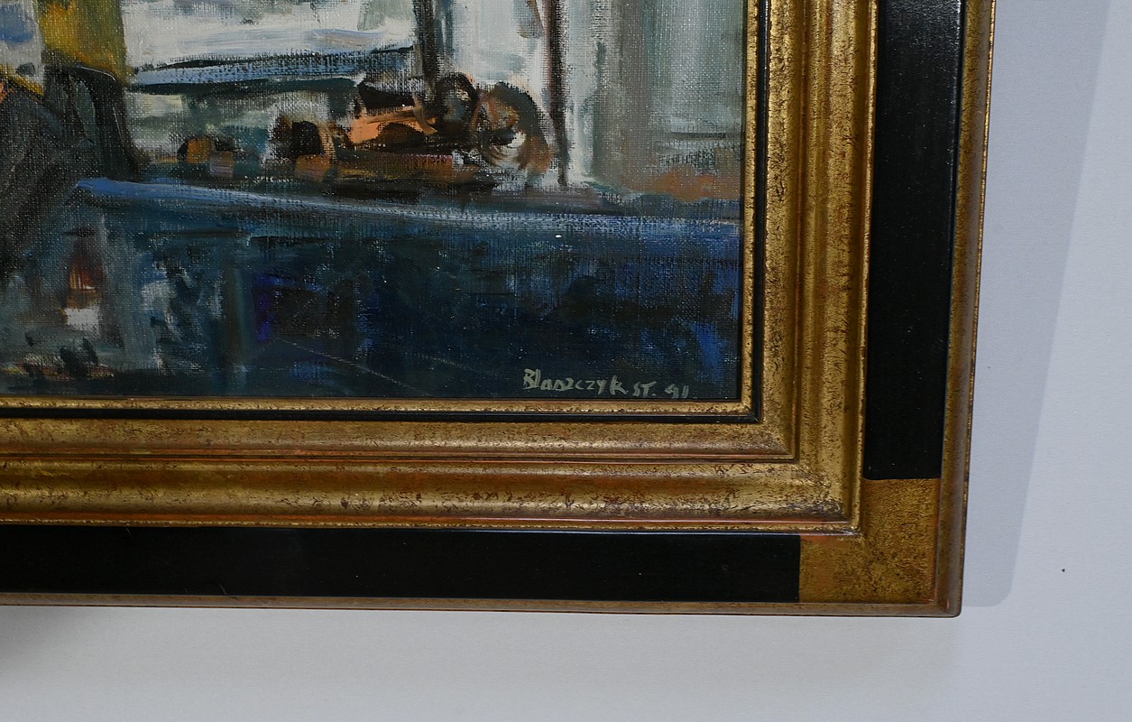 Belle peinture Marine figurant une scène portuaire à Concarneau. On y voit plusieurs bateaux amarrés, avec des bâtiments en arrière-plan. Les couleurs sont principalement des nuances de bleu, gris et blanc, avec quelques touches de jaune et rouge. Un personnage en ciré jaune et casquette est visible au premier plan, ce pêcheur travaille sur un des bateaux. L’atmosphère est brumeuse, suggérant un matin nuageux. Le cadre mouluré du tableau est doré et laqué de noir. Le nom de l’artiste et la date : « Blaszczyk St. 91 », sont visibles en bas à droite du tableau.