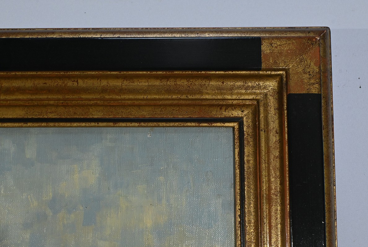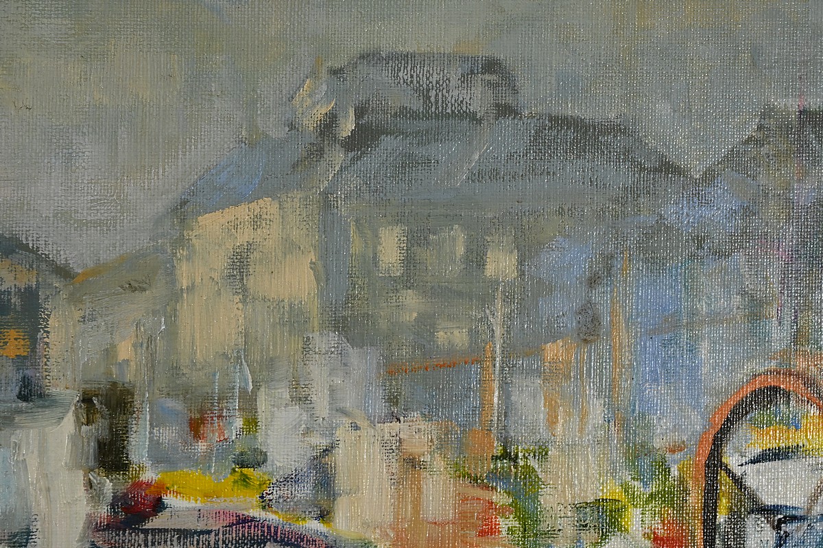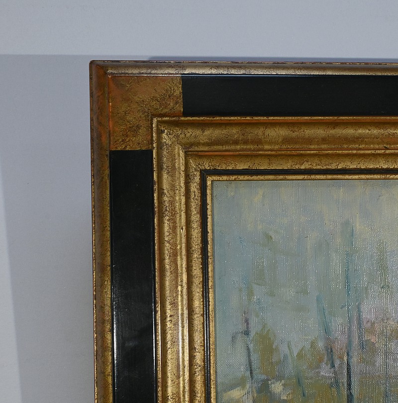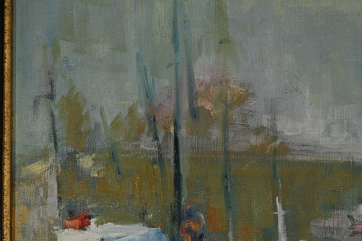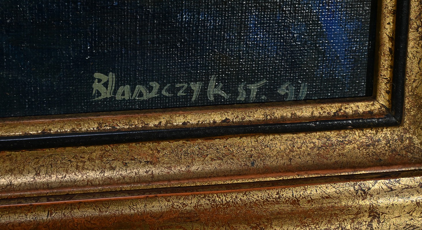 Belle peinture Marine figurant une scène portuaire à Concarneau. On y voit plusieurs bateaux amarrés, avec des bâtiments en arrière-plan. Les couleurs sont principalement des nuances de bleu, gris et blanc, avec quelques touches de jaune et rouge. Un personnage en ciré jaune et casquette est visible au premier plan, ce pêcheur travaille sur un des bateaux. L’atmosphère est brumeuse, suggérant un matin nuageux. Le cadre mouluré du tableau est doré et laqué de noir. Le nom de l’artiste et la date : « Blaszczyk St. 91 », sont visibles en bas à droite du tableau.