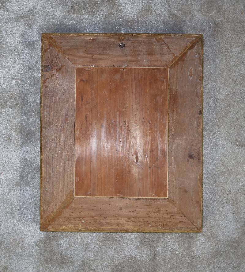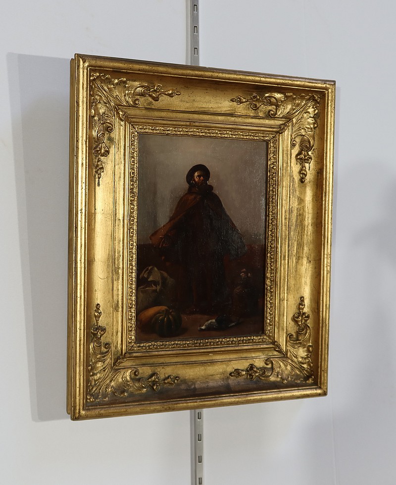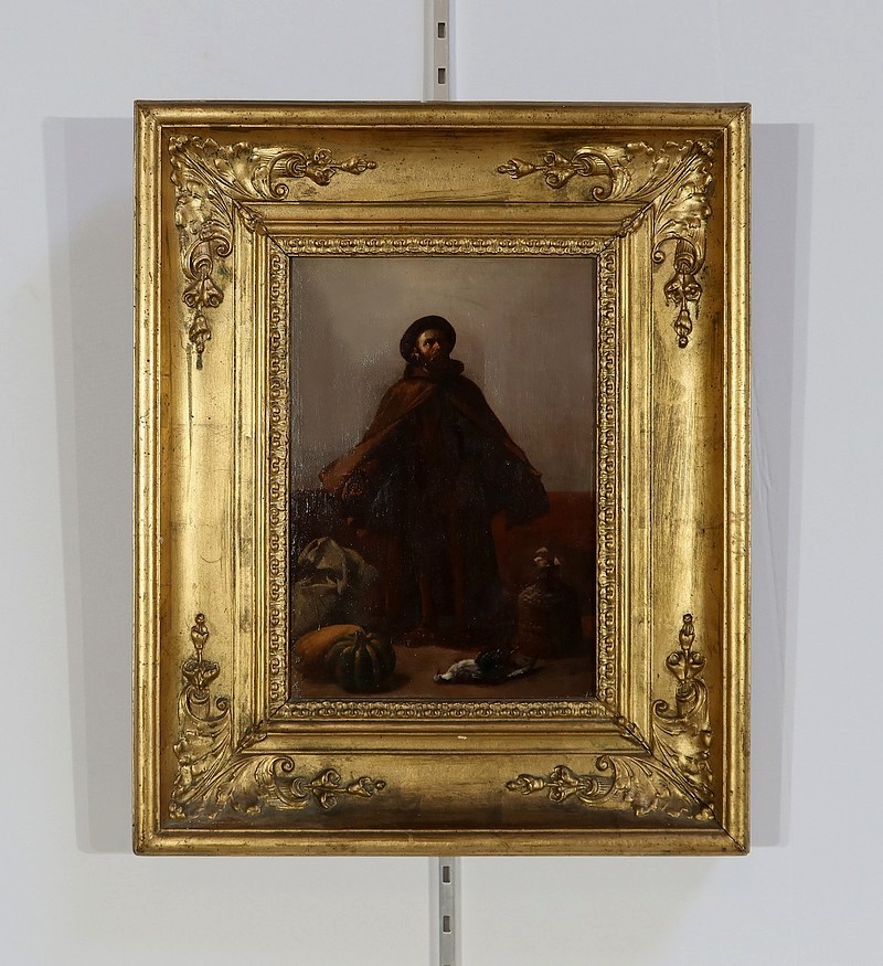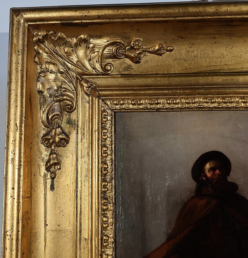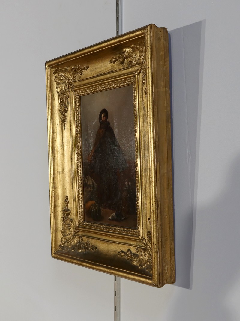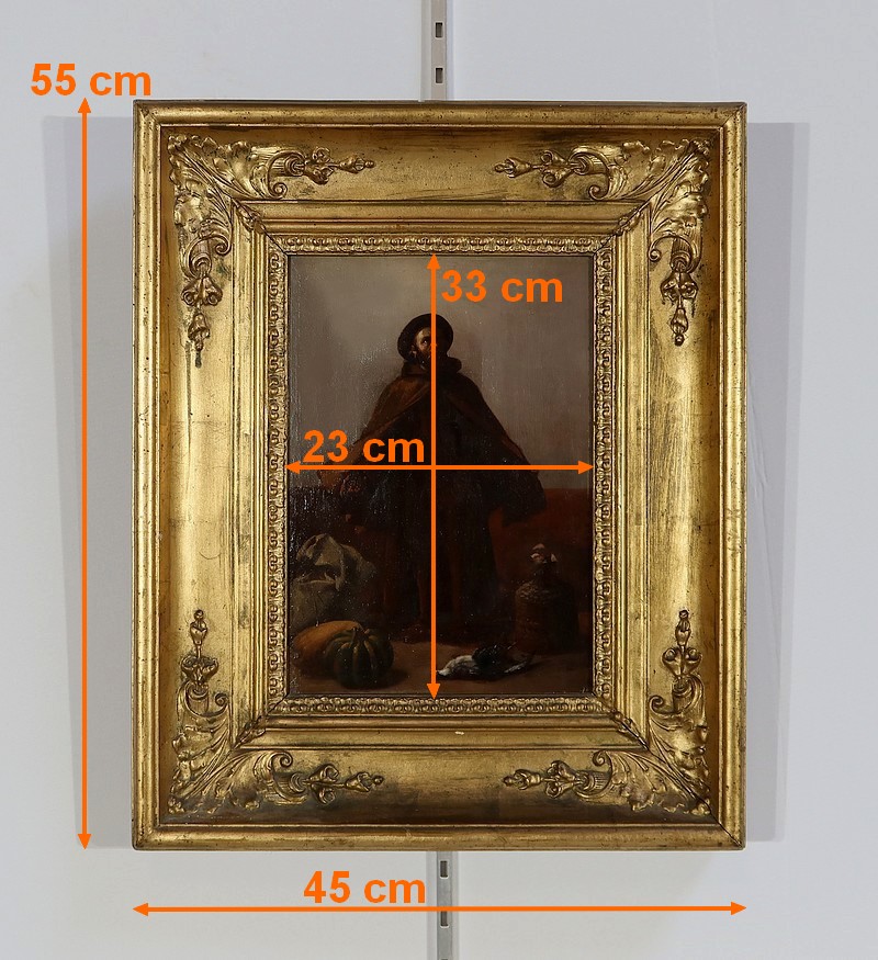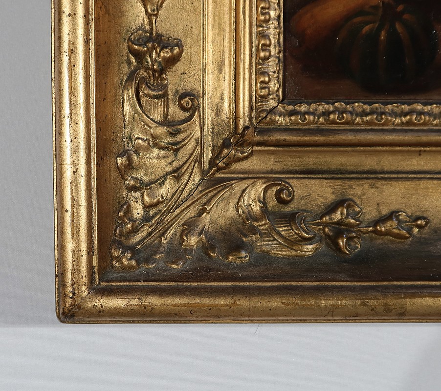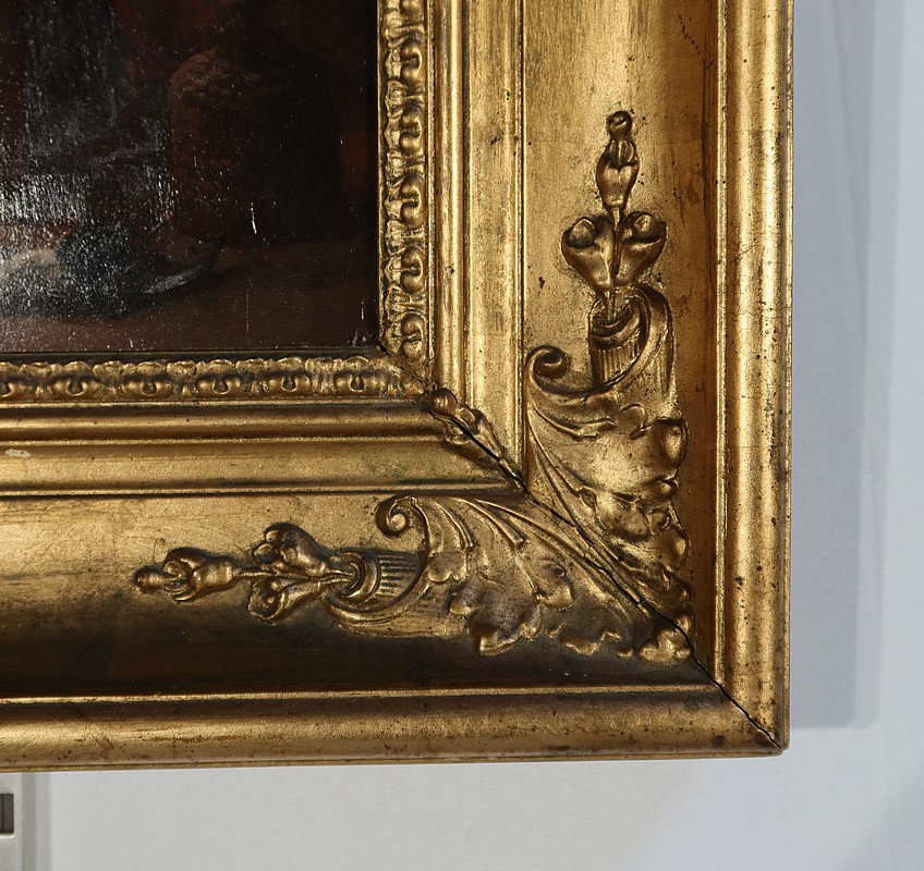 Entourant la toile, un magnifique cadre sculpté en bois doré s’accorde parfaitement à cette scène. Riche en ornementations, il présente des moulures stylisées et des sculptures formant des arabesques et des volutes dans ses quatre angles.
