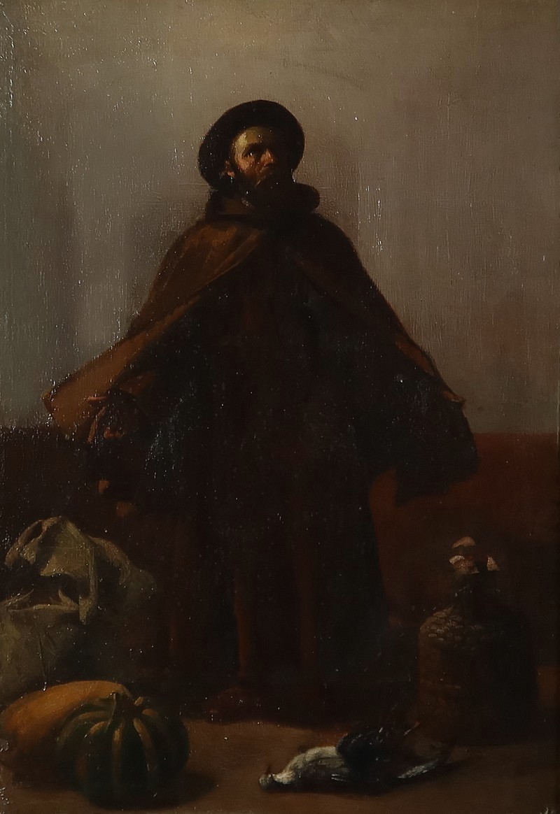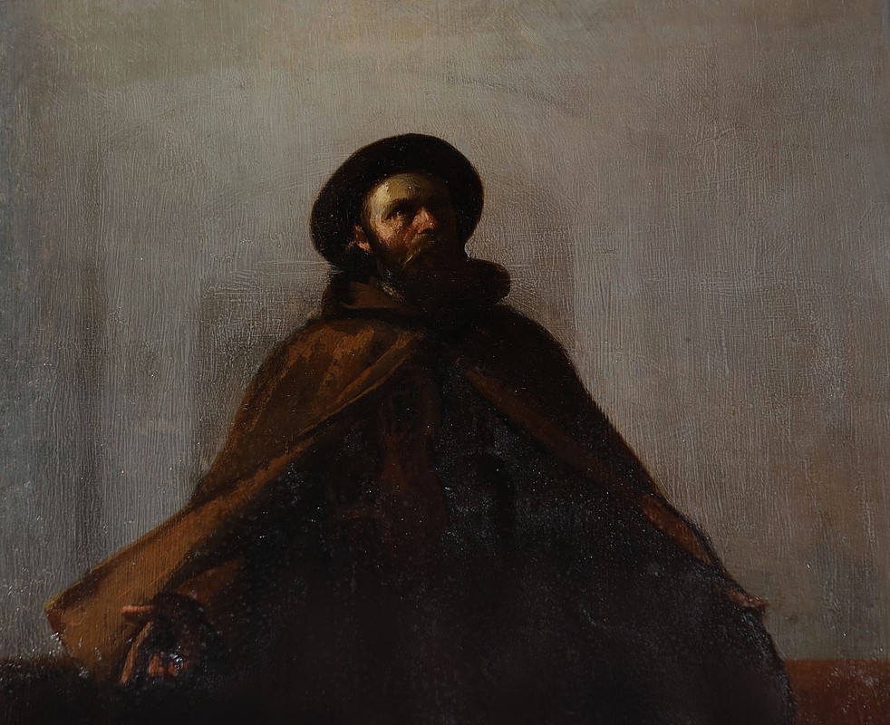 Il porte un chapeau et revêt une cape à capuche sur sa robe épaisse.