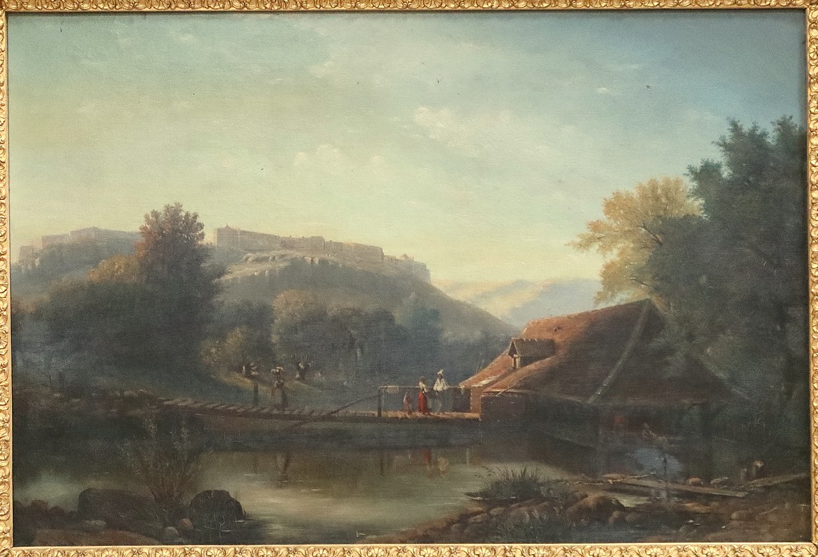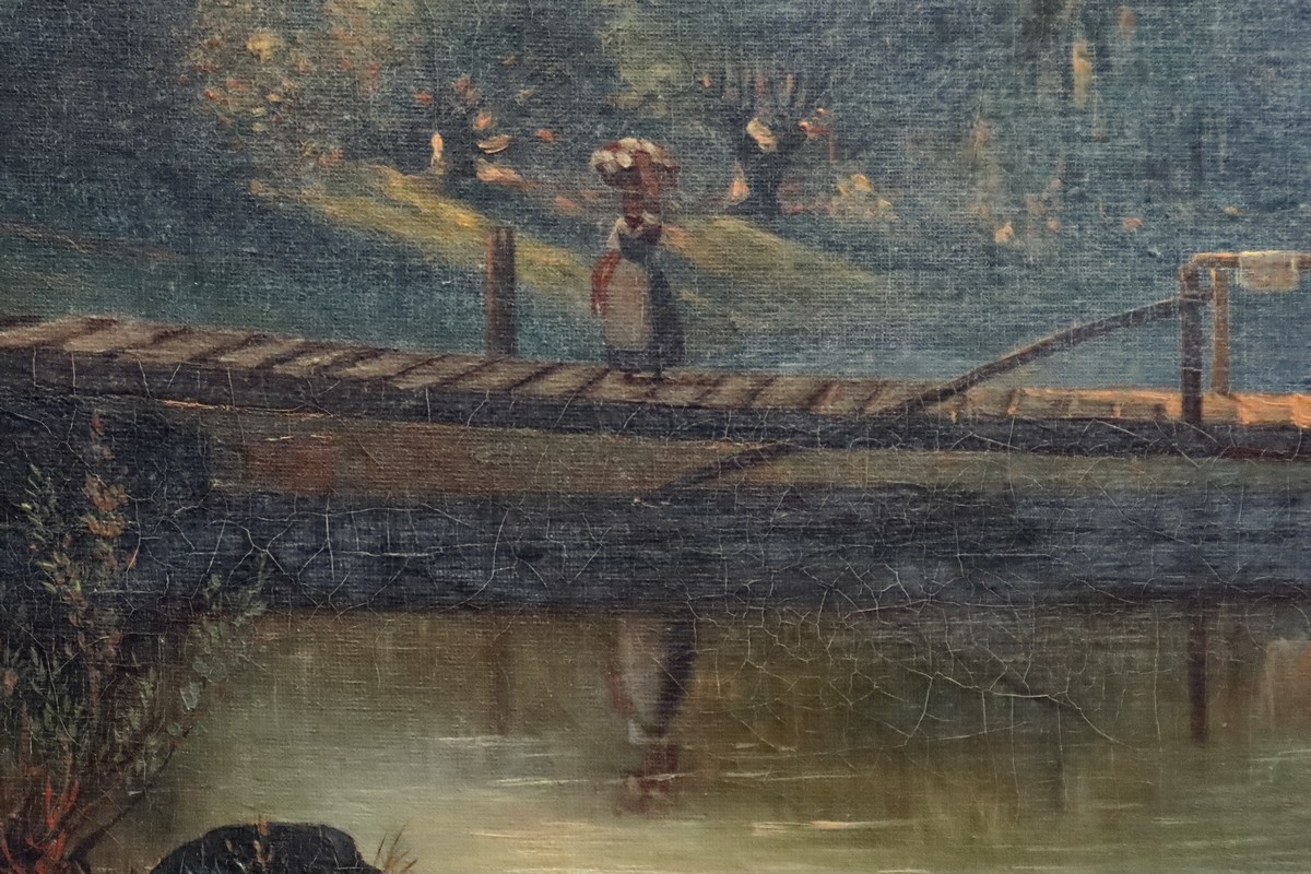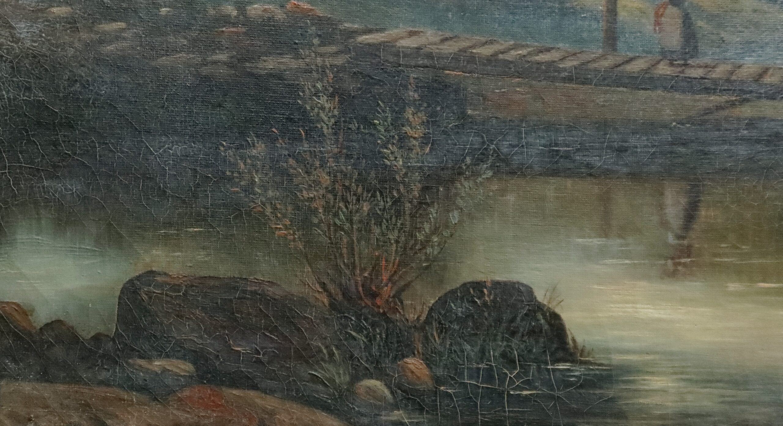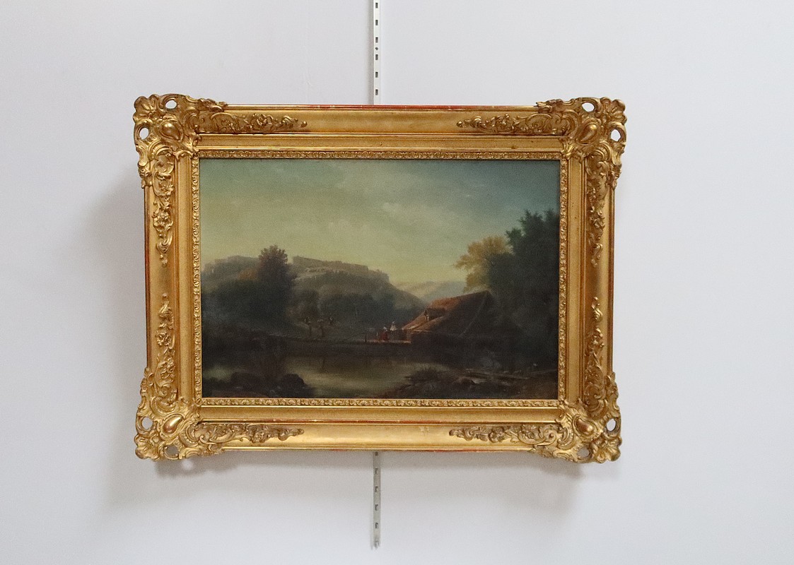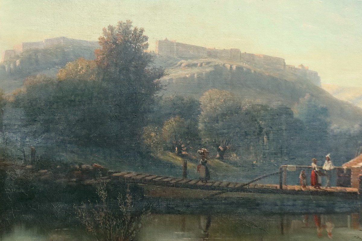 Belle huile sur toile représentant un lavoir traversé d’une rivière et relié à la berge par un petit pont en bois. En arrière plan, nous découvrons un paysage vallonné surplombé d’une cité entourée de remparts dont les formes surgissent au loin. La vallée est foisonnante de végétation. Des arbres en dégradés de verts apparaissent en clair-obscur. En effet, le soleil termine sa course et commence à assombrir la scène. Le ponton rejoignant le lavoir est traversé par plusieurs personnages : une femme portant une panière remplie de linge sur sa tête, une enfant touchant l’eau de son bâton et enfin une autre femme discutant avec un homme. Leurs habits traditionnels datent du XIXe ou XVIIIe siècles. Dans le lavoir, nous observons une femme portant une coiffe, lavant son linge.