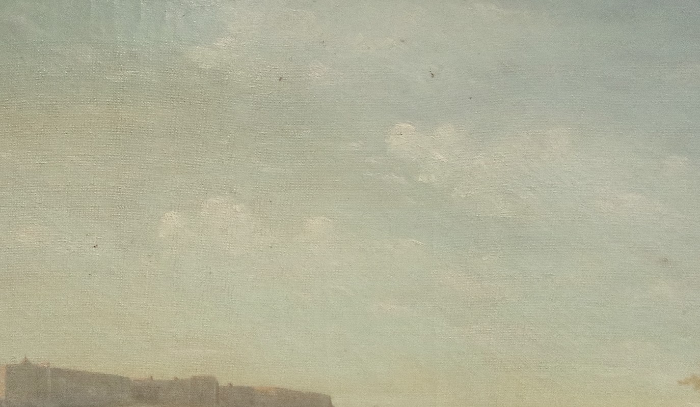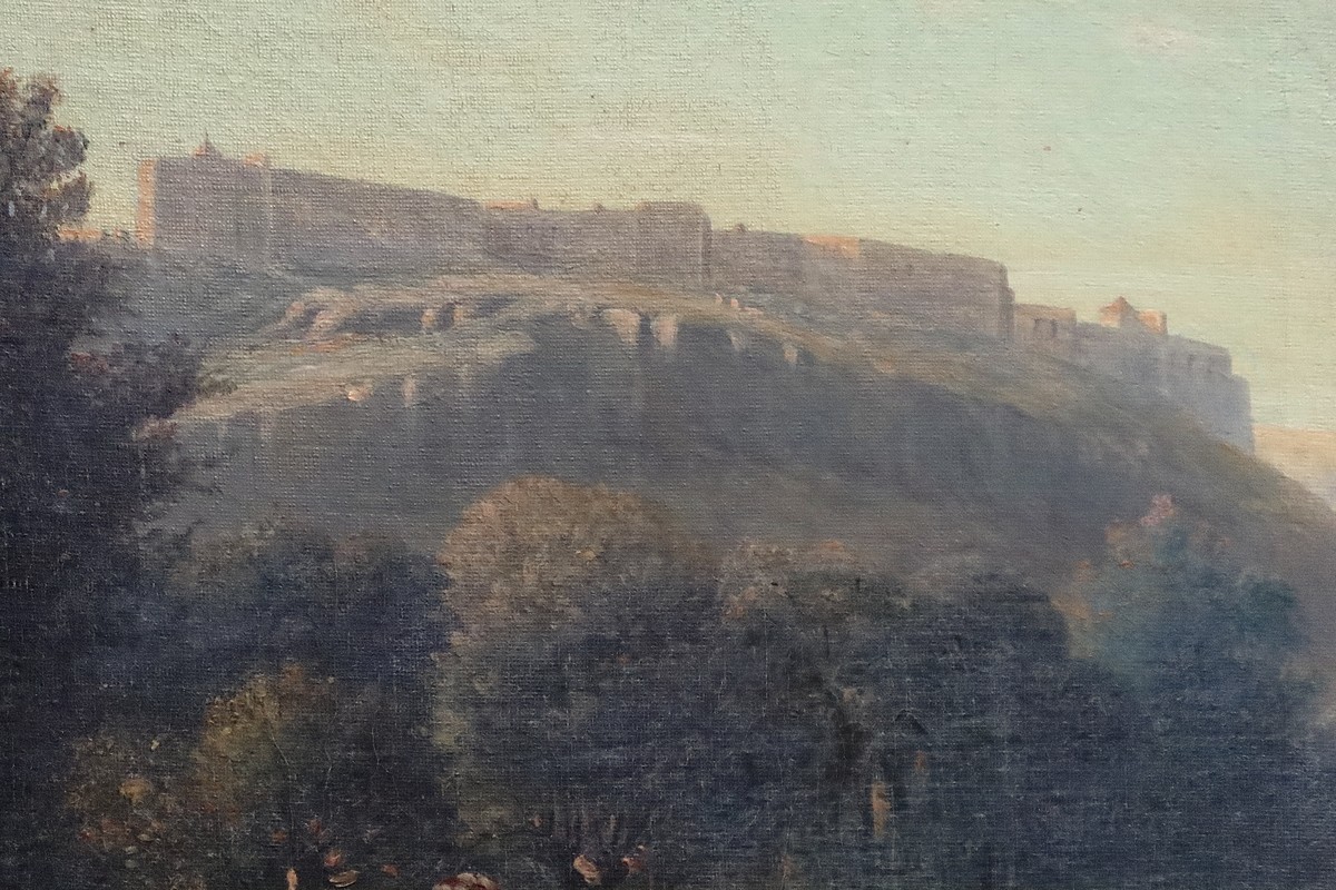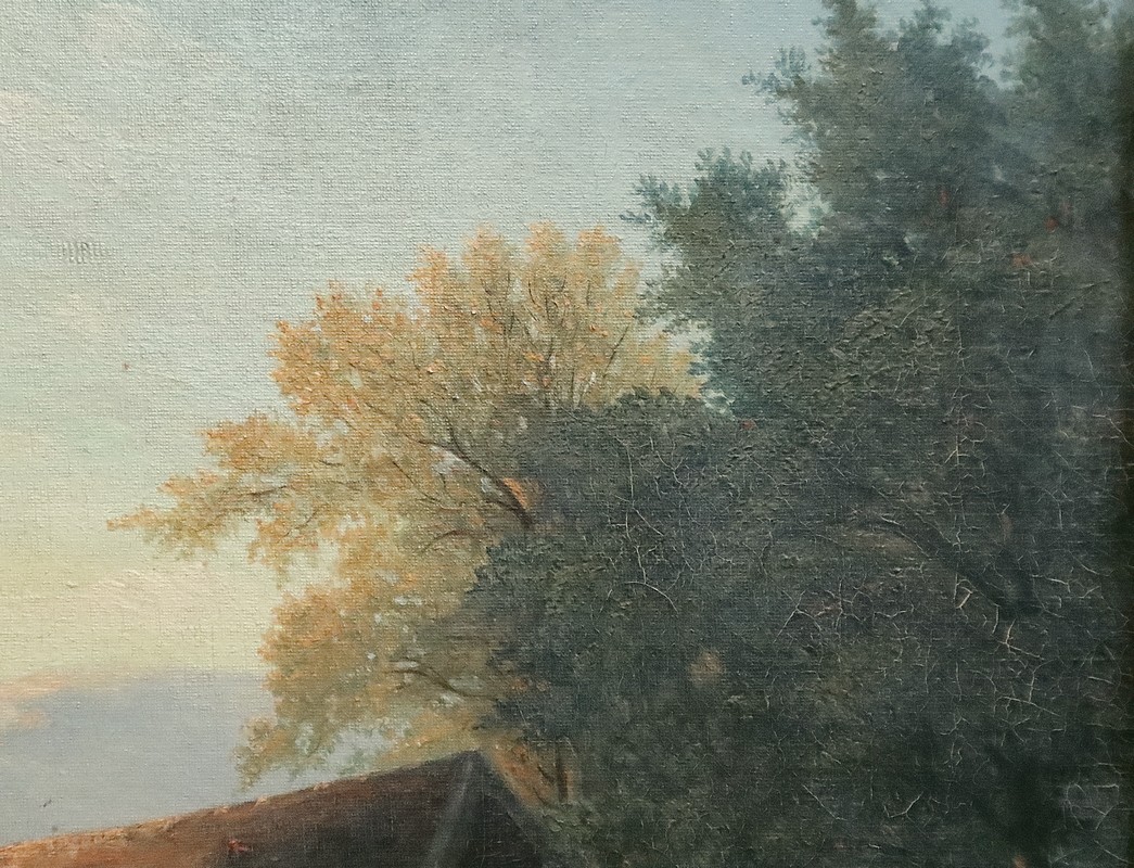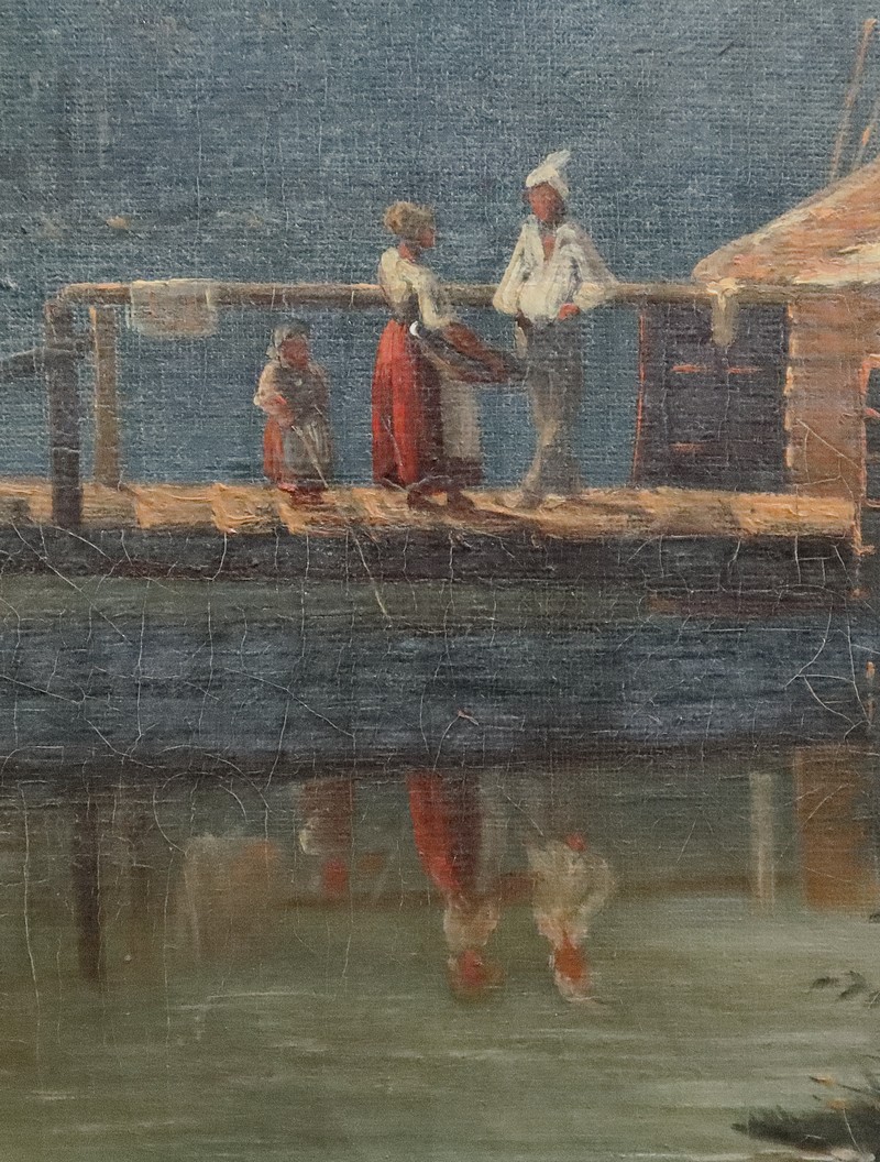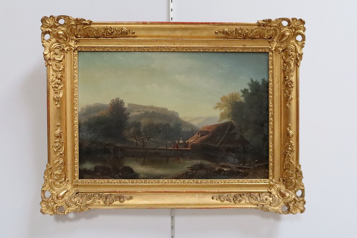 Belle huile sur toile représentant un lavoir traversé d’une rivière et relié à la berge par un petit pont en bois. En arrière plan, nous découvrons un paysage vallonné surplombé d’une cité entourée de remparts dont les formes surgissent au loin. La vallée est foisonnante de végétation. Des arbres en dégradés de verts apparaissent en clair-obscur. En effet, le soleil termine sa course et commence à assombrir la scène. Le ponton rejoignant le lavoir est traversé par plusieurs personnages : une femme portant une panière remplie de linge sur sa tête, une enfant touchant l’eau de son bâton et enfin une autre femme discutant avec un homme. Leurs habits traditionnels datent du XIXe ou XVIIIe siècles. Dans le lavoir, nous observons une femme portant une coiffe, lavant son linge.