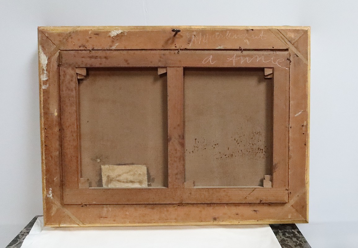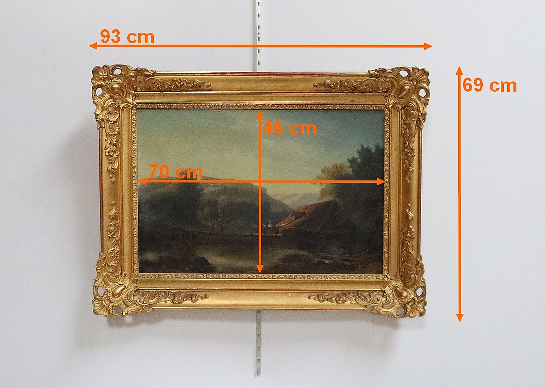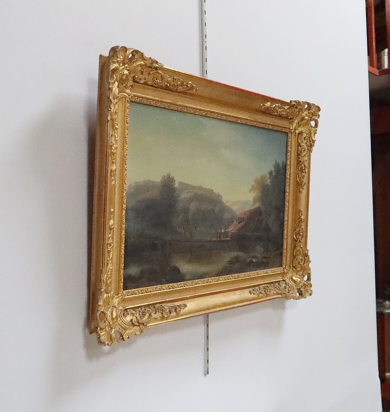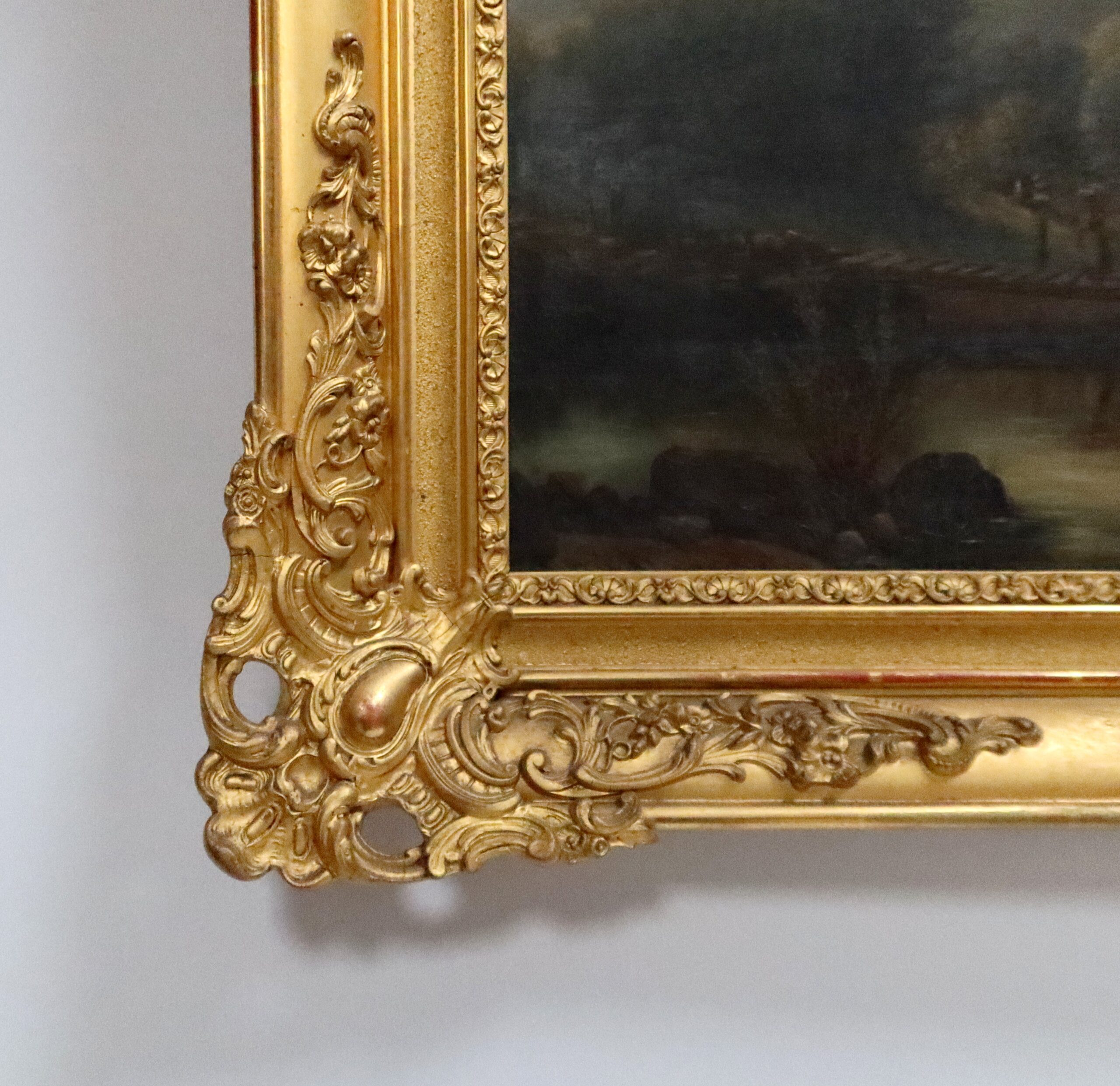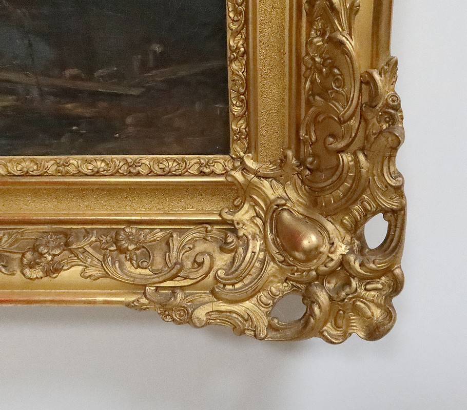 Entourant la toile, un magnifique cadre sculpté en bois doré s’accorde parfaitement à cette scène bucolique. Riche en ornementations sur ses quatre angles, il présente également des moulures stylisées richement ciselées.