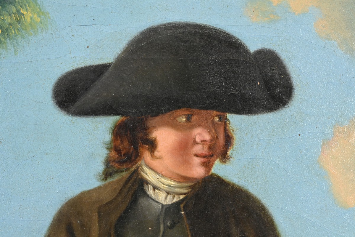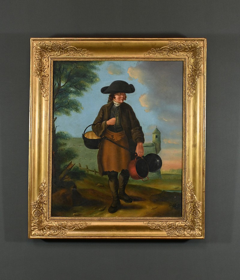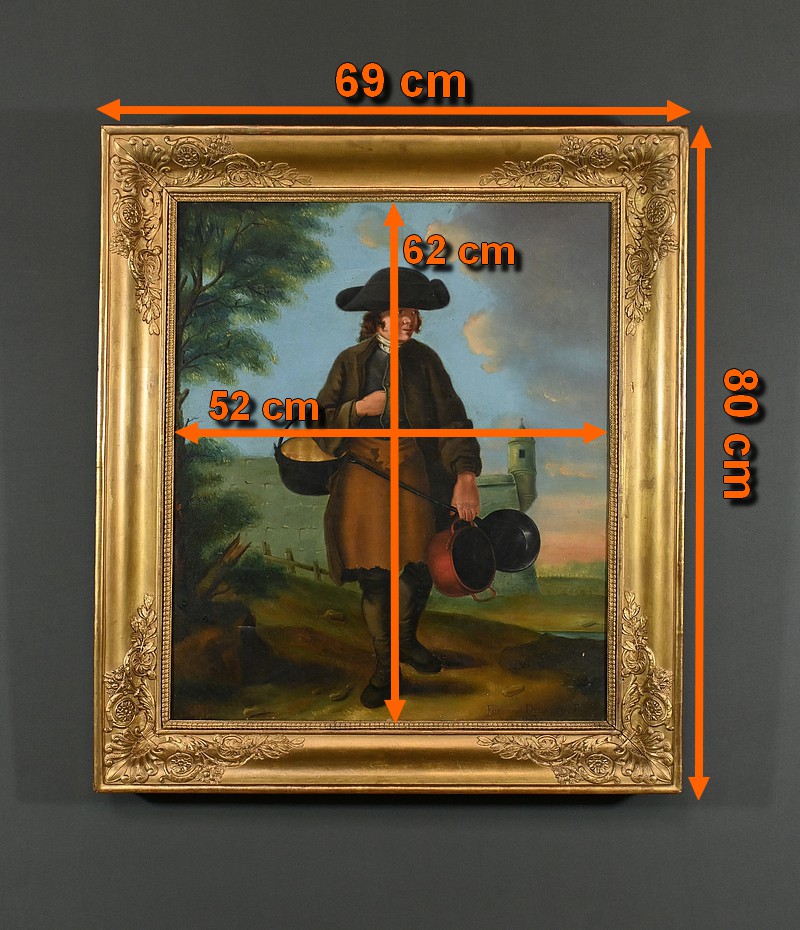 Grand tableau réalisé pendant le règne de Louis XVIII, représentant un rétameur au milieu d’une scène rurale et pittoresque. Vêtu de vêtements traditionnels et portant un large chapeau, l’homme se tient debout regard au loin, tenant des casseroles dans ses mains. L’arrière-plan montre un paysage champêtre avec un arbre verdoyant et une tour en pierre, sous un ciel bleu parsemé de nuages. Cette peinture, avec ses détails minutieux et son ambiance bucolique, évoque une époque révolue et un métier aujourd’hui disparu.